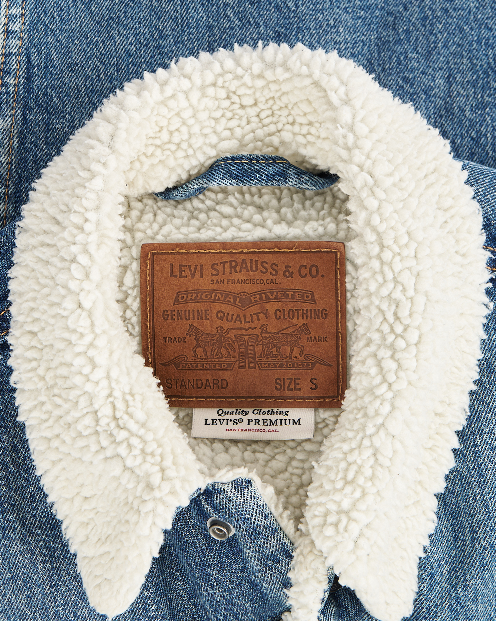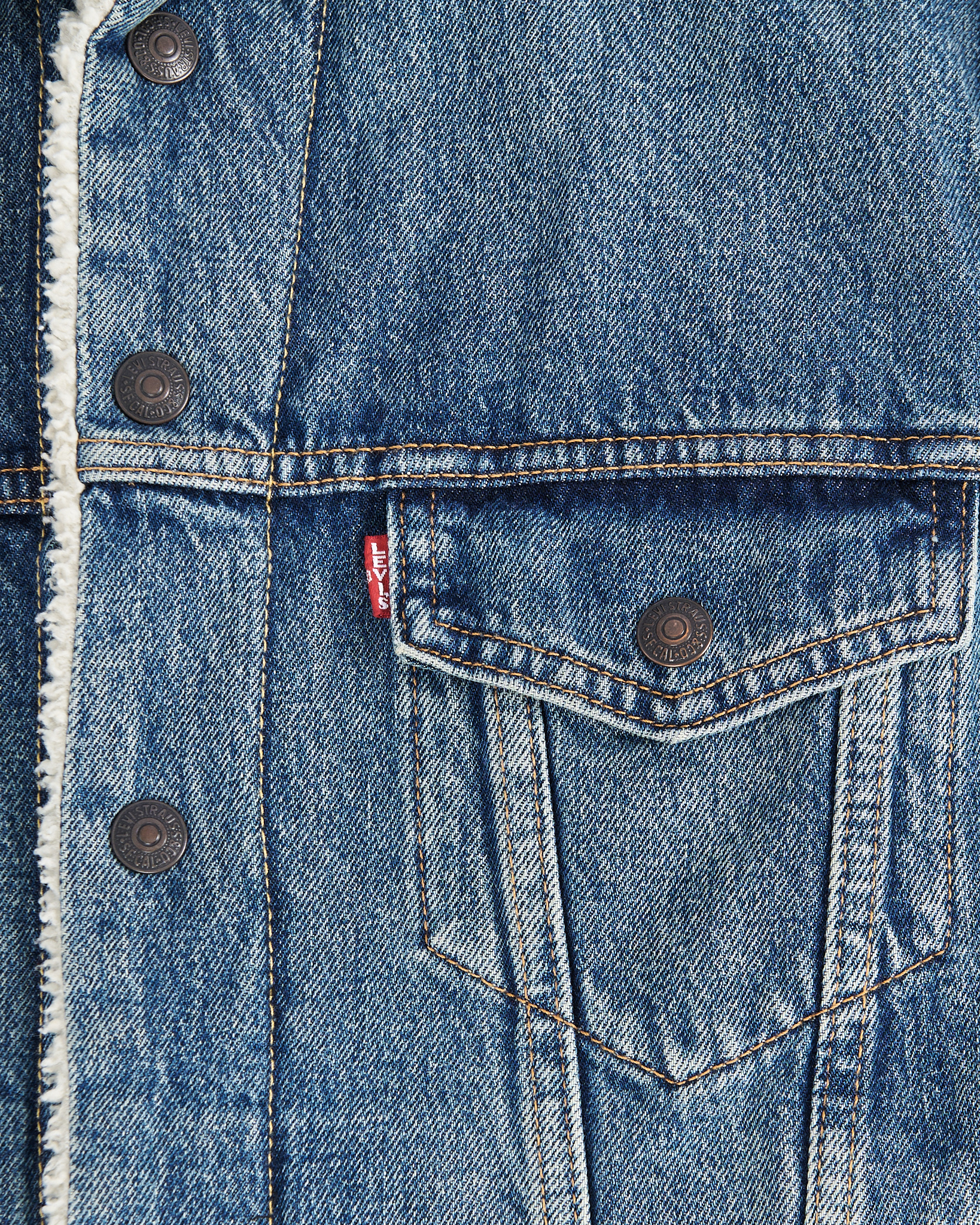 Куртка Levi’s из плотного денима с контрастным меховым воротником. Прямая посадка, контраст светлого меха и насыщенного синего денима. Застежка на клепки, нагрудные карманы и красный таб с логотипом.