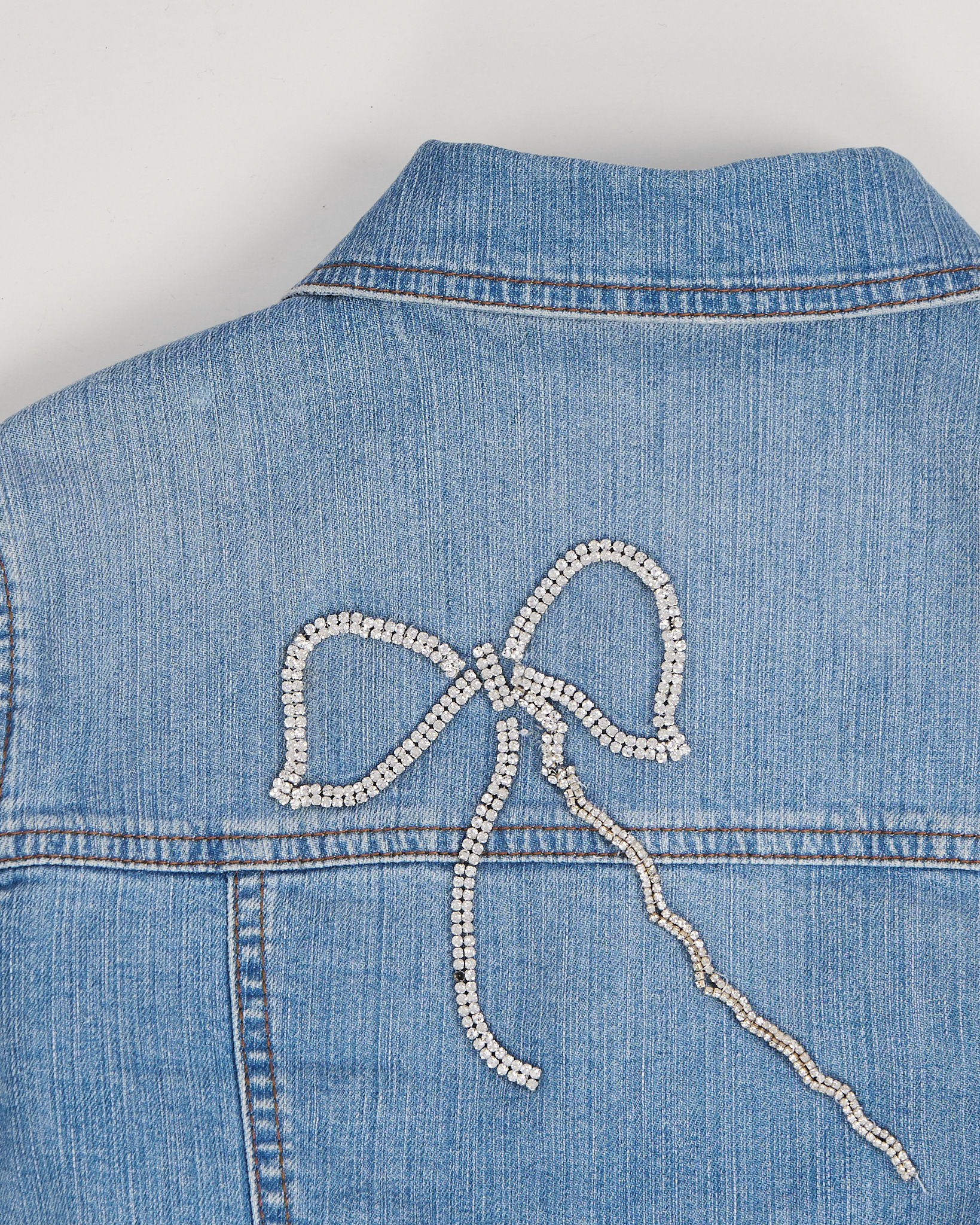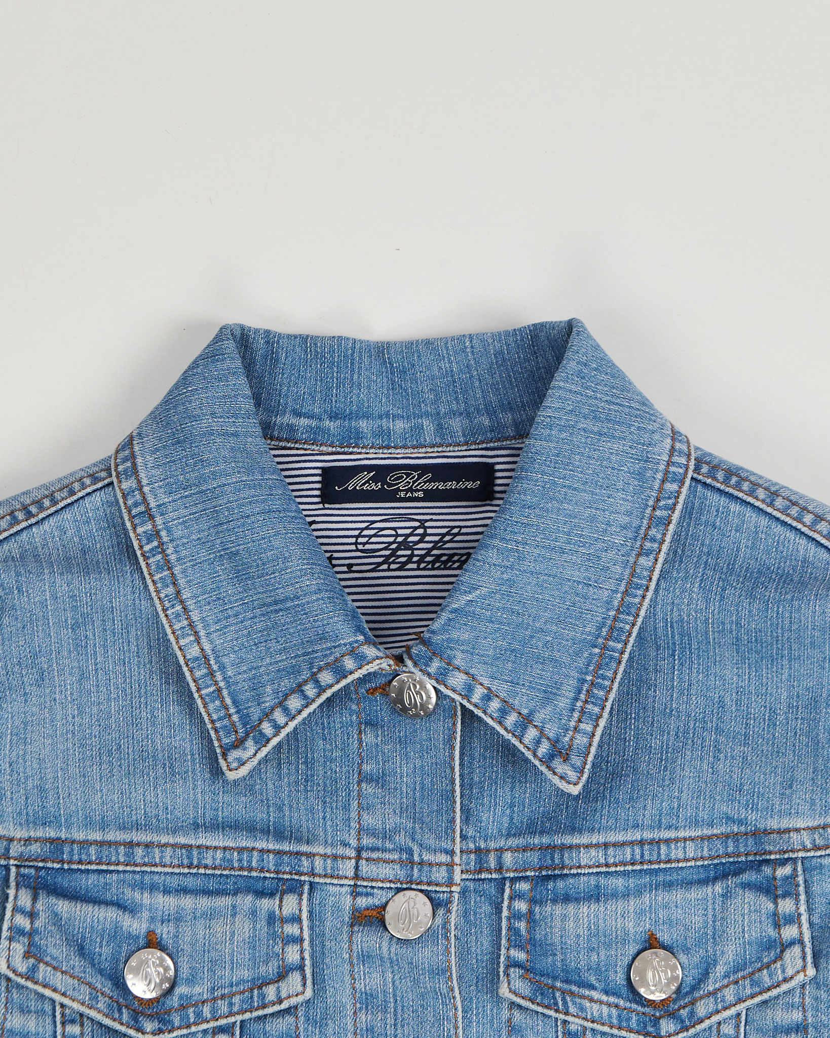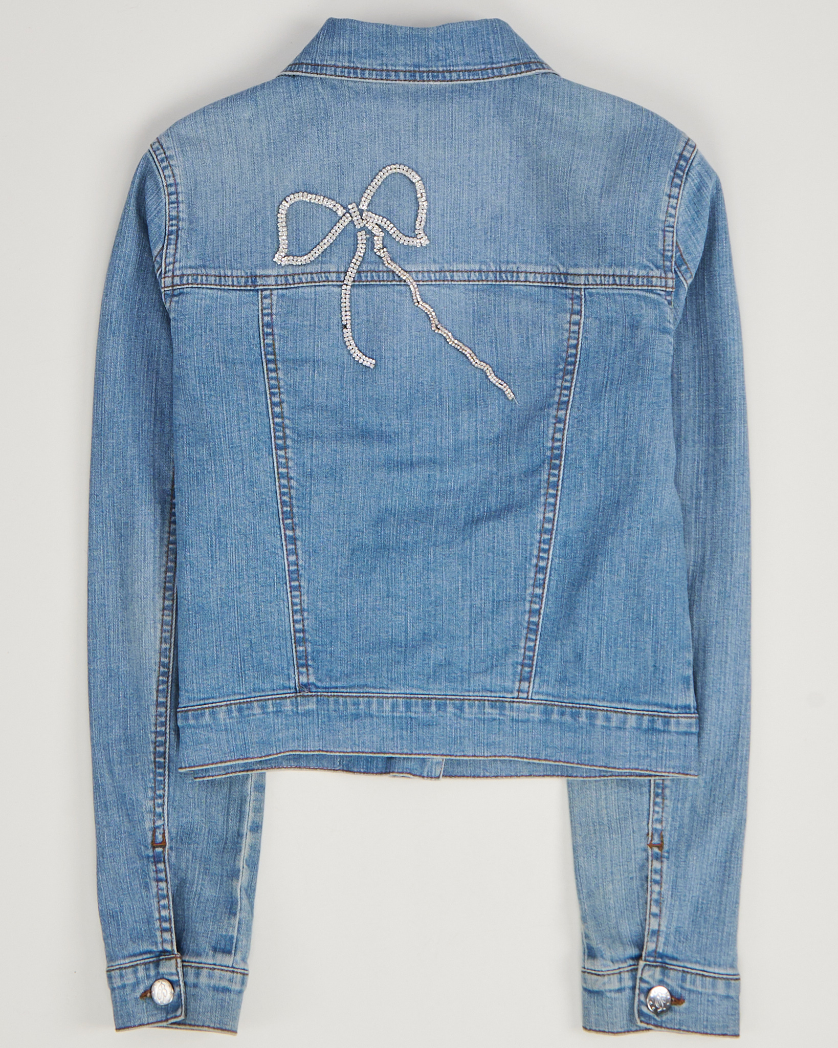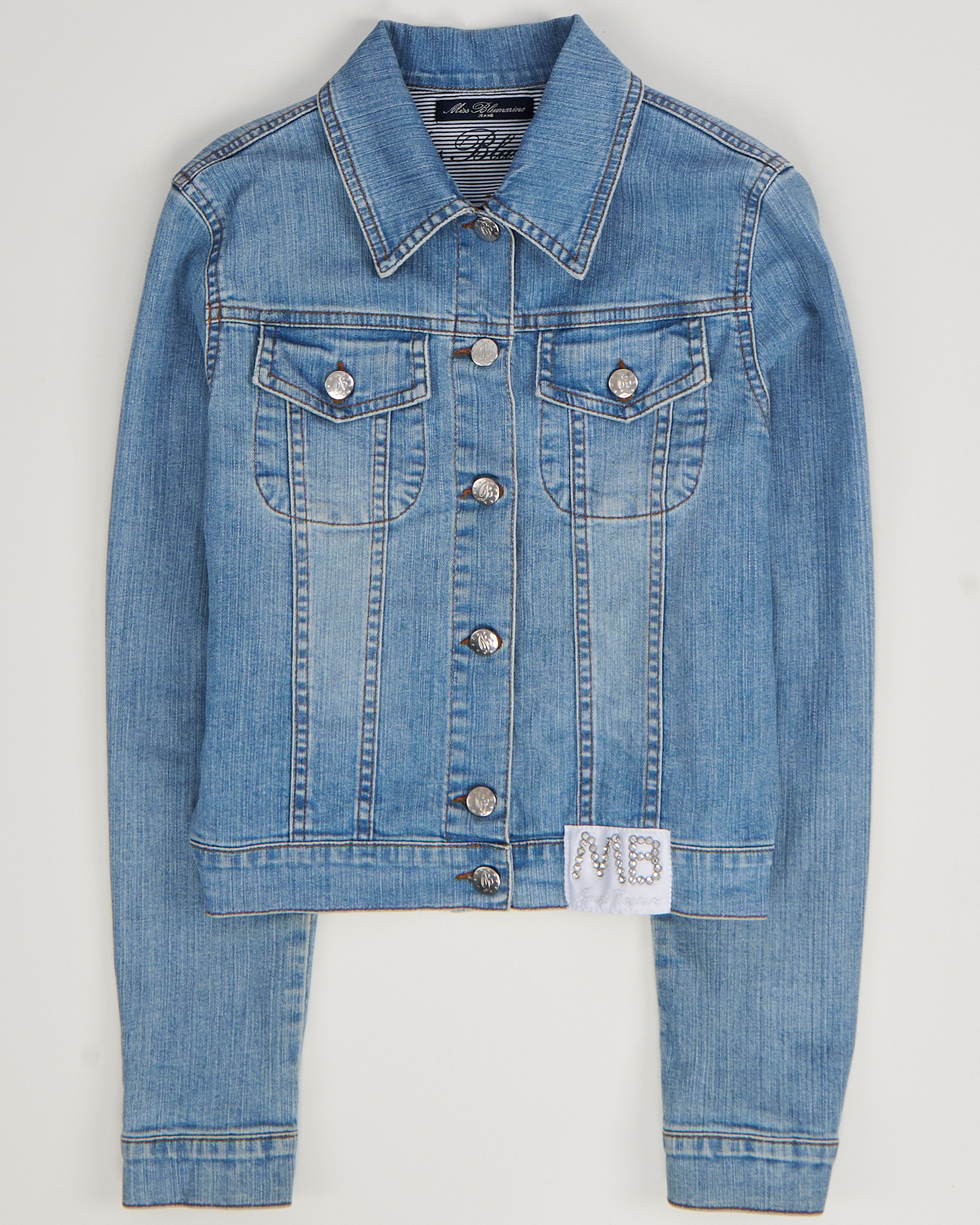 Куртка из плотного хлопкового денима от Miss Blumarine. Посадка укороченная, куртка чётко садится по линии плеч и корпуса. Металлические пуговицы с гравировкой бренда и декоративная нашивка из страз в виде банта на спине придает акцент.