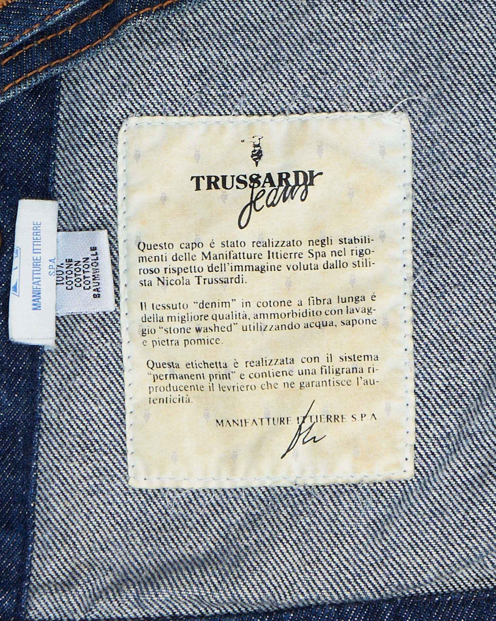 Куртка из плотного денима от Trussardi Jeans. Прямой крой и свободная посадка. Классическая застежка на металлические пуговицы с гравировкой бренда, нагрудные карманы с клапанами.