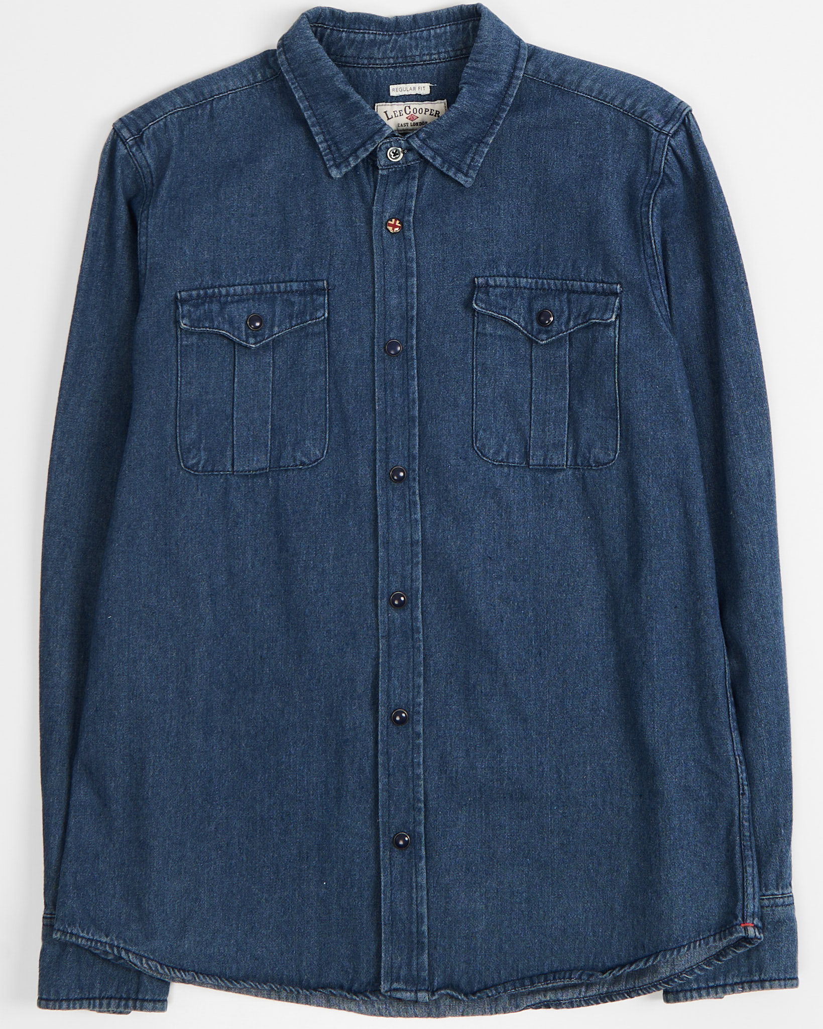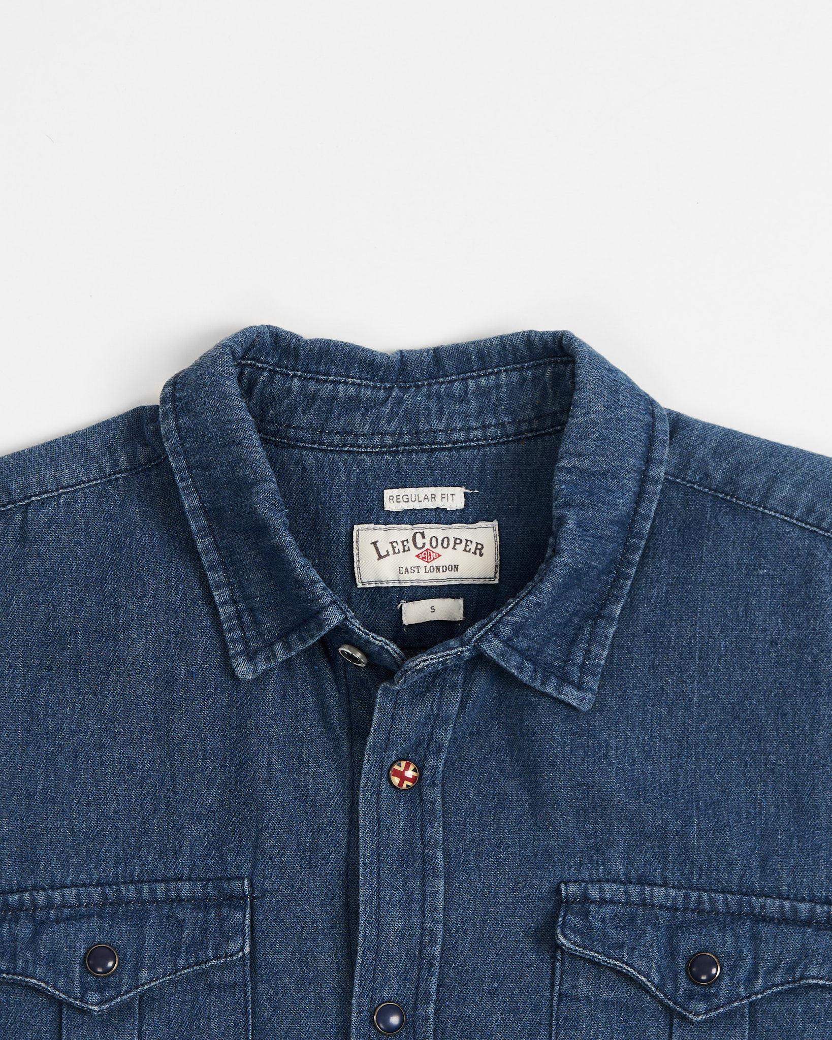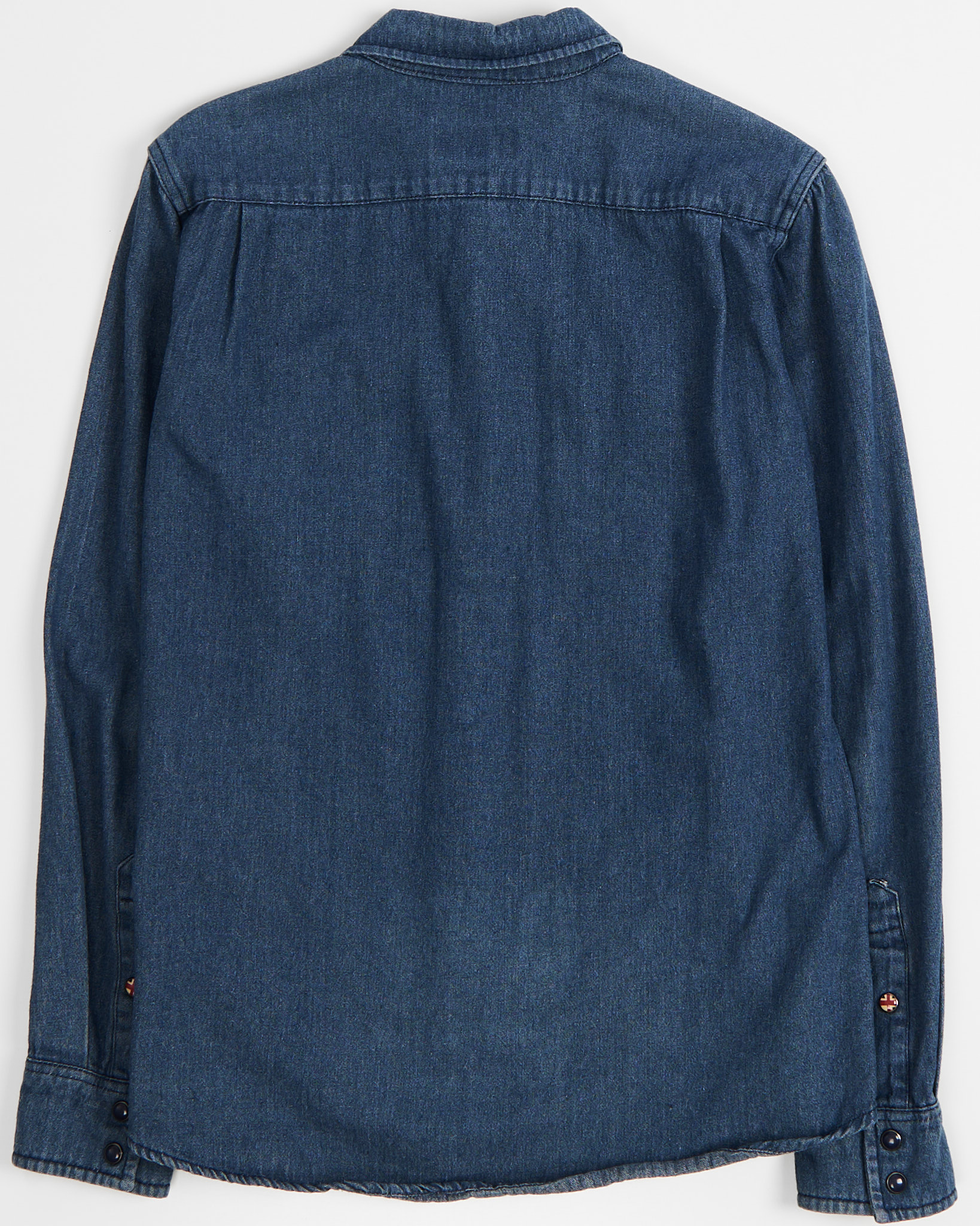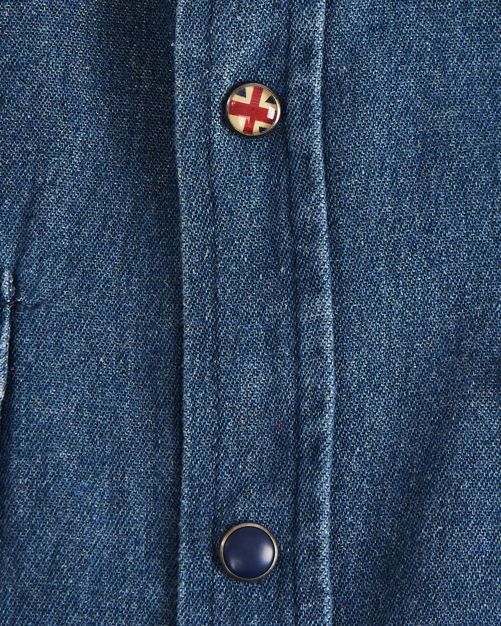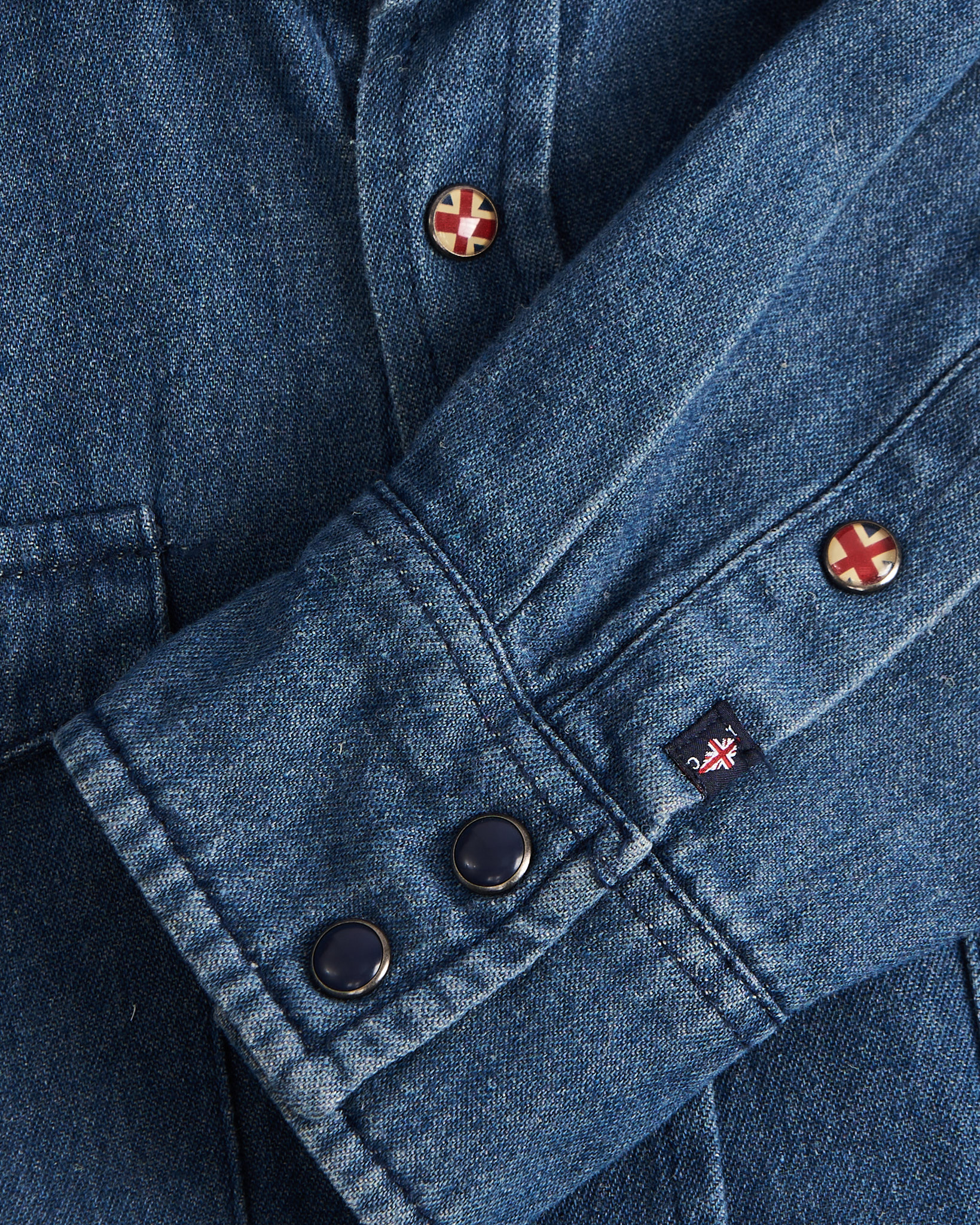 Плотная хлопковая деним-ткань хорошо держит форму. Прямая посадка Regular Fit. Два нагрудных кармана и кнопки в тон. Детали с британской символикой.