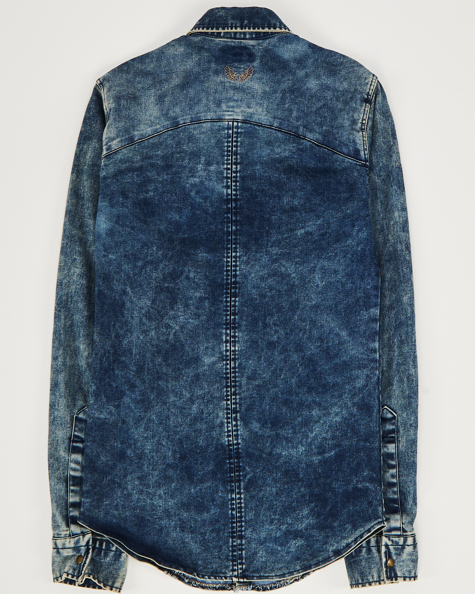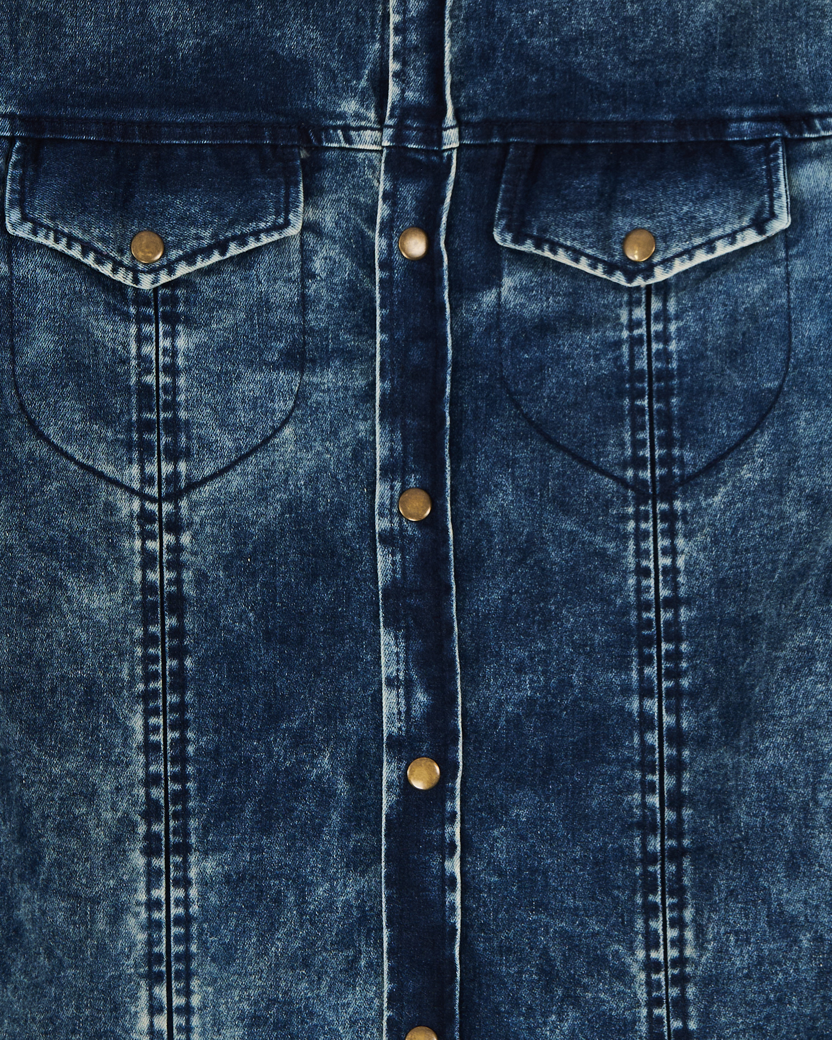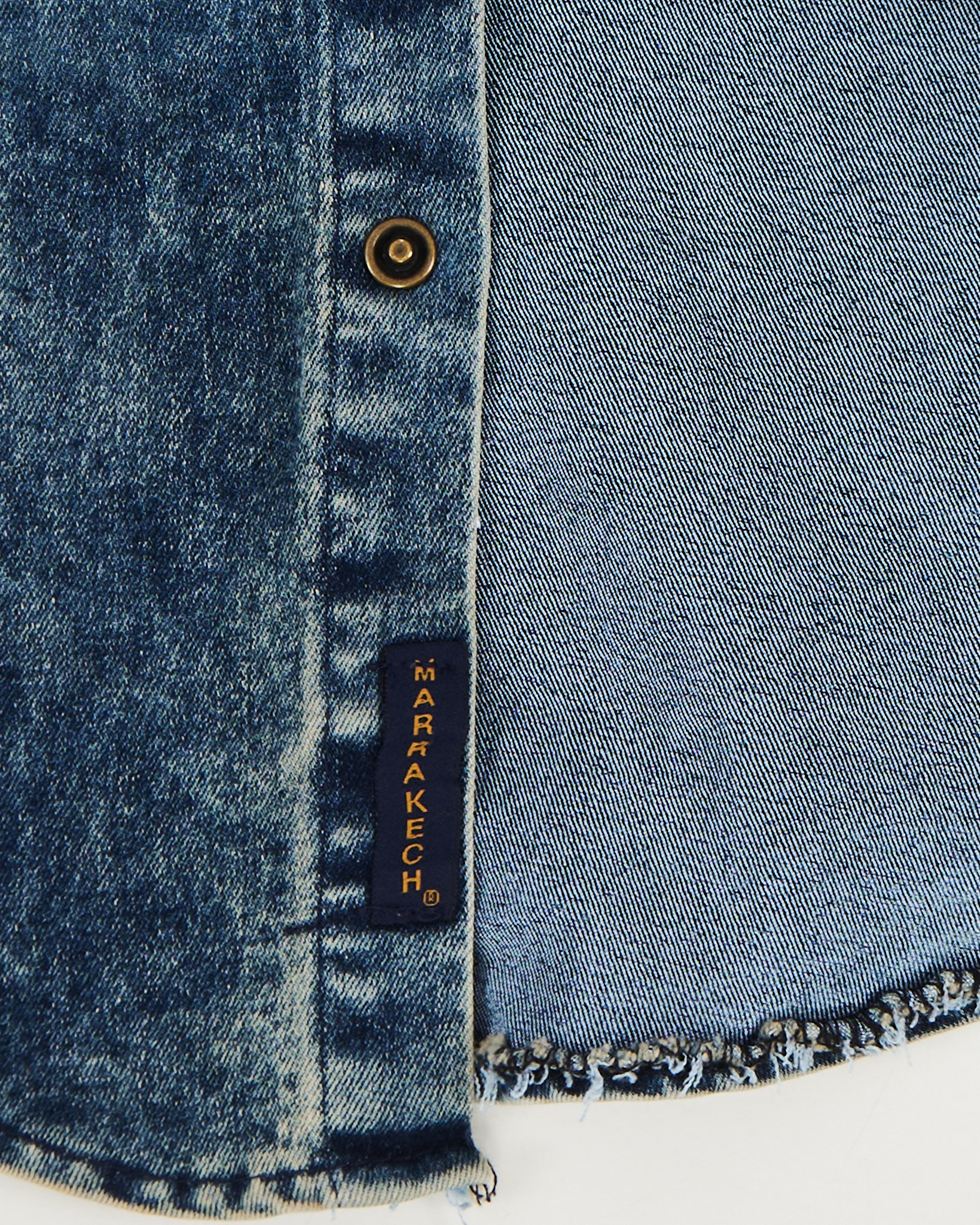 Джинсовая рубашка в стиле кэжуал от Marrakech. Выцветший синий деним, два накладных кармана с клапанами на груди. Прямой удлиненный крой, отложной воротник, застёжка на заклепках по всей длине, рукава с манжетами.