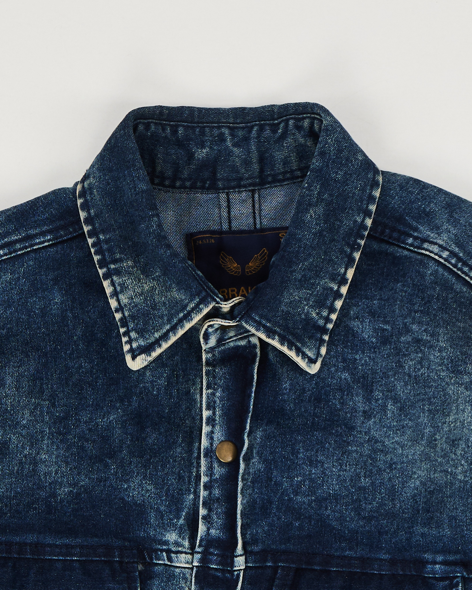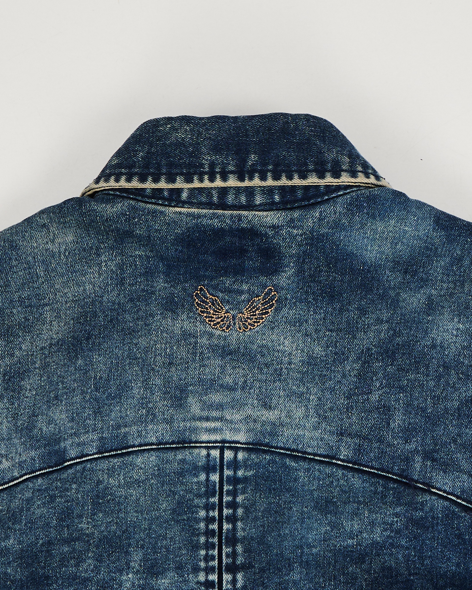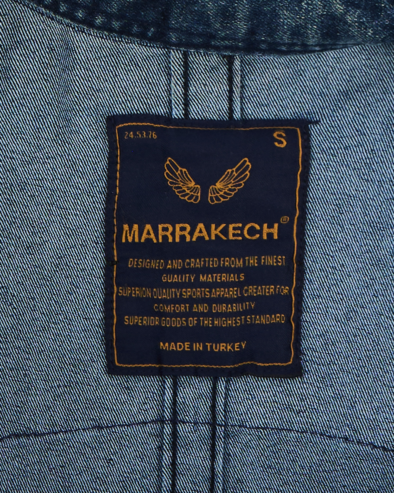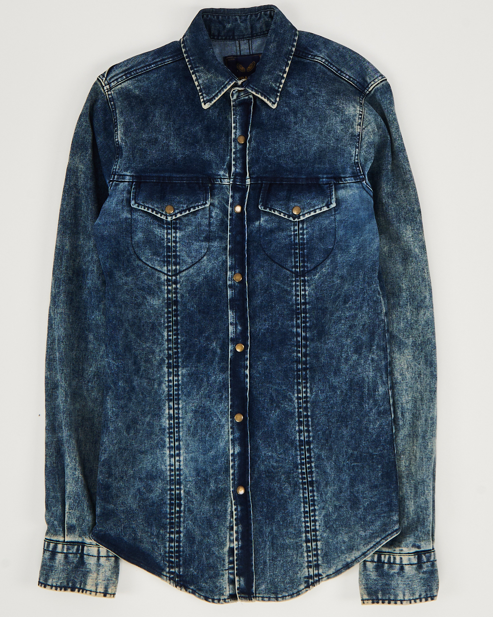 Джинсовая рубашка в стиле кэжуал от Marrakech. Выцветший синий деним, два накладных кармана с клапанами на груди. Прямой удлиненный крой, отложной воротник, застёжка на заклепках по всей длине, рукава с манжетами.