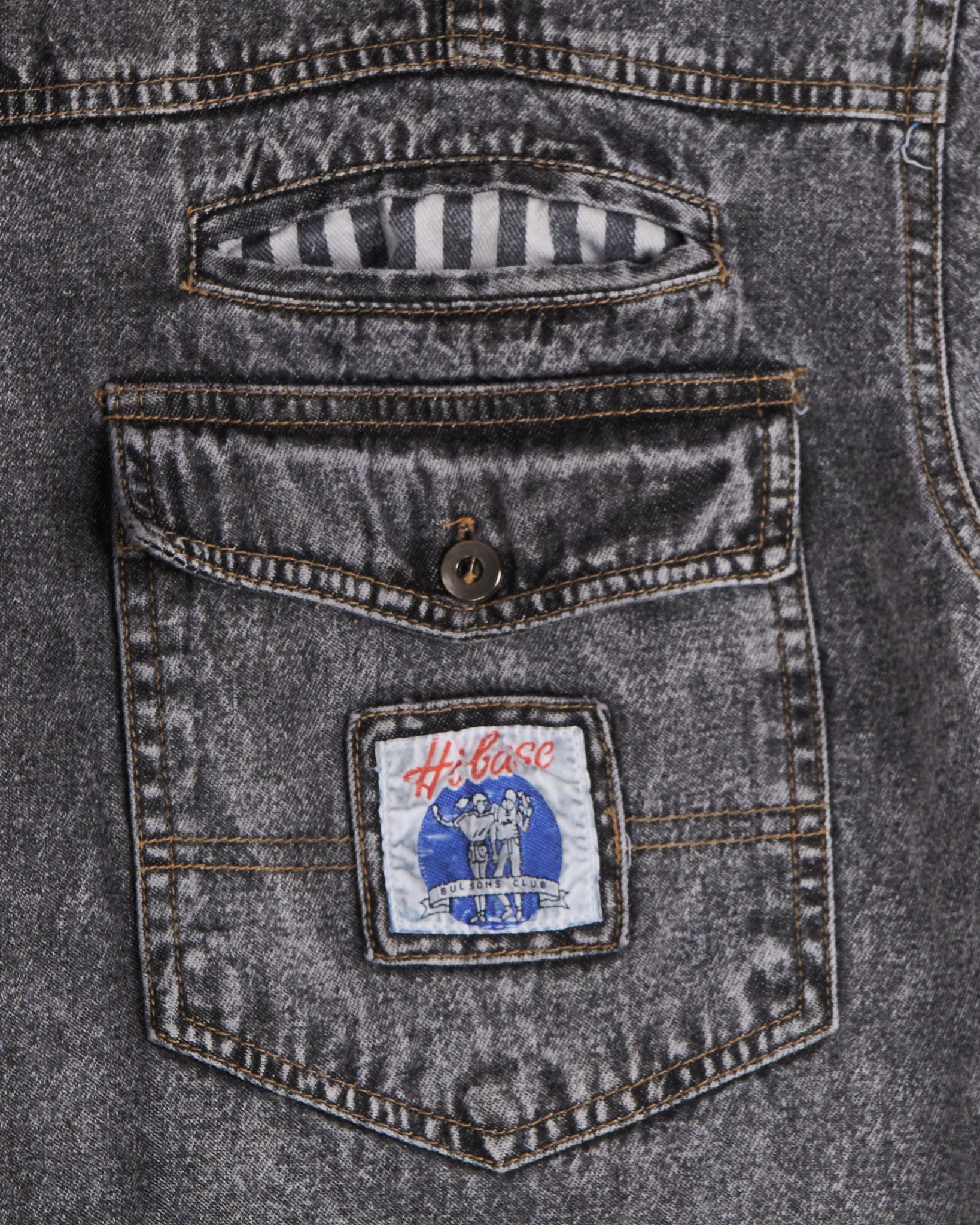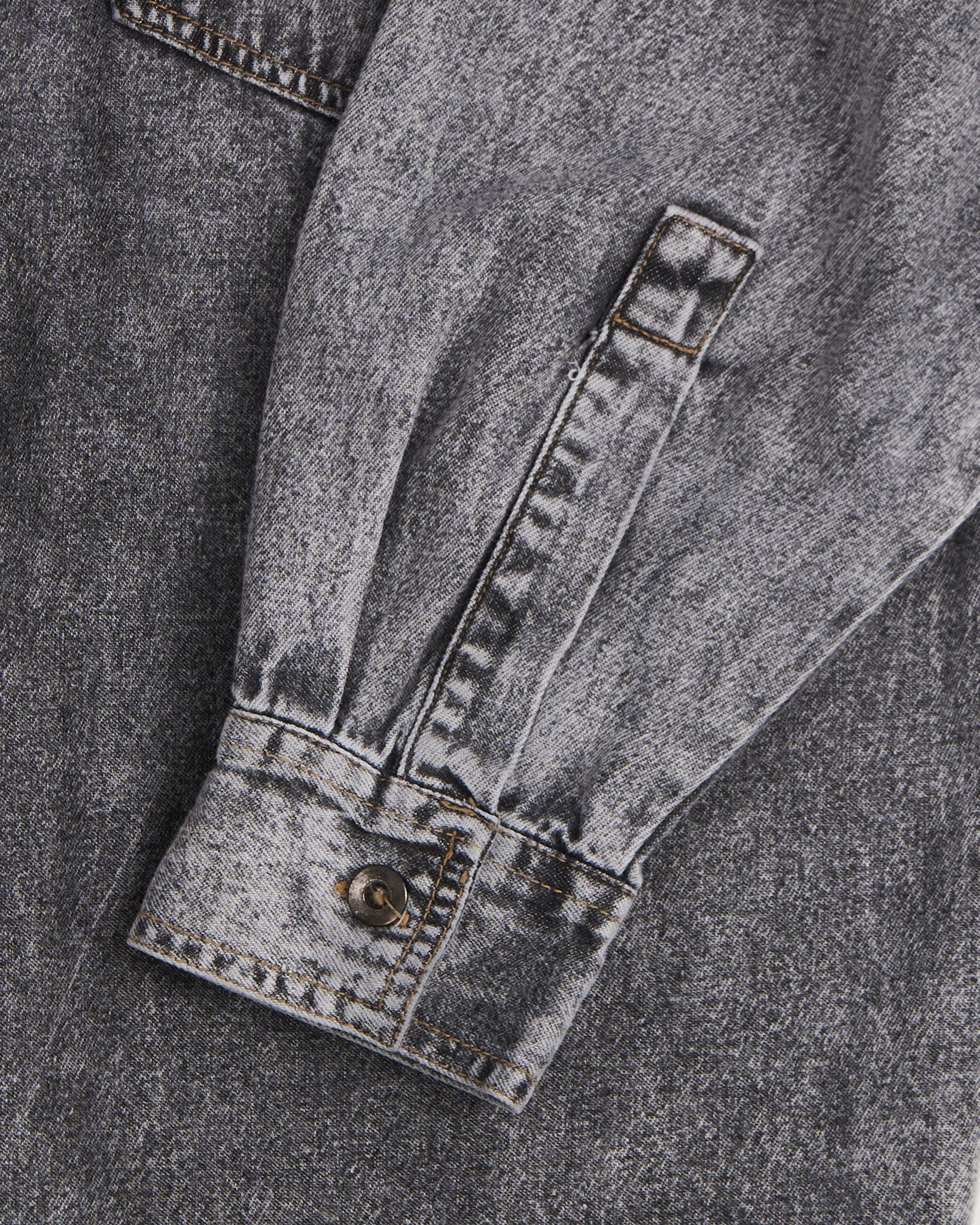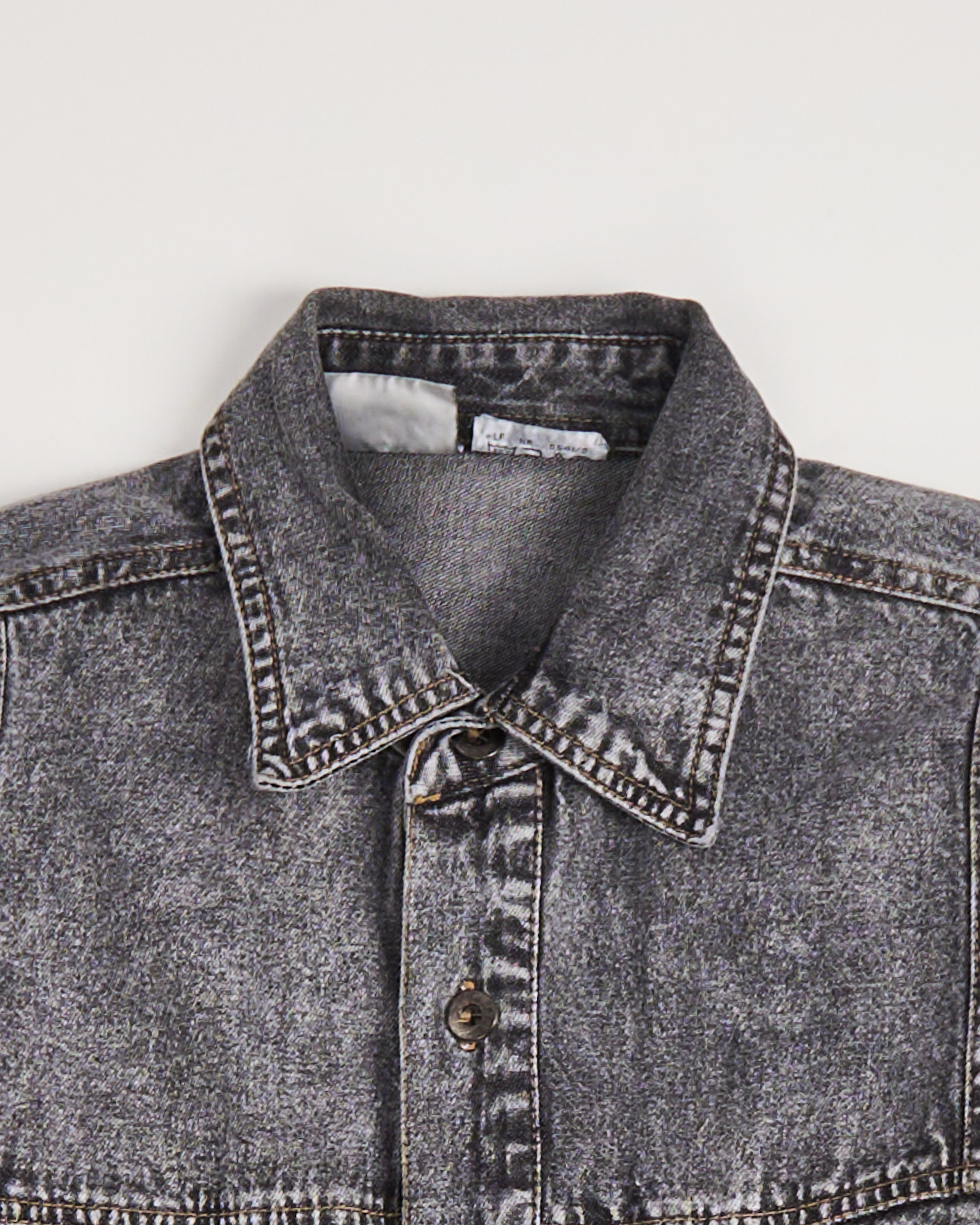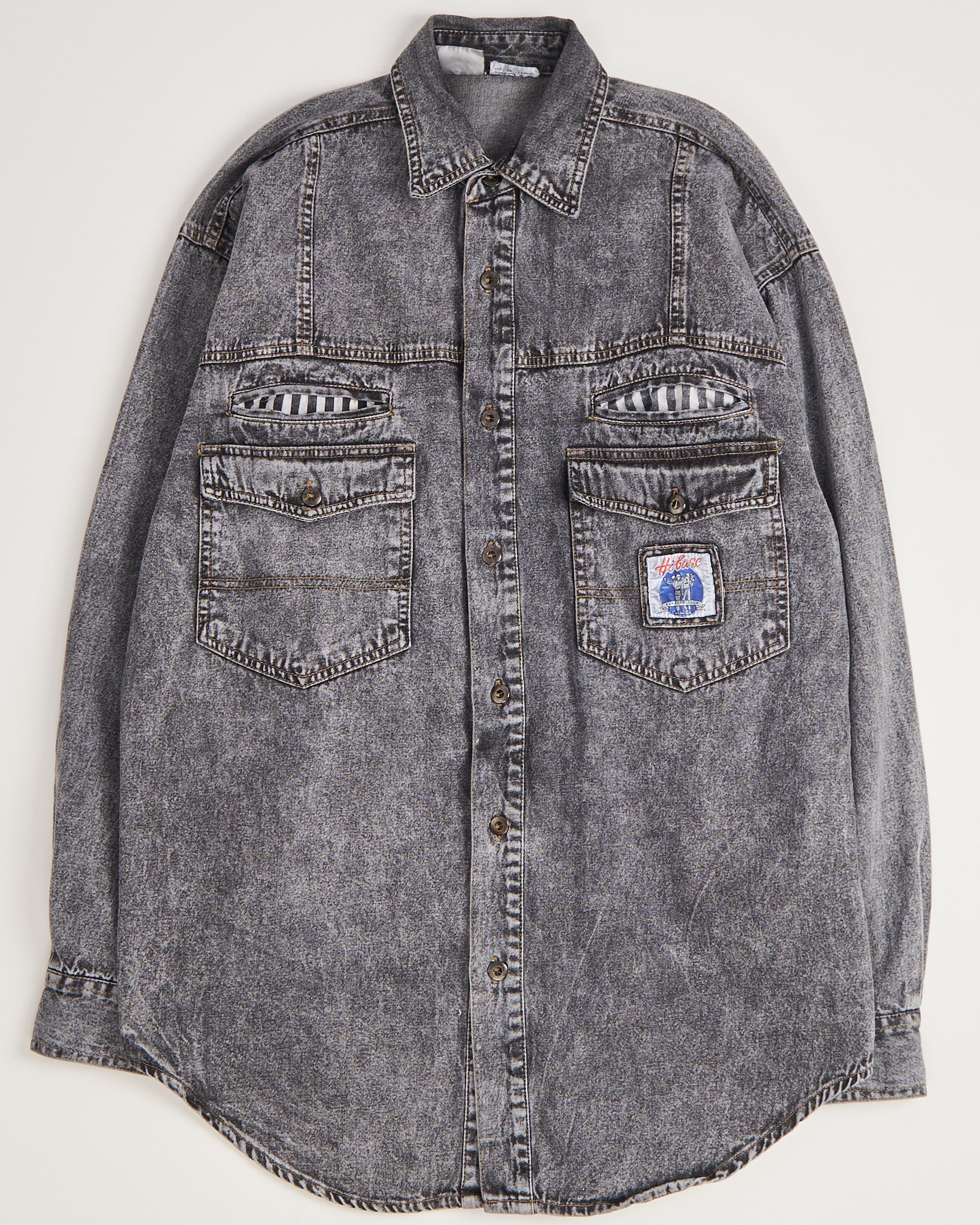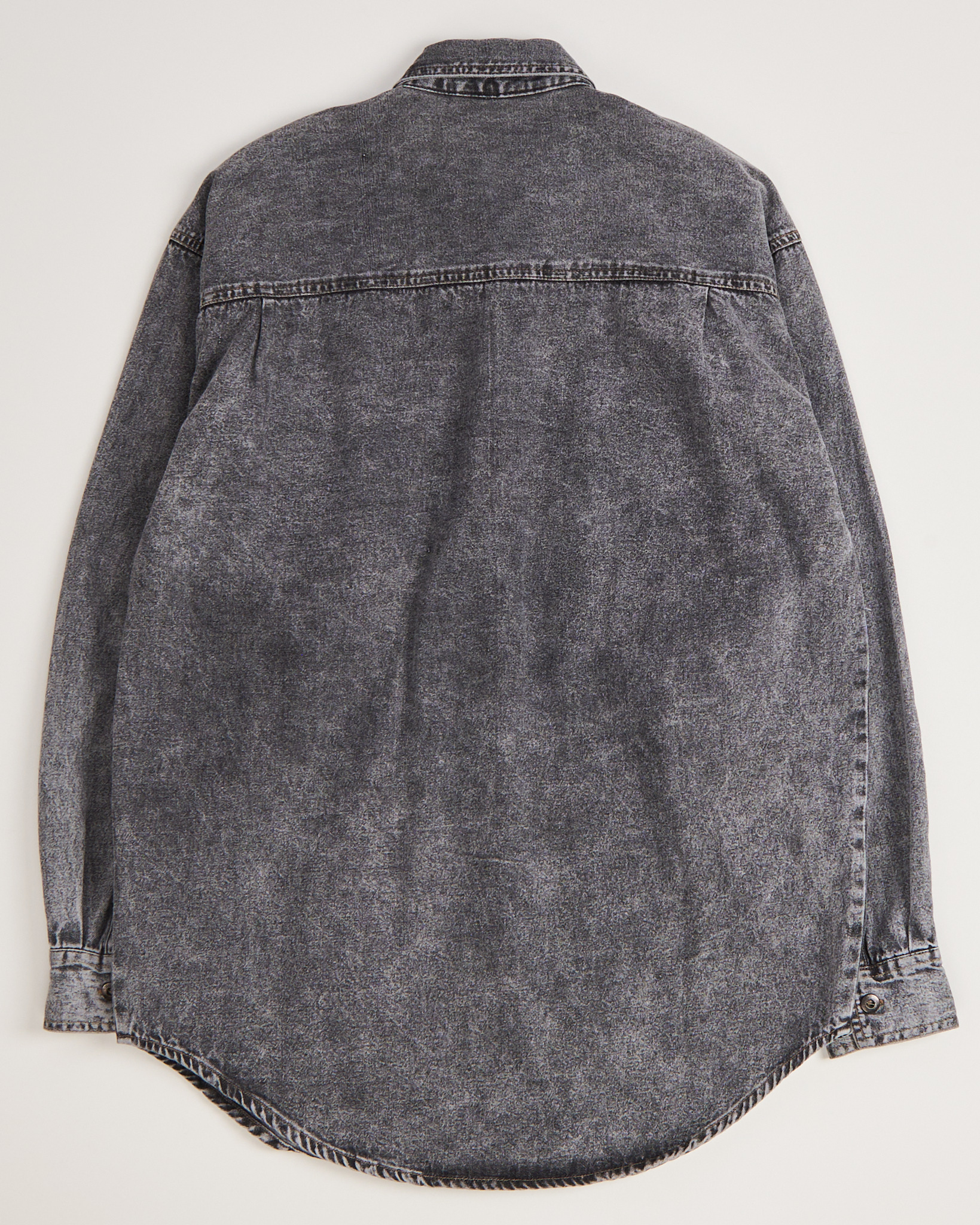 Джинсовая серая рубашка с эффектом кислотной стирки. Прямой удлиненный крой, отложной воротник, застёжка на пуговицах по всей длине, манжеты на рукавах. Четыре кармана: два с клапанами на пуговицах, и два с контрастной чёрно-белой полоской. Кэжуал с элементами бунтарского гранжа.