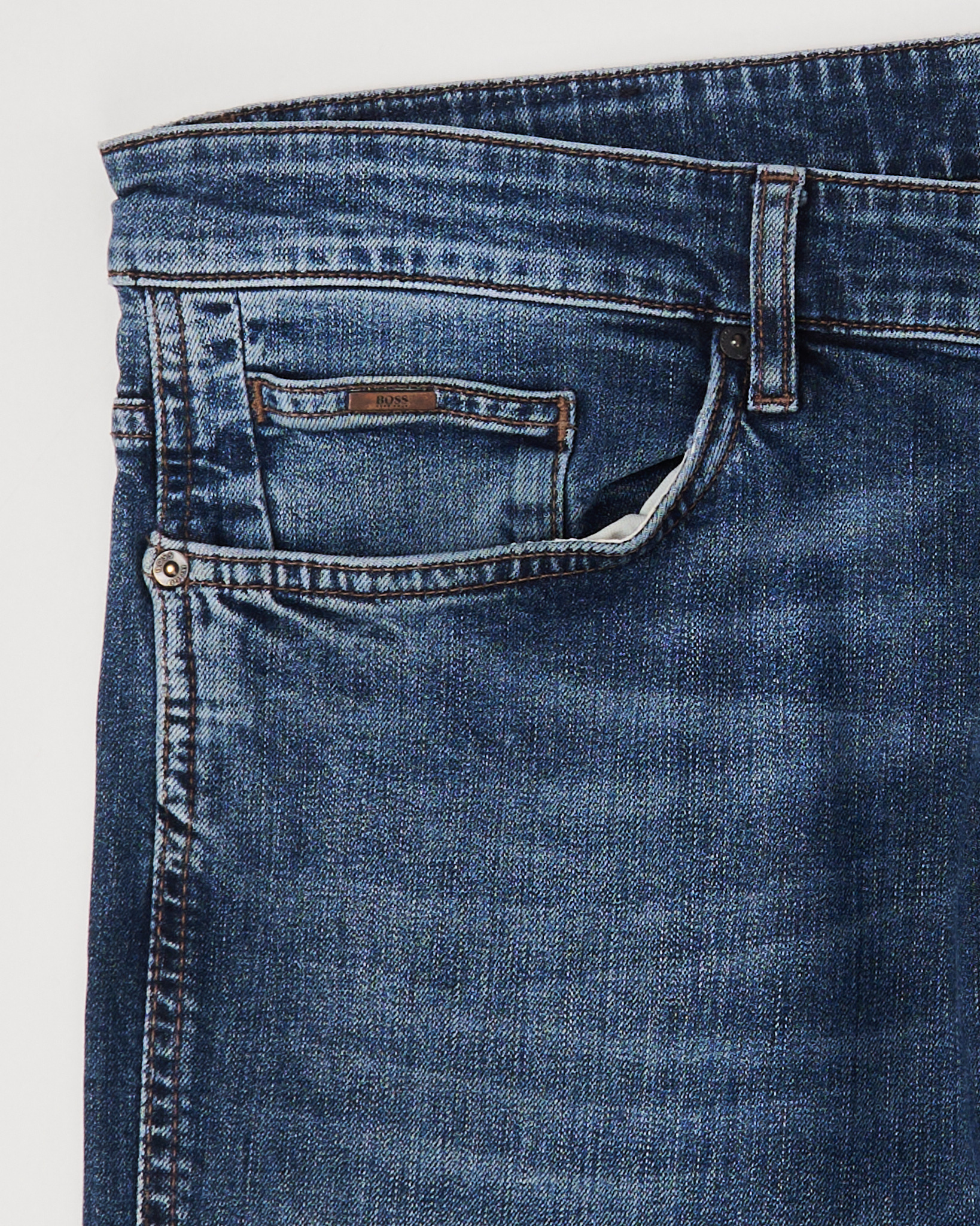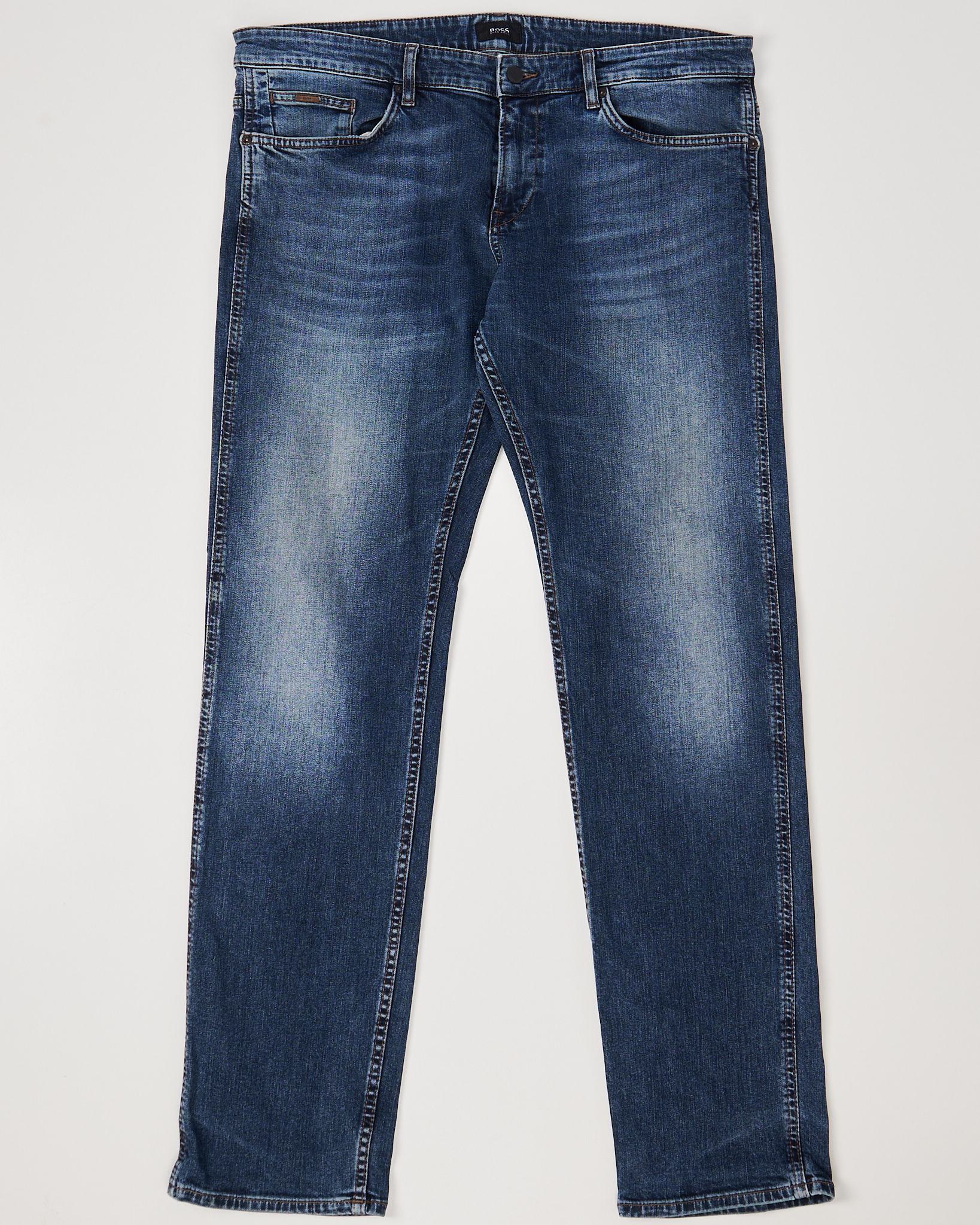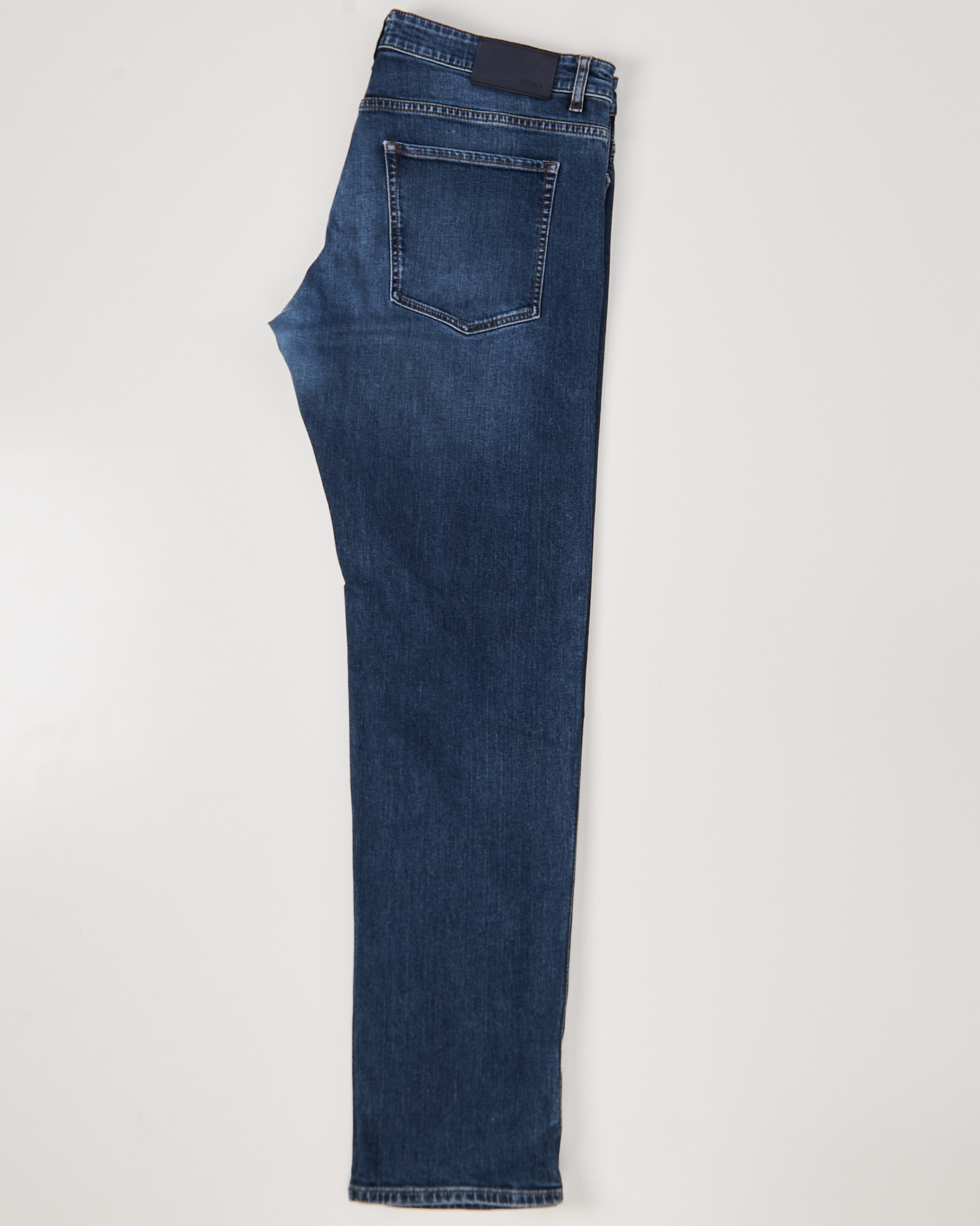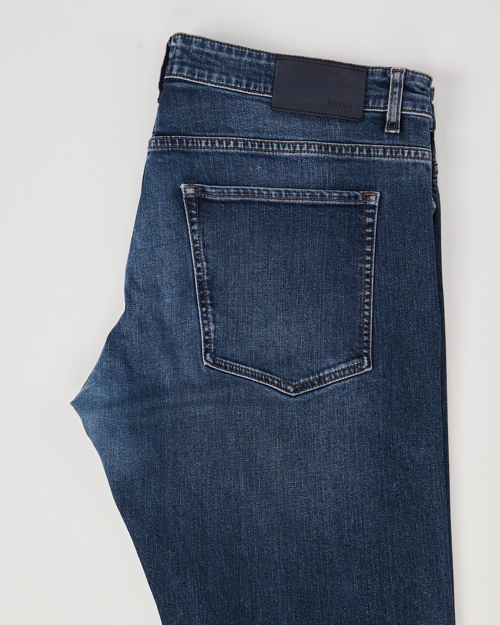 Джинсы BOSS из плотного хлопкового денима. Посадка средняя, крой прямой, силуэт выглядит собранно. Глубокий синий оттенок с выраженной вываркой добавляет акцент. Фирменная фурнитура, кожаный патч с логотипом бренда сзади.