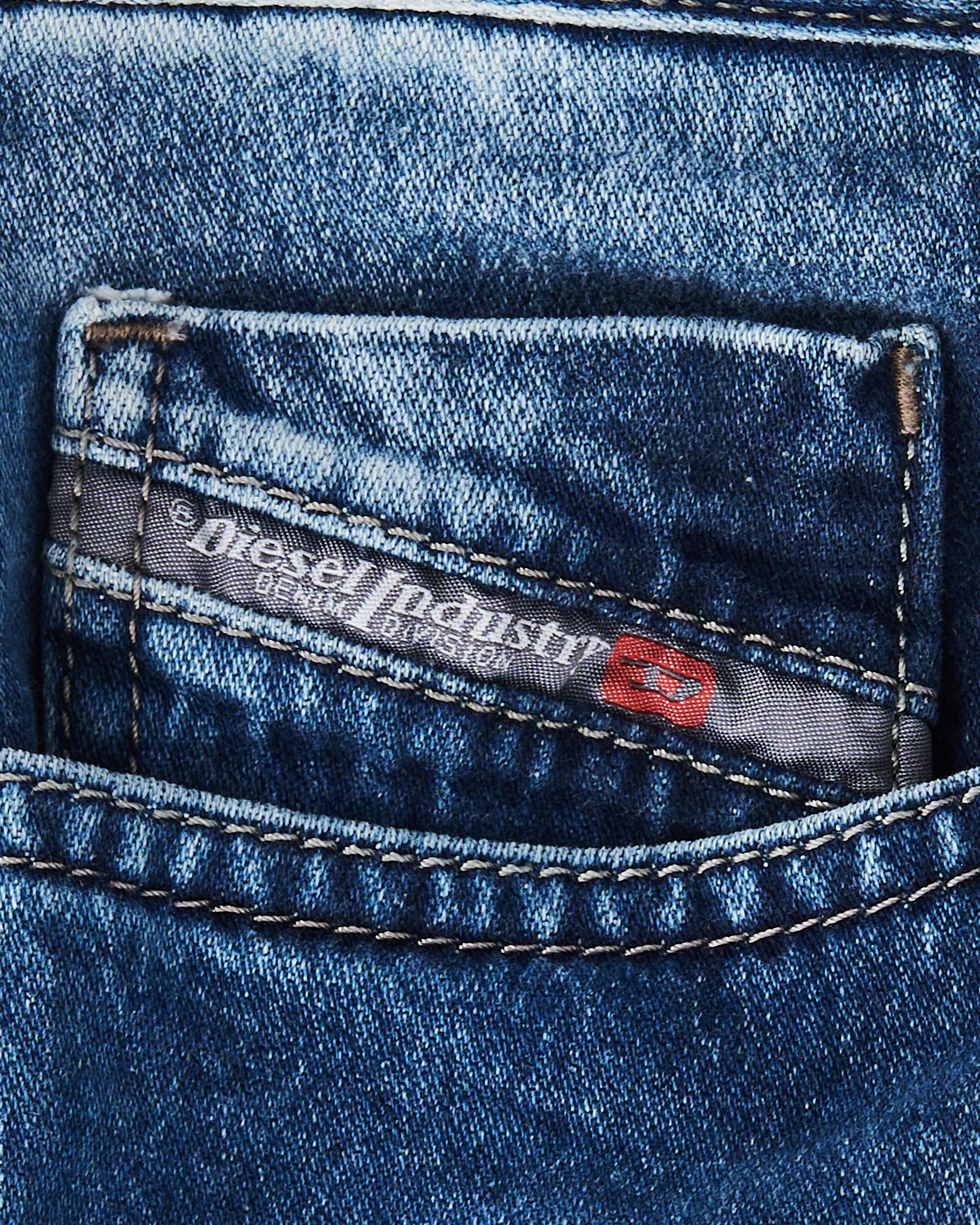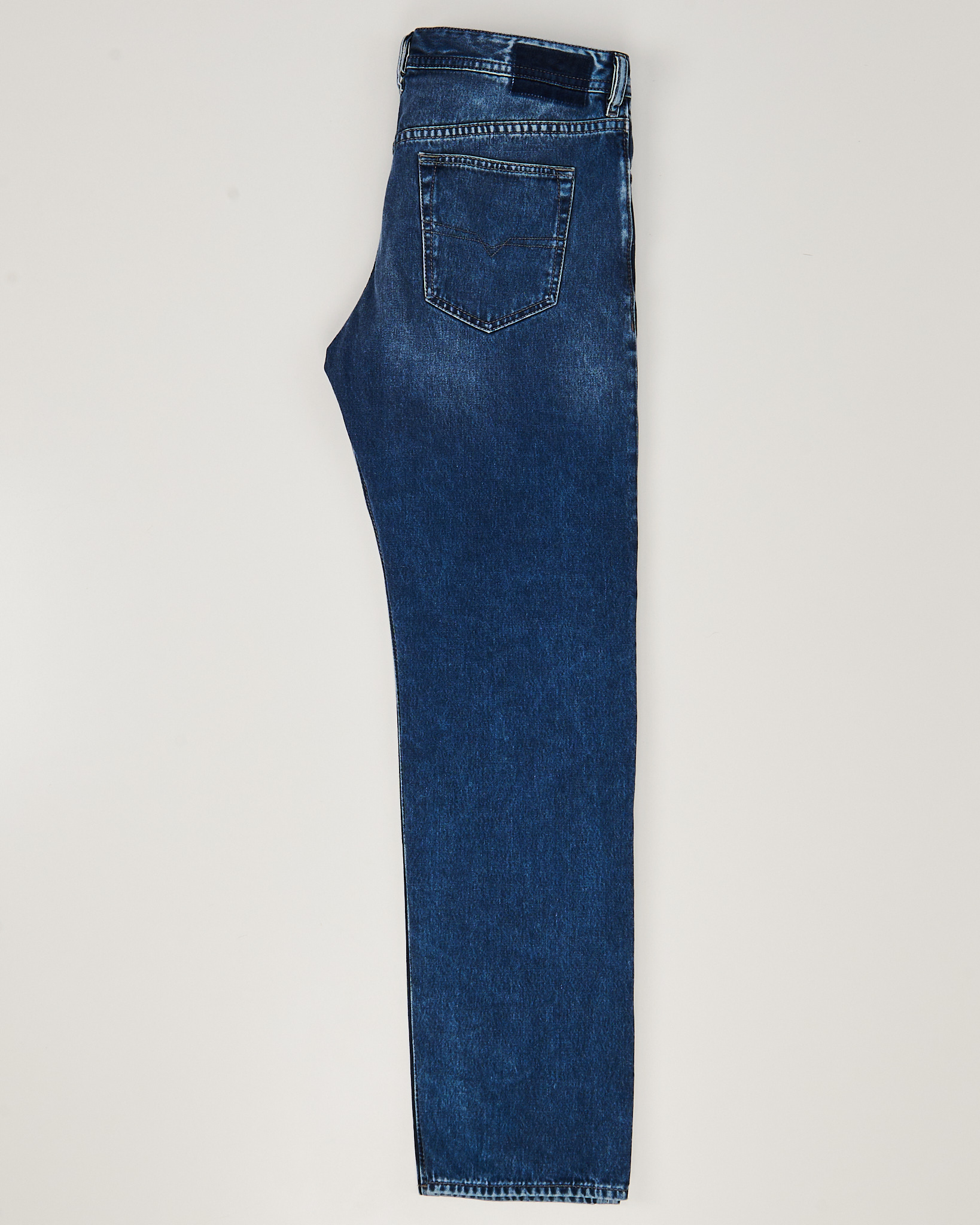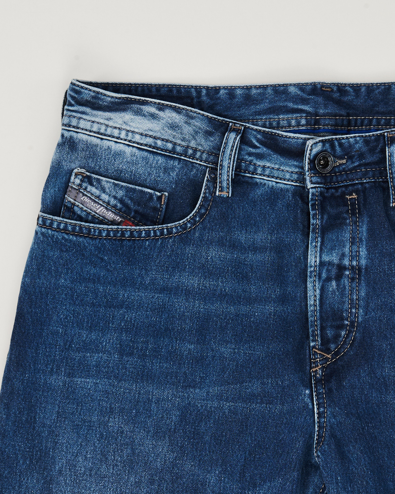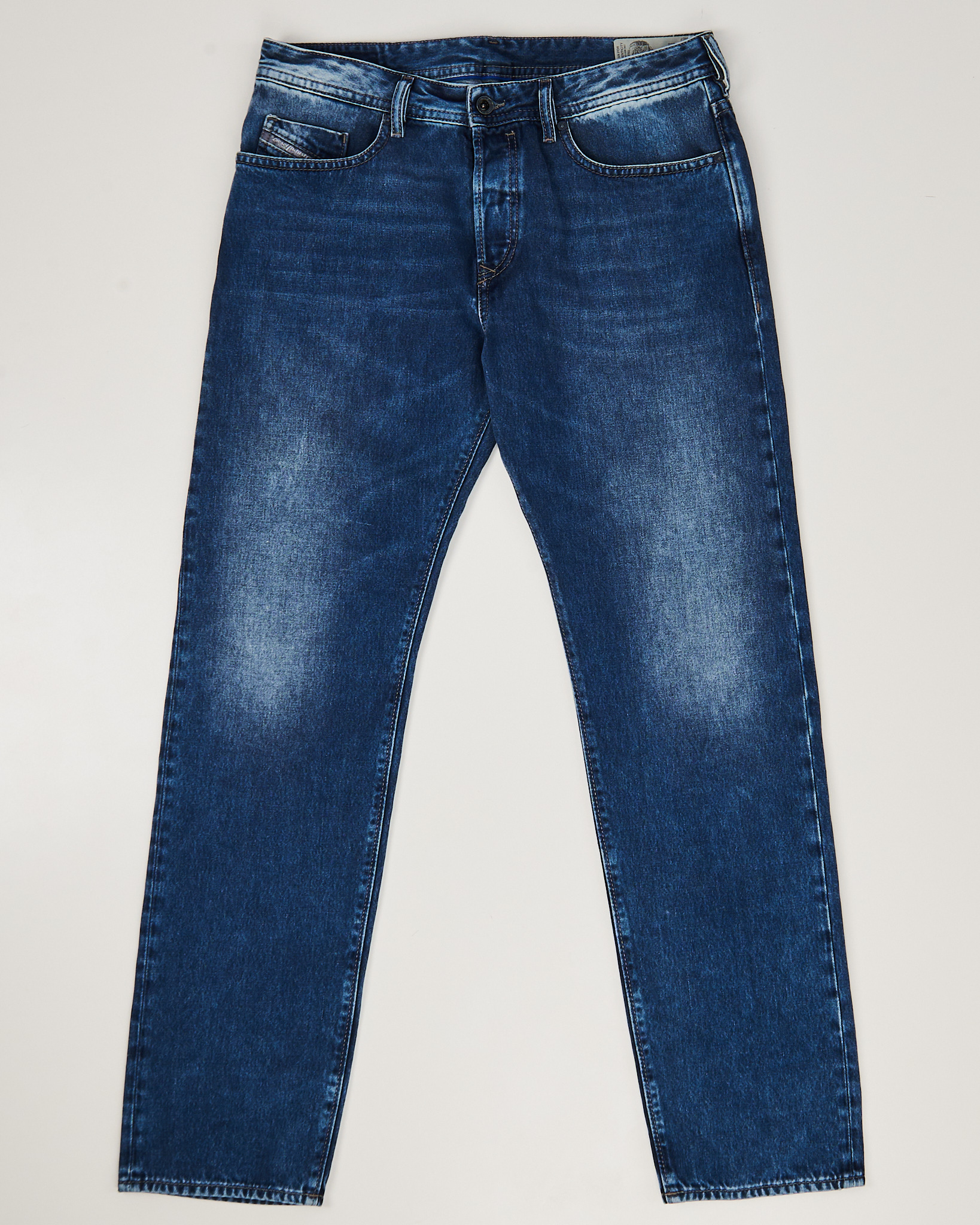 Джинсы Diesel Buster из плотного денима насыщенного синего оттенка. Контрастные потертости, посадка средняя, силуэт слегка заужен к низу. Логотип бренда на кармане, скрытая застежка на брендированные пуговицы.