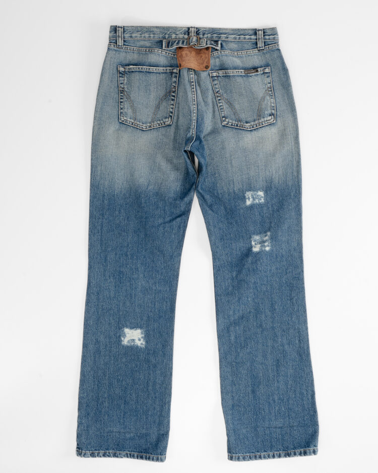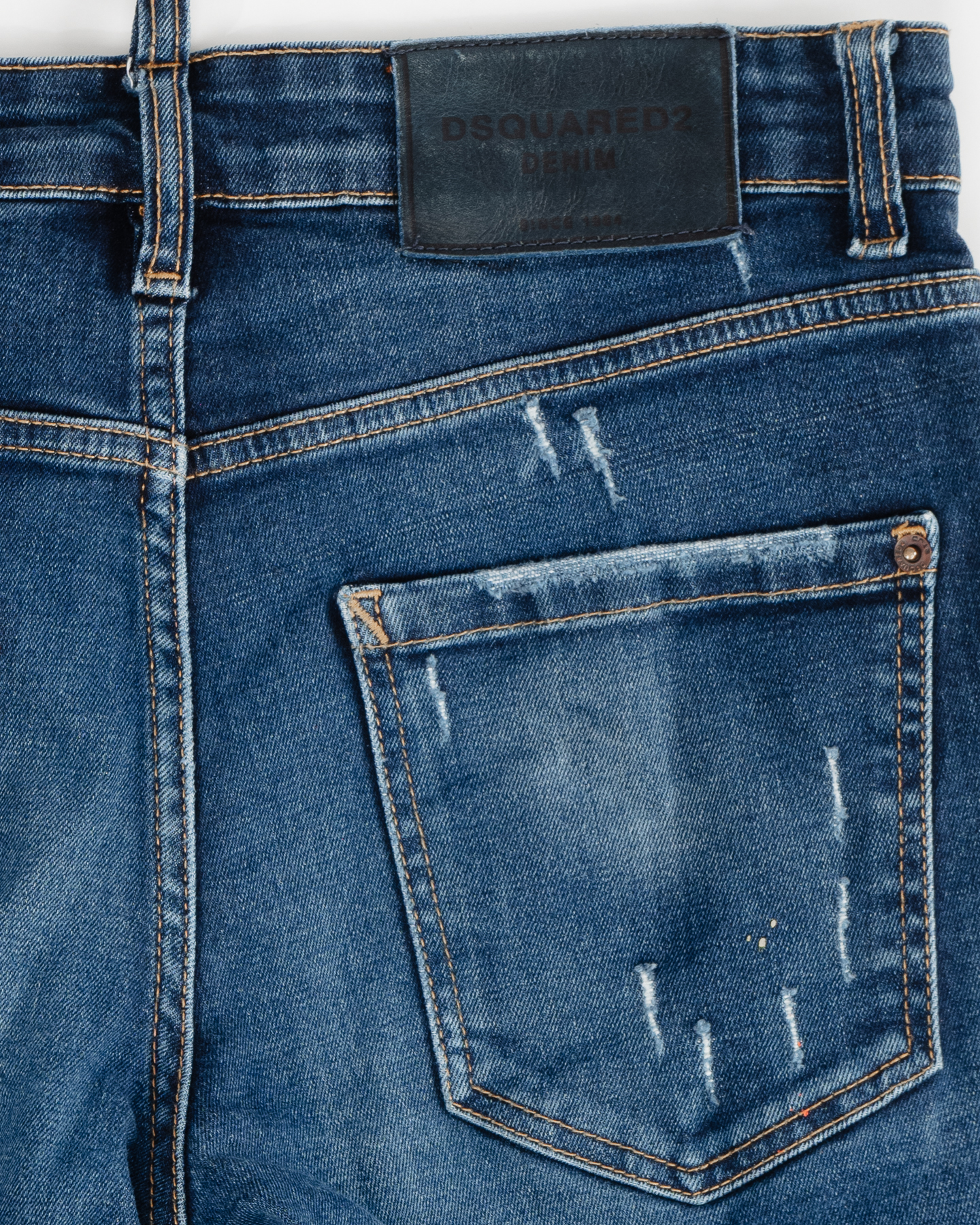 - На поясе — фирменная красная нашивка DSQUARED2, контрастная желтая строчка по швам и деликатные разноцветные крапинки, характерные для моделей середины 2000-х.