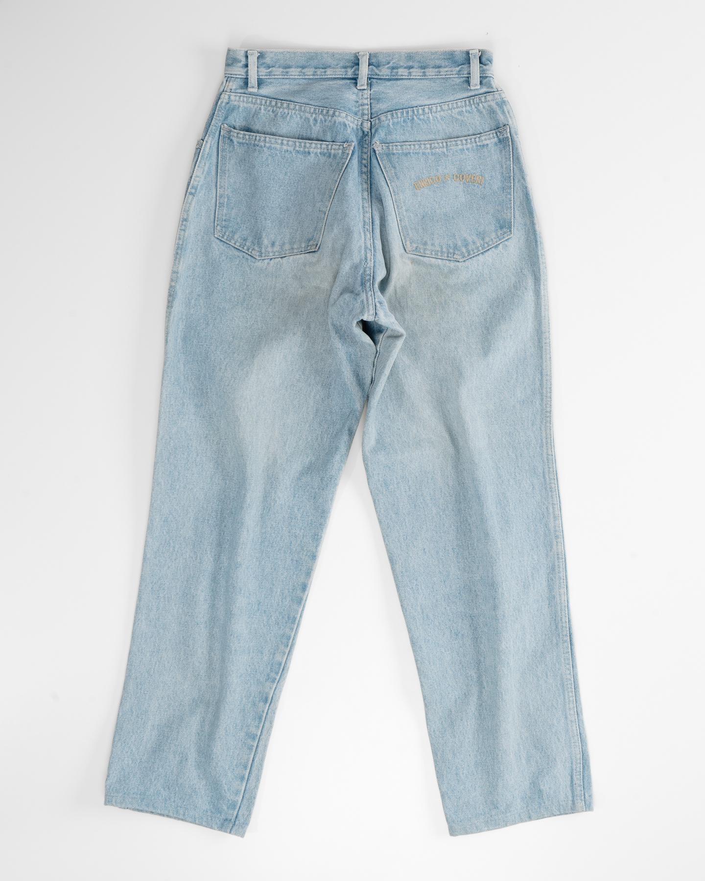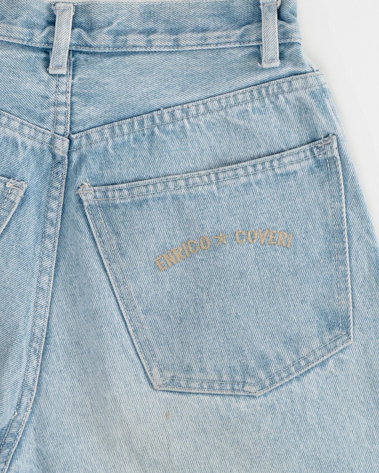- Однородный деним с лёгкой вариативностью тона и фирменной вышивкой ENRICO COVERI на заднем кармане в золотистом цвете — акцент, отсылающий к архивным моделям бренда.