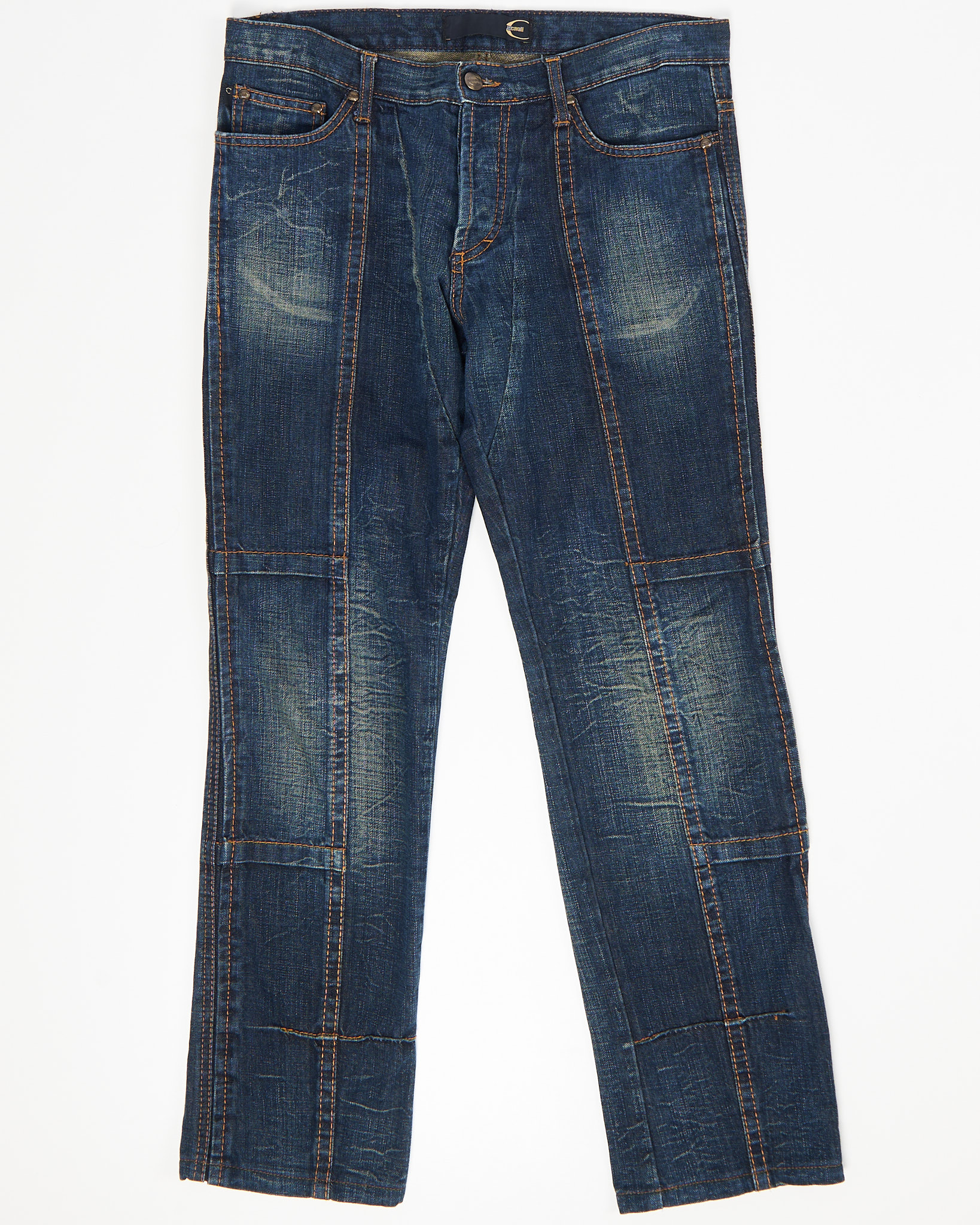 Джинсы Just Cavalli с акцентными швами из 100% хлопка. Прямой крой, акцентные швы, фирменная фурнитура и потертости ткани