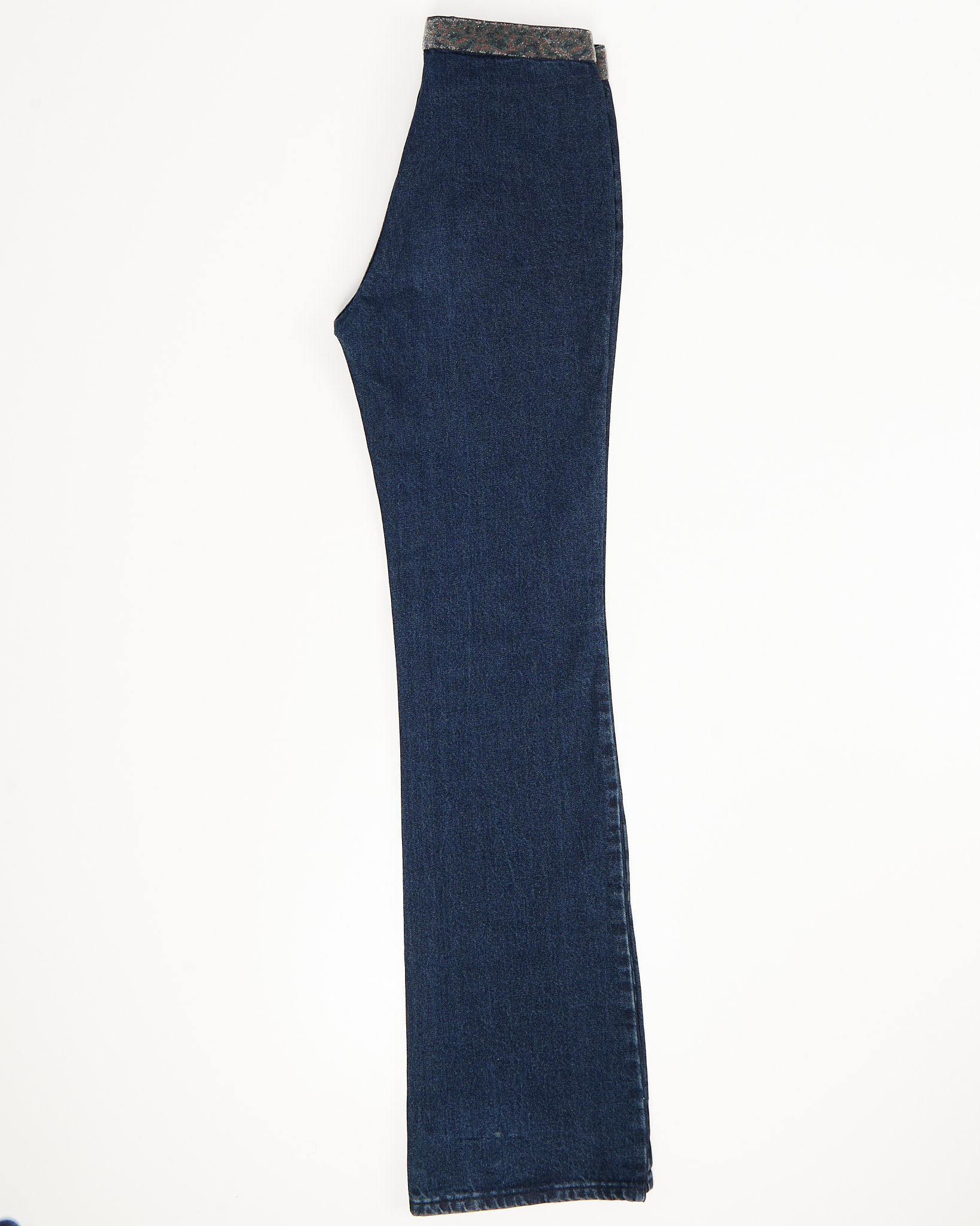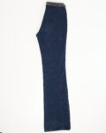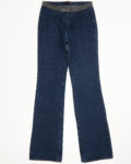 Яркий образец стиля 70-х - клеш силуэт со средней посадкой. Модель насыщенного синего цвета, по поясу украшена плотной вышивкой из бисера.