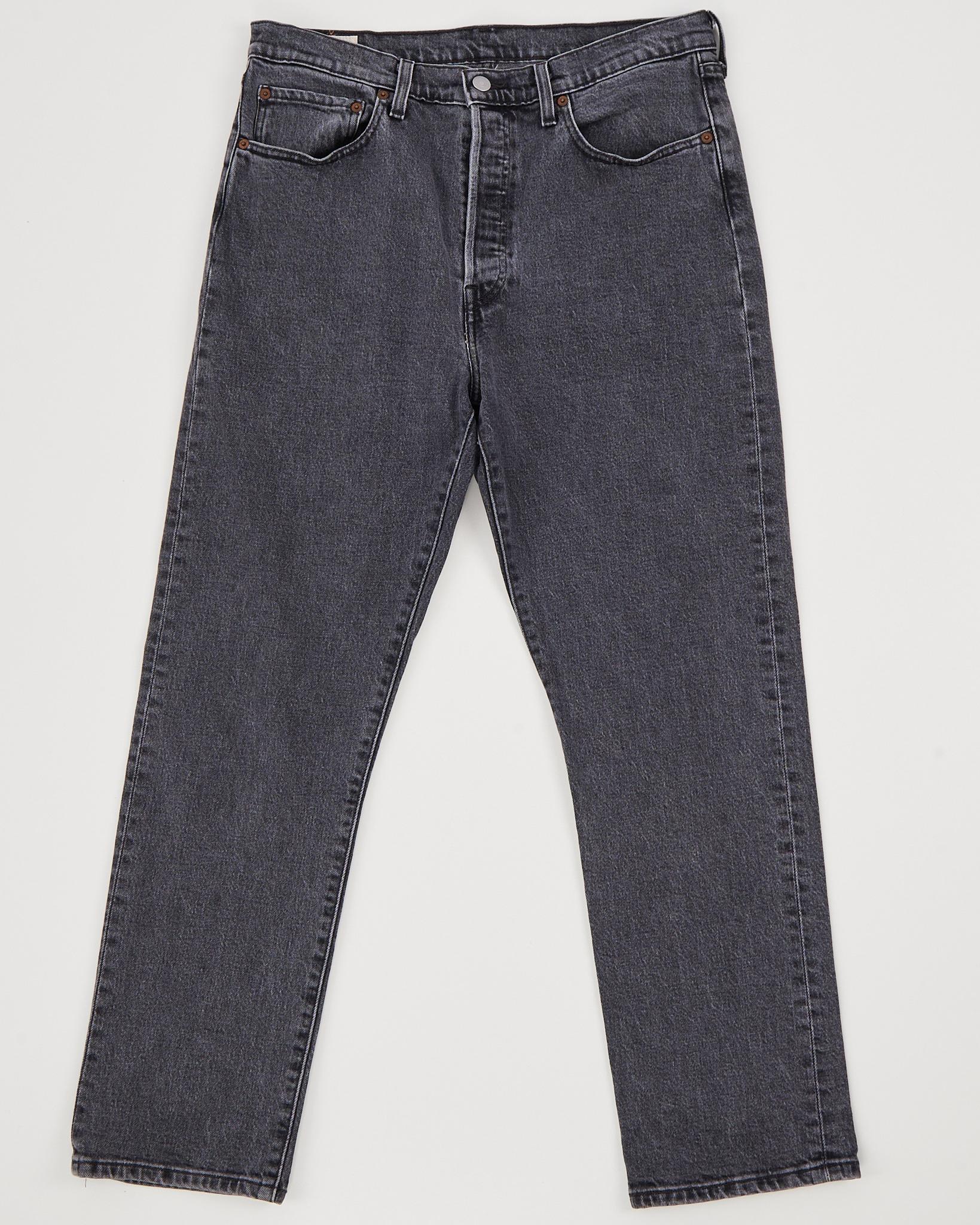 Серые джинсы Levi’s 501 в стиле casual. Плотный деним, классическая модель 501. Фирменные заклёпки, кожаный патч и узнаваемая строчка на кармане.