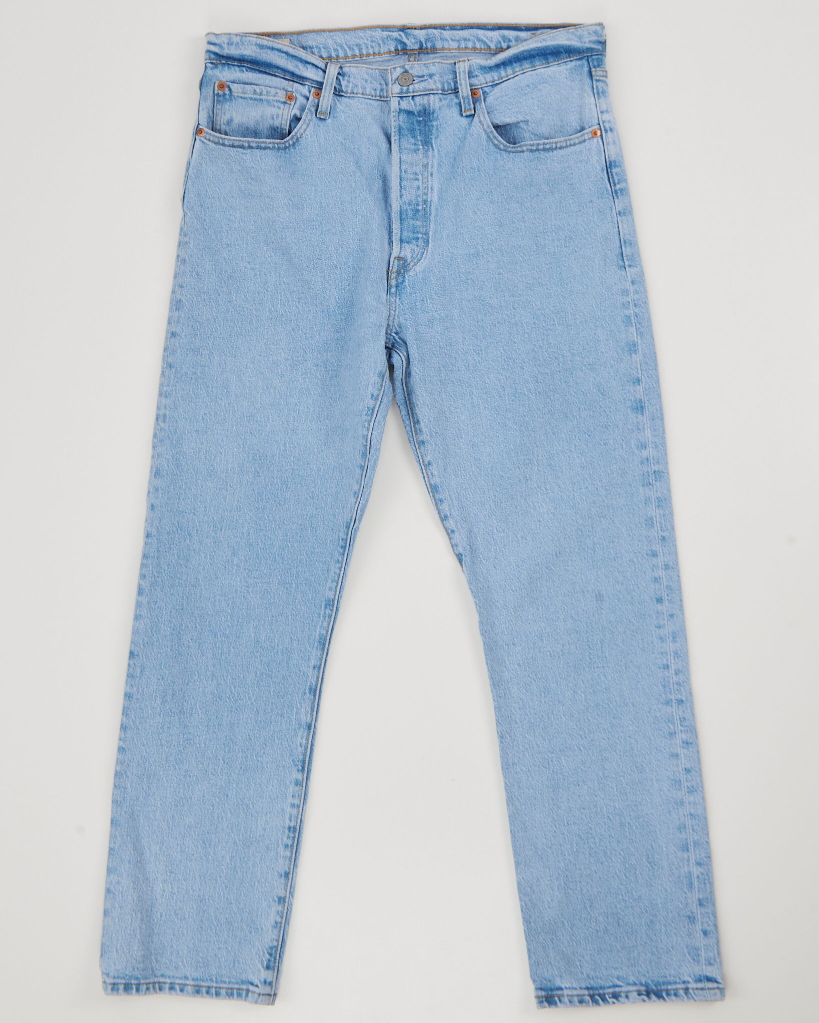 Джинсы Levi’s 501  из плотного денима. Классическая модель с прямой посадкой, светлый оттенок. Фирменные заклёпки, кожаный патч Levi’s.