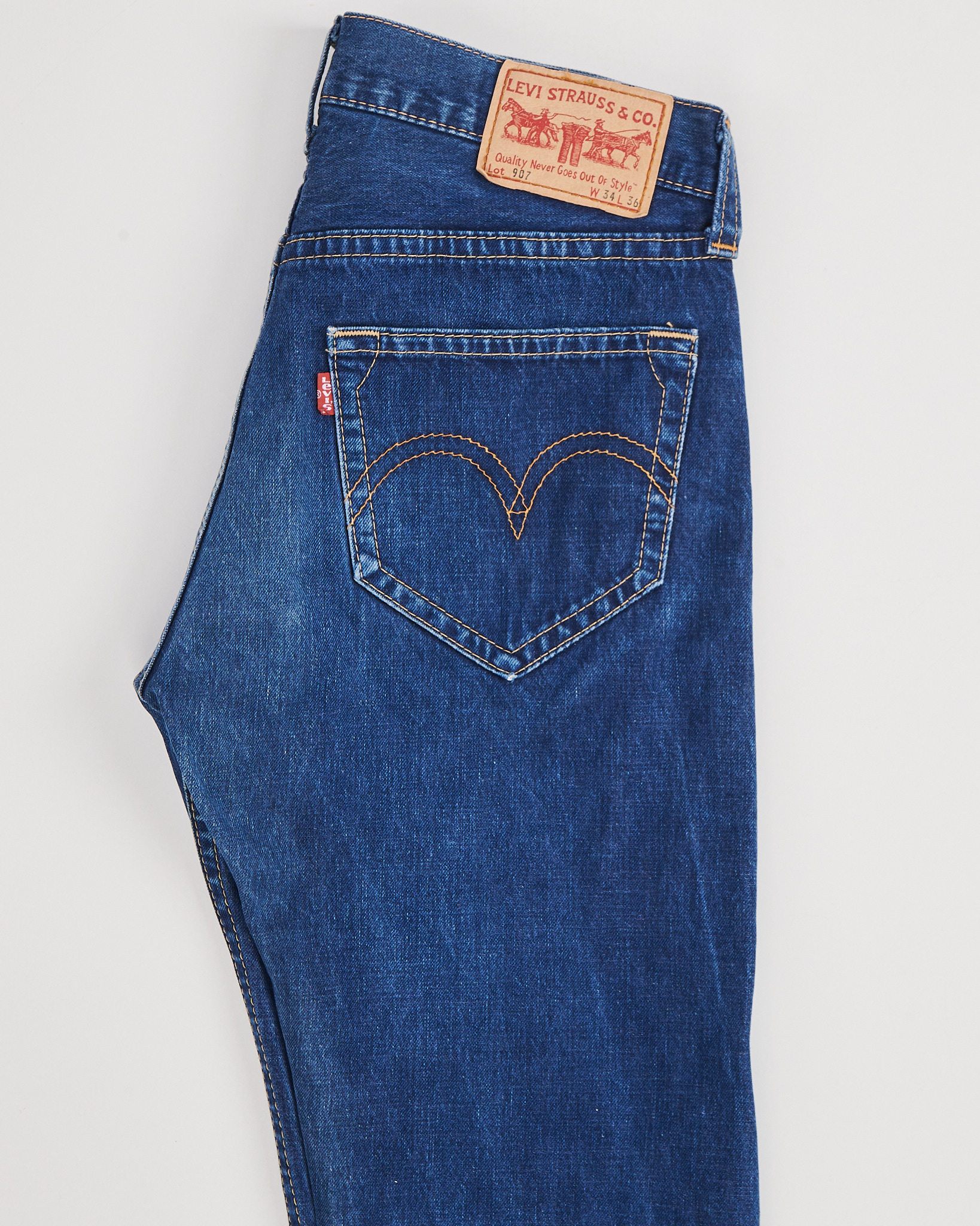 Джинсы Levi’s 907 из плотного денима Посадка средняя, крой прямой по бедру с небольшим расширением к низу. Акцент на фирменной строчке карманов и классической фурнитуре Levi’s.