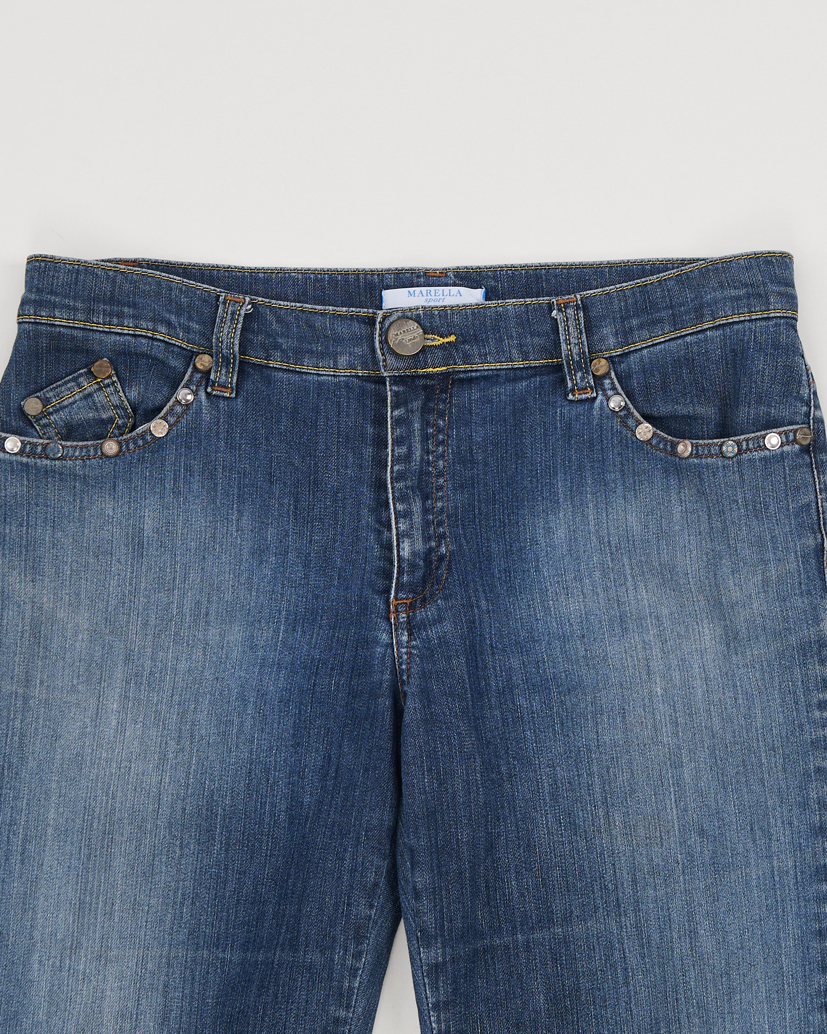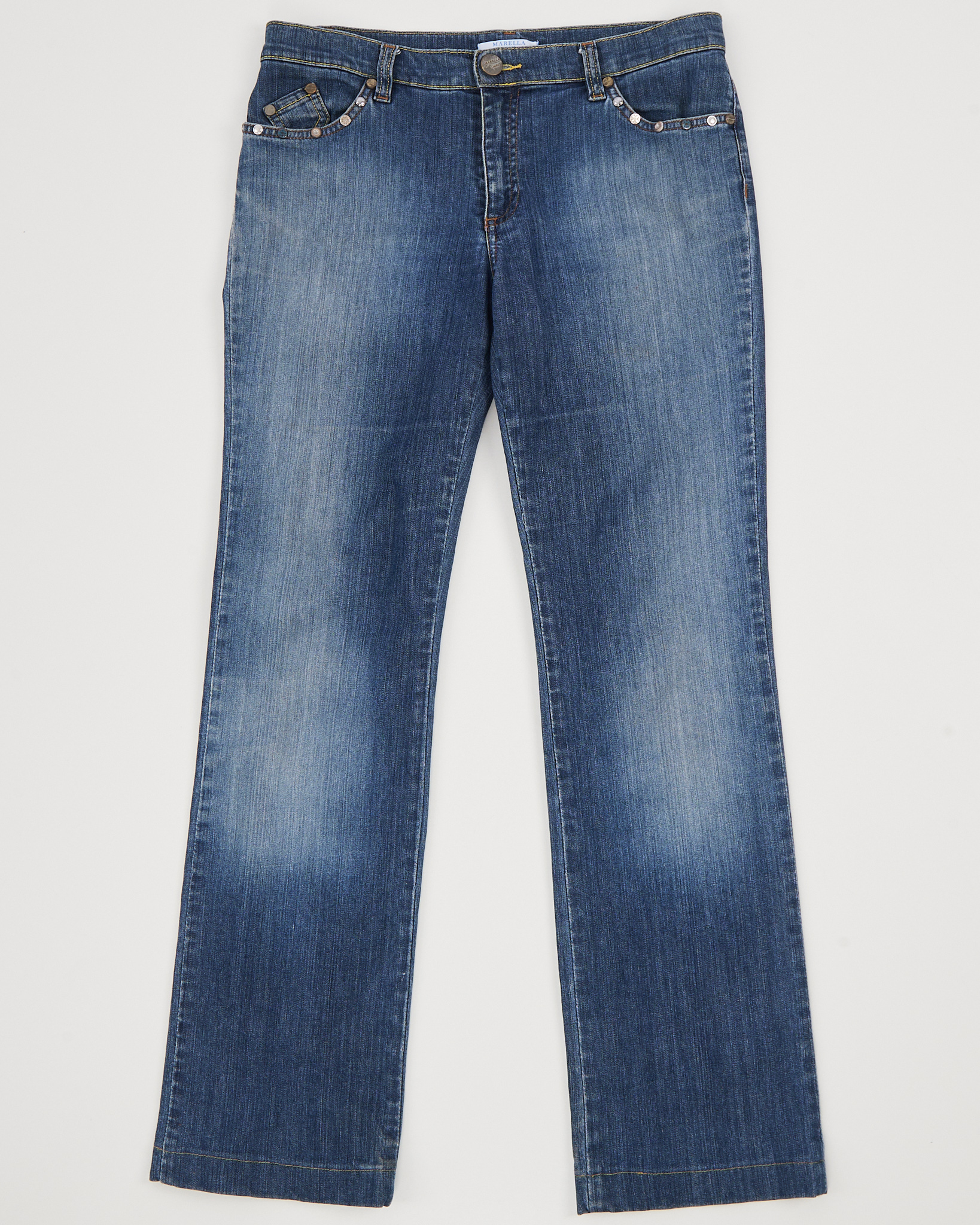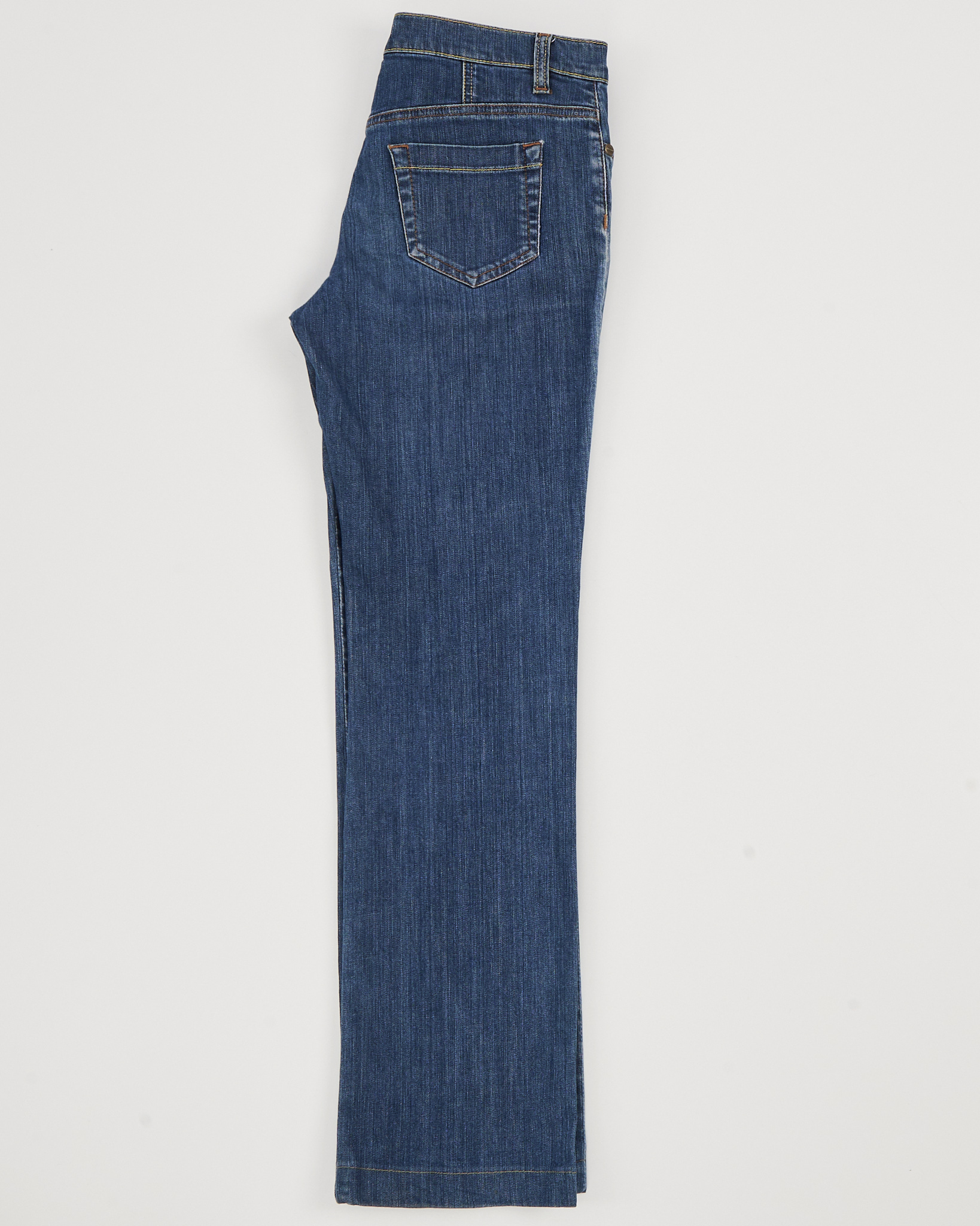 Джинсы из плотного хлопкового денима синего оттенка. Посадка средняя, линия талии фиксируется уверенно, крой прямой и вытягивает силуэт. Акцент на карманах с металлическим декором, лёгкий винтажный дистресс.