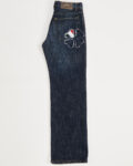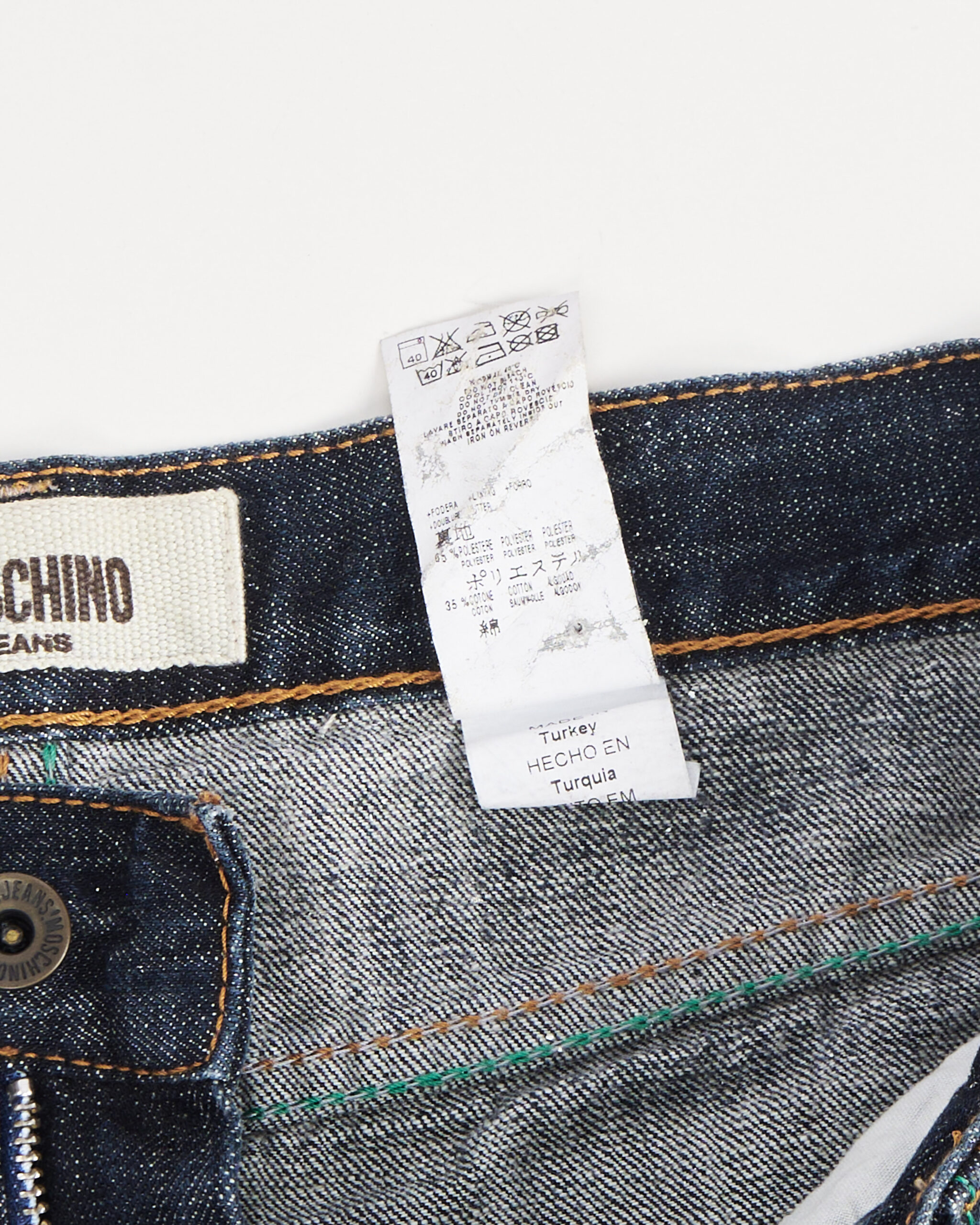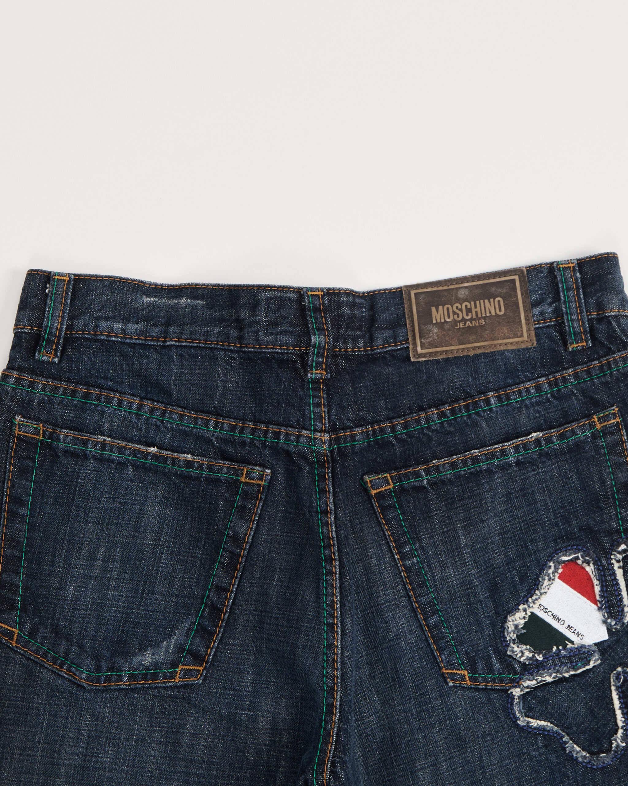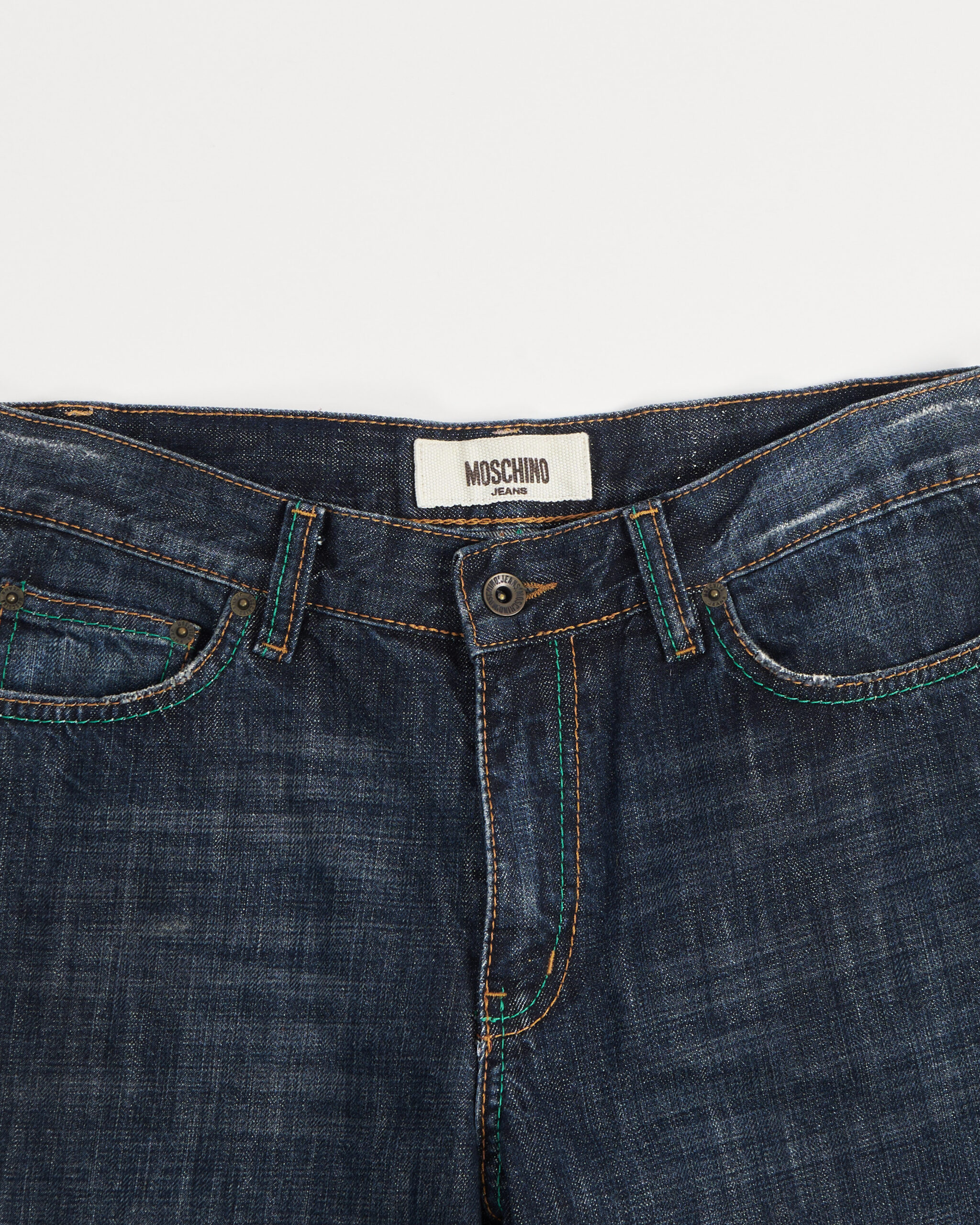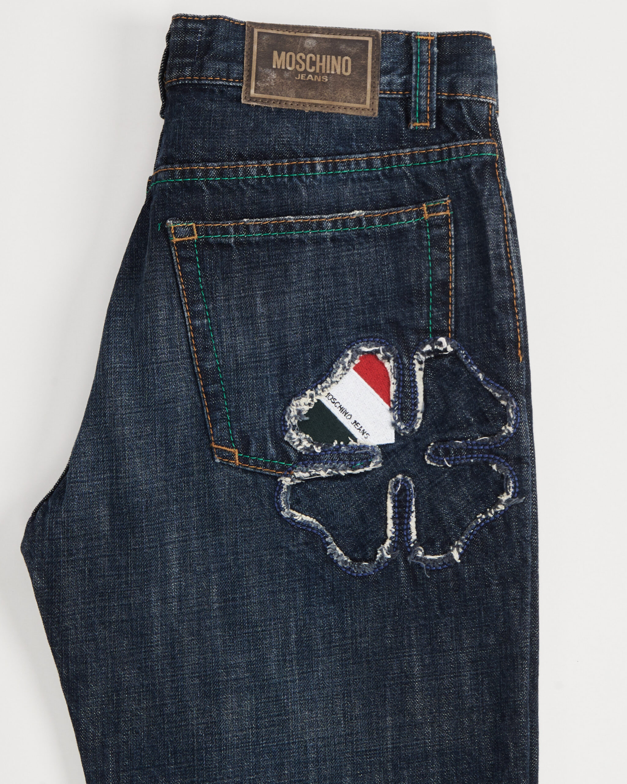 Очень комфортно и стильно сидят на фигуре. Синий деним с рыже-зеленой декоративной отстрочкой. Главная особенность — фирменный вышитый клевер с логотипом Moschino на правом заднем кармане.