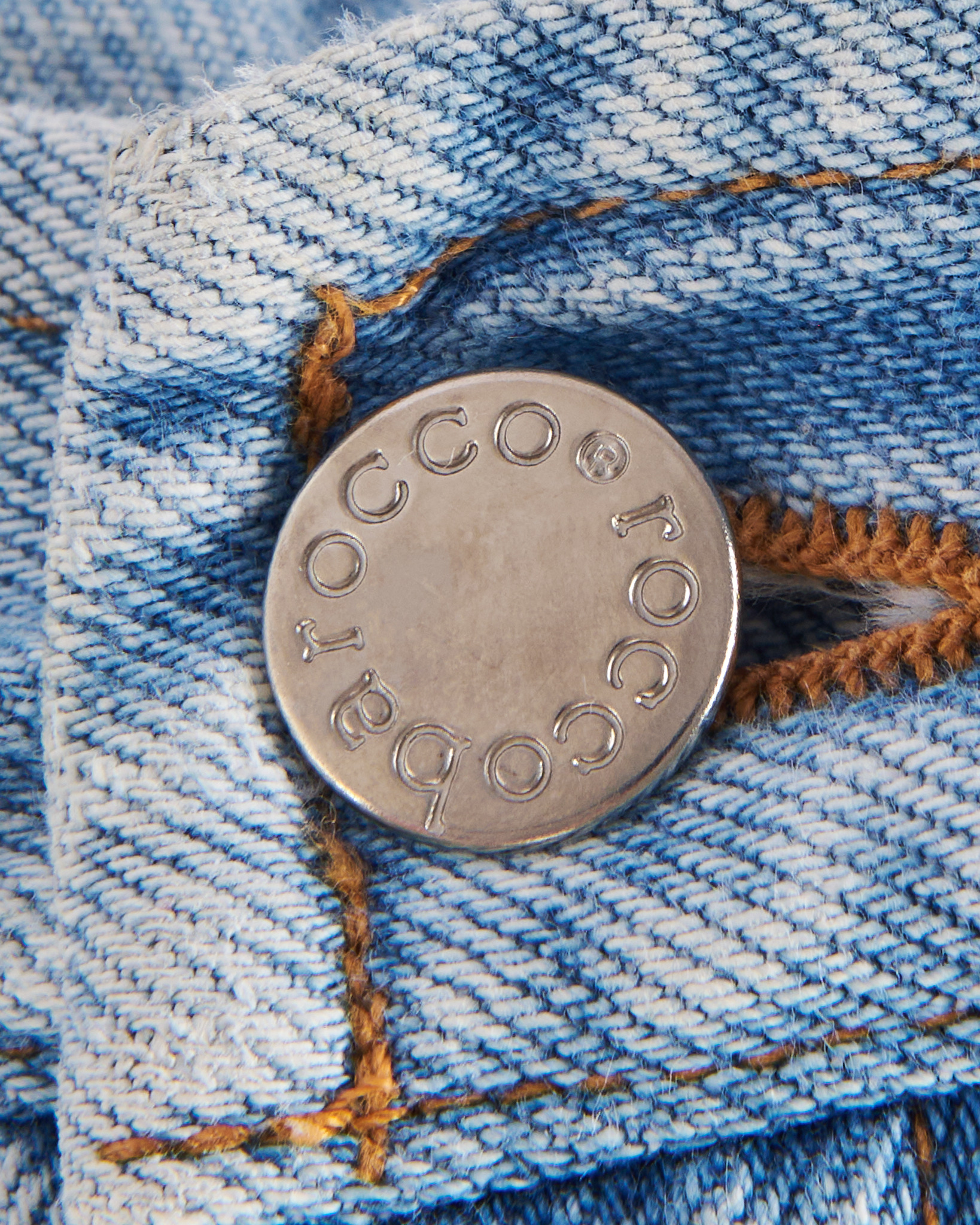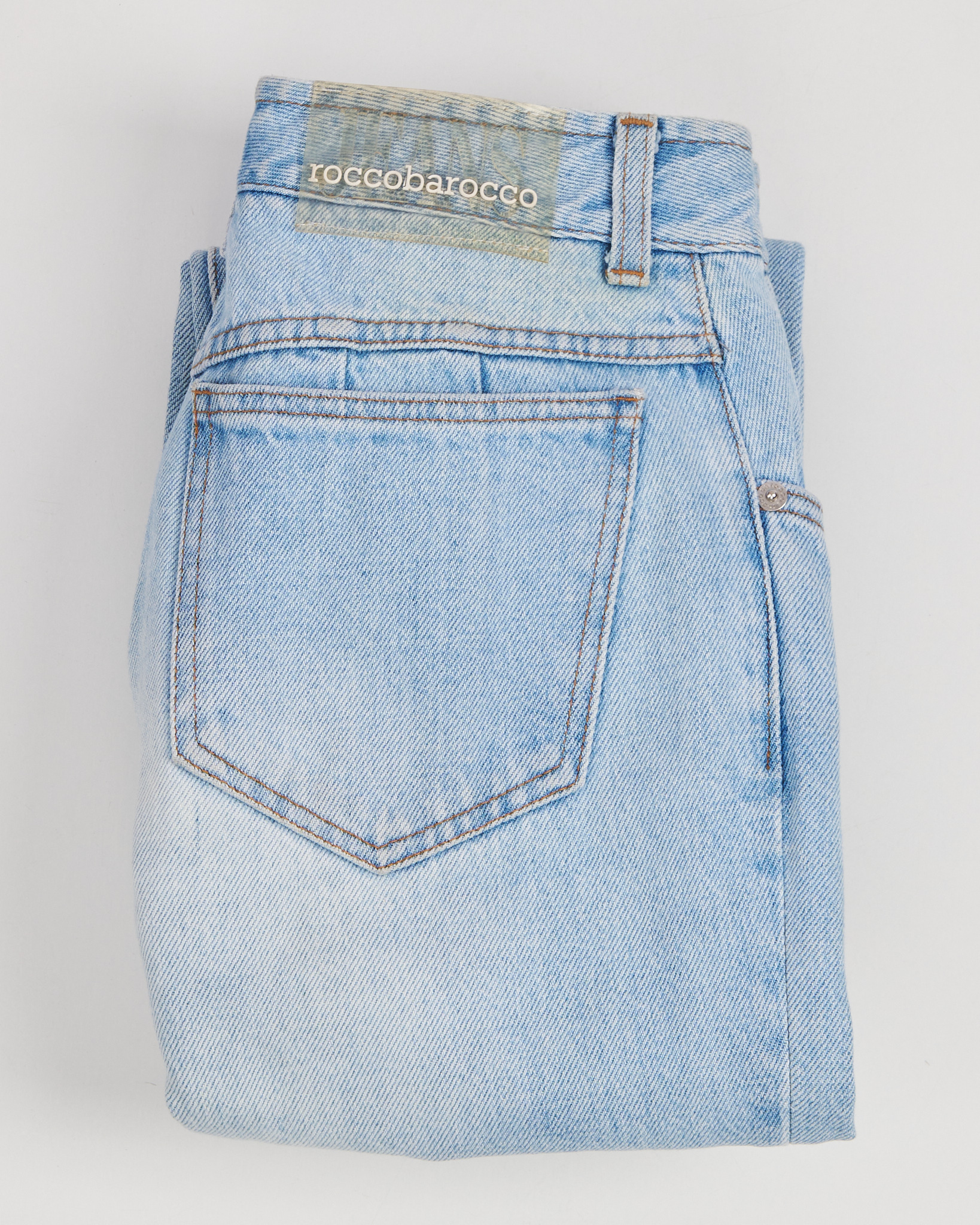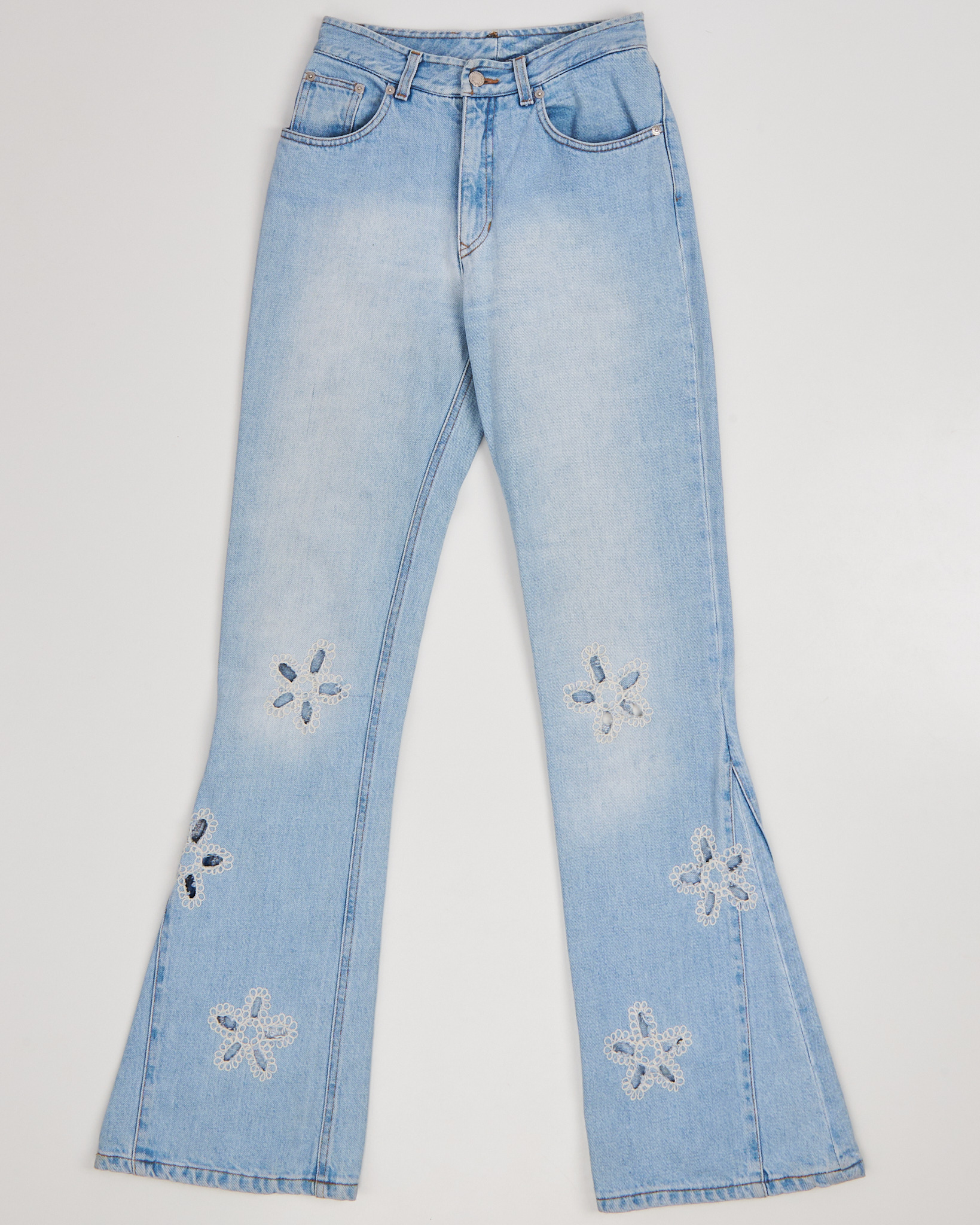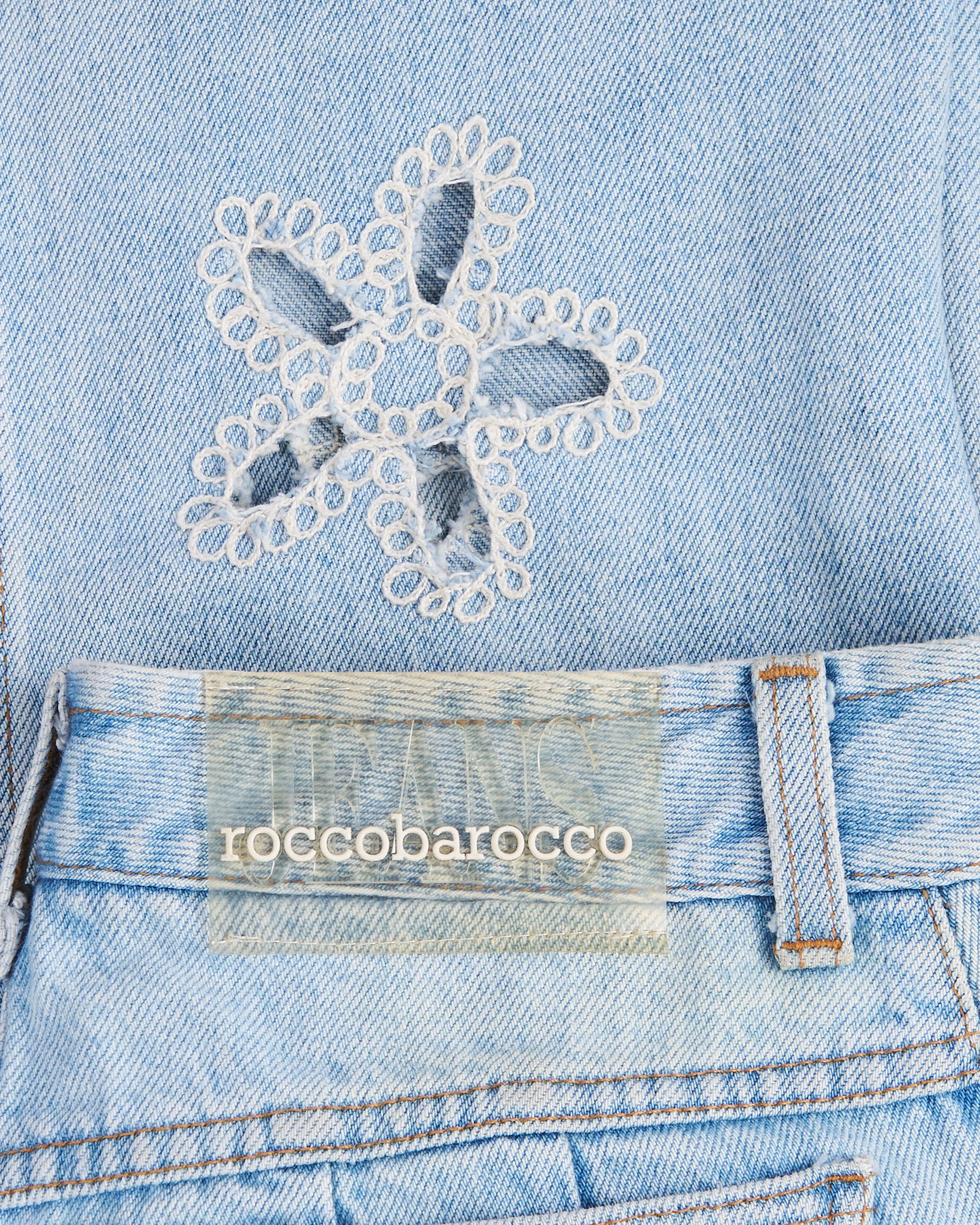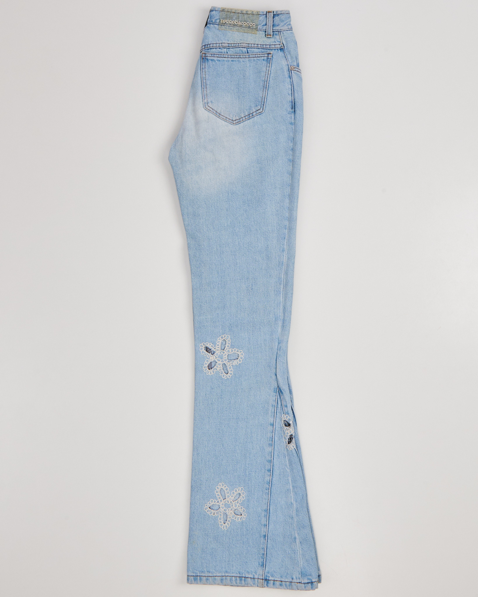 Джинсы Roccobarocco из светло-голубого денима с декоративной вышивкой в виде цветов. Модель с высокой посадкой и расклешёнными штанинами. Детали включают классические пять карманов, контрастную строчку и брендированную фурнитуру