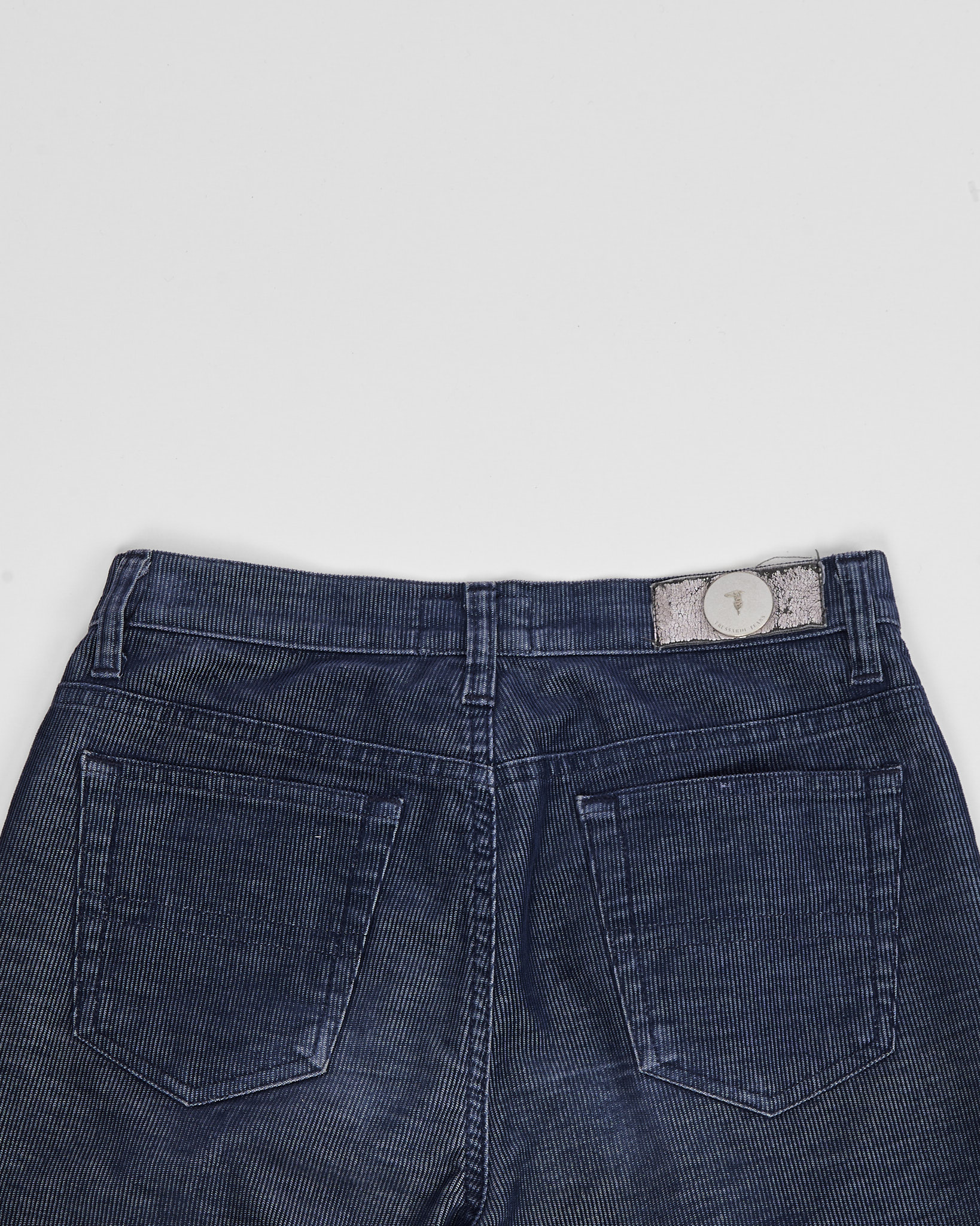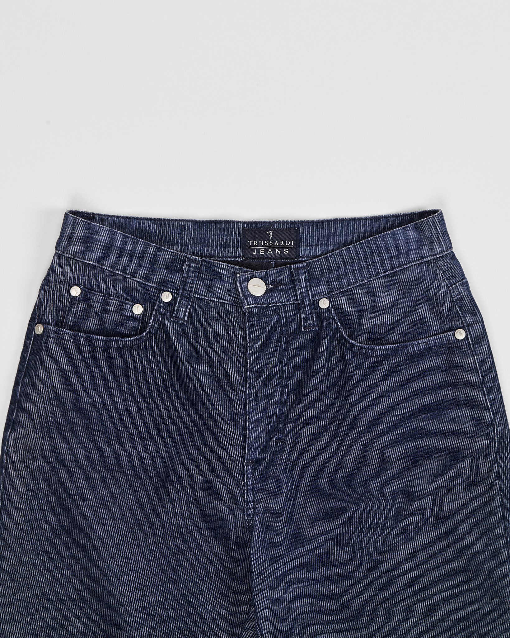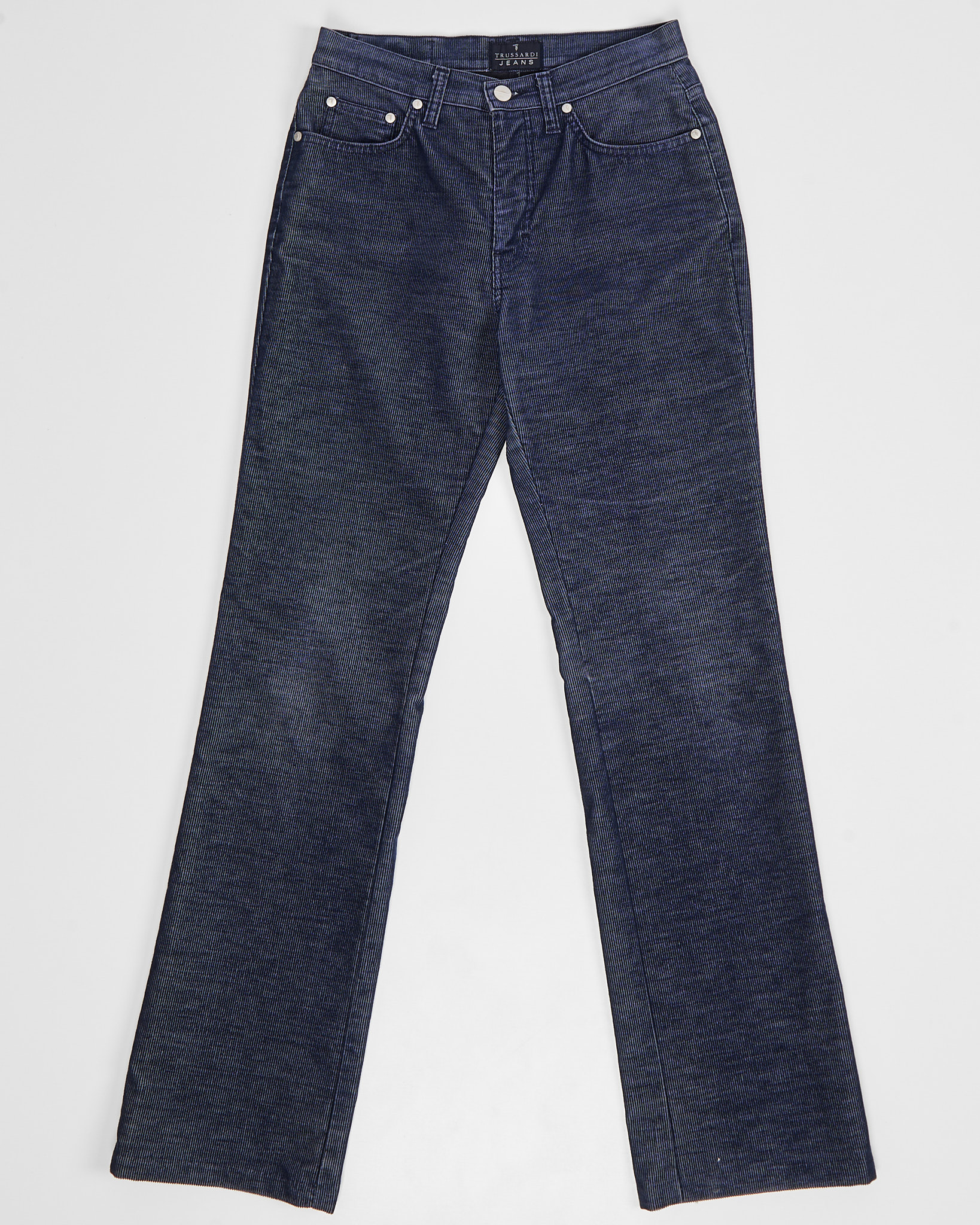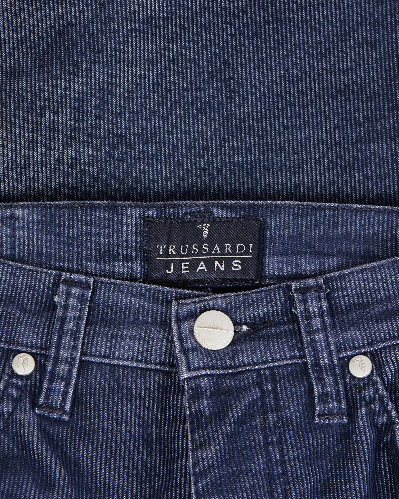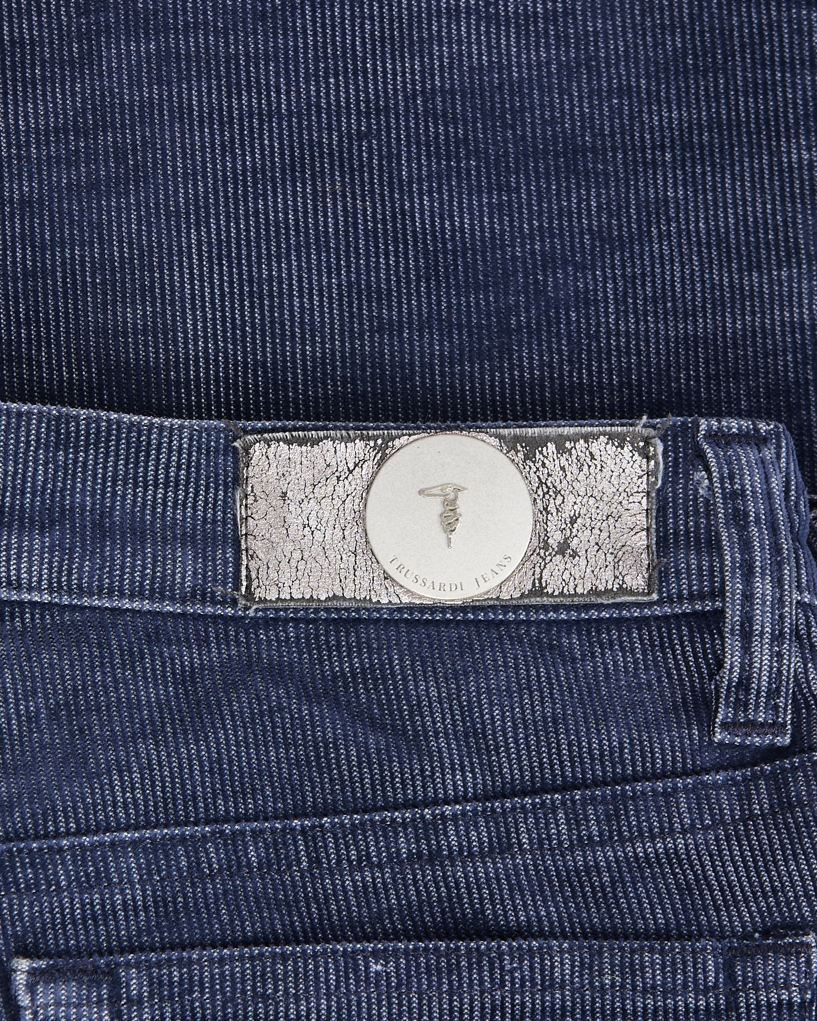 Джинсы Trussardi из 100% хлопка.  Классическая  посадка по фигуре. Серебристый патч с логотипом бренда на поясе.