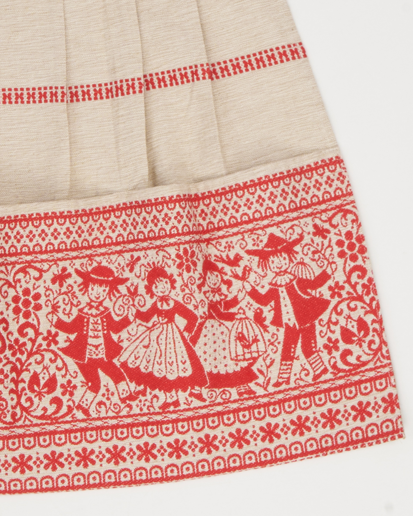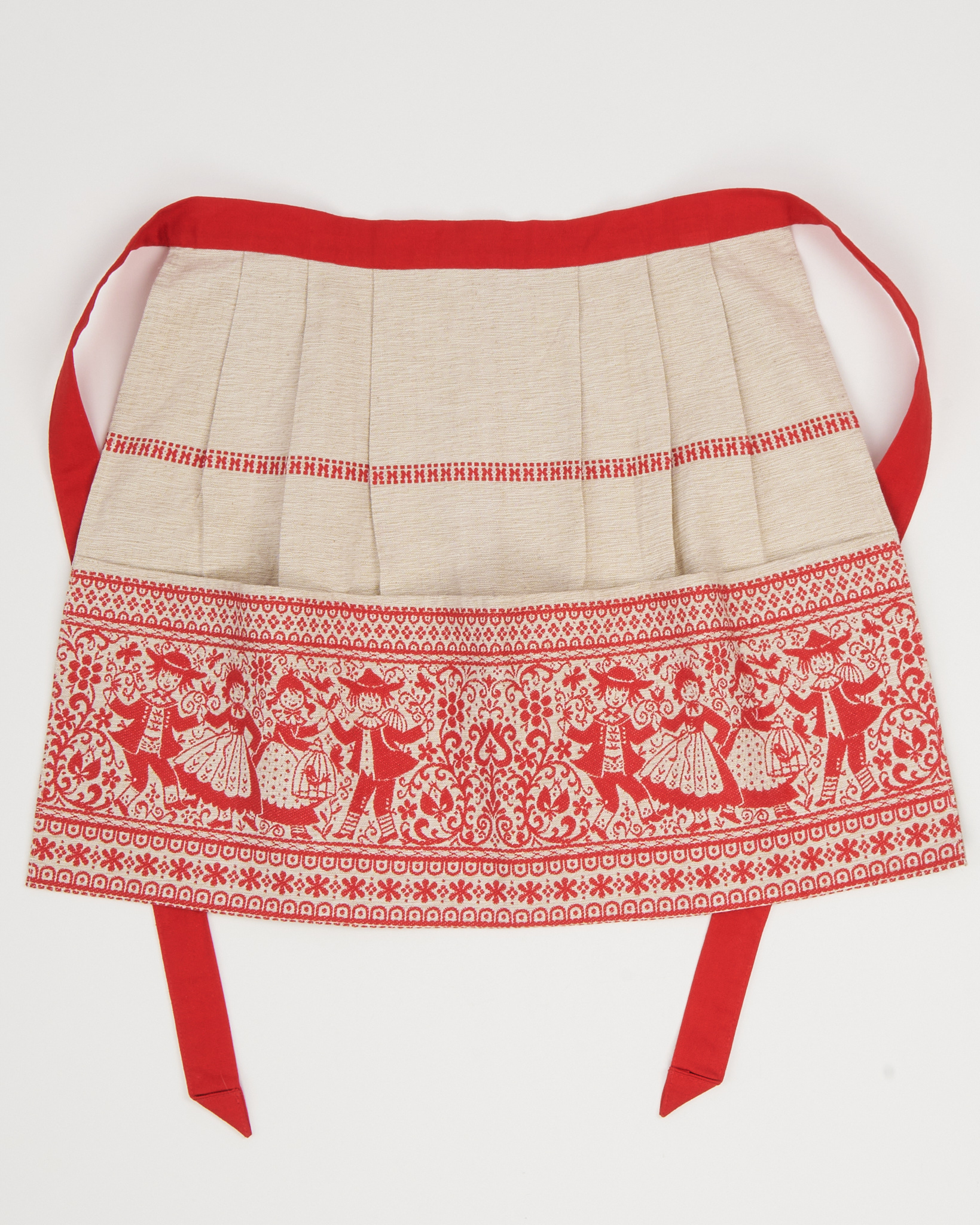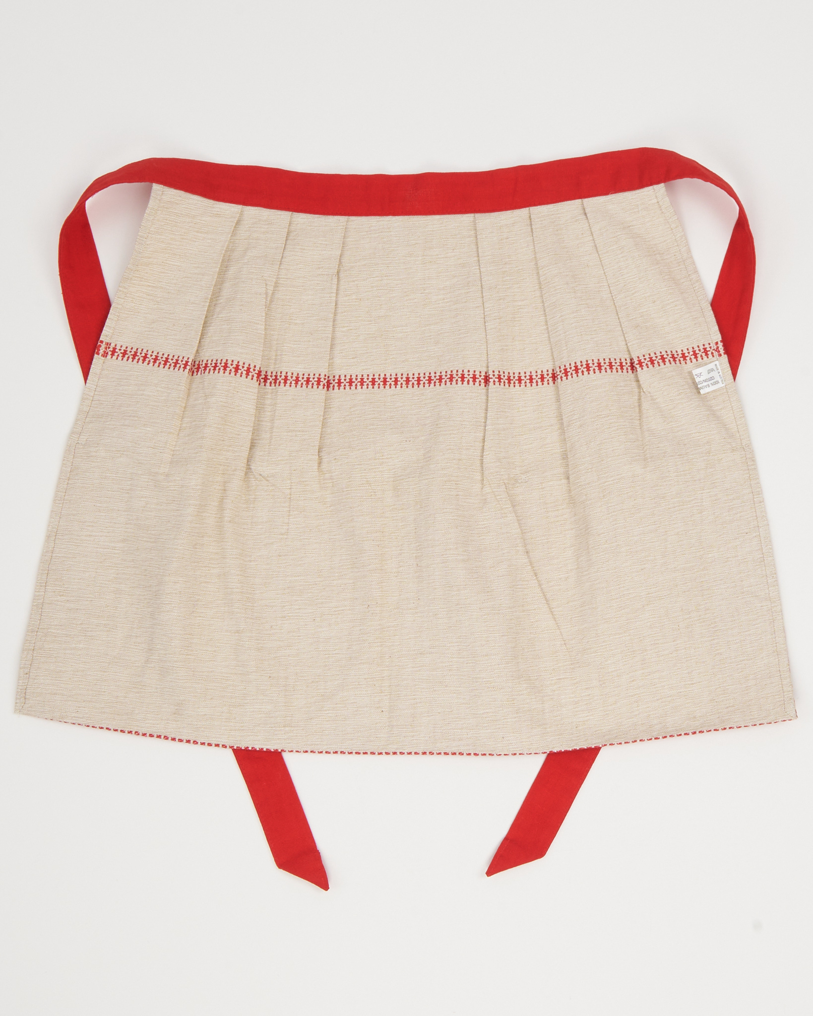 Фартук выполнен из хлопка в натуральном оттенке с контрастной красной отделкой. Посадка регулируется за счёт длинных завязок. Нижняя часть украшена орнаментом с сюжетными фигурами.