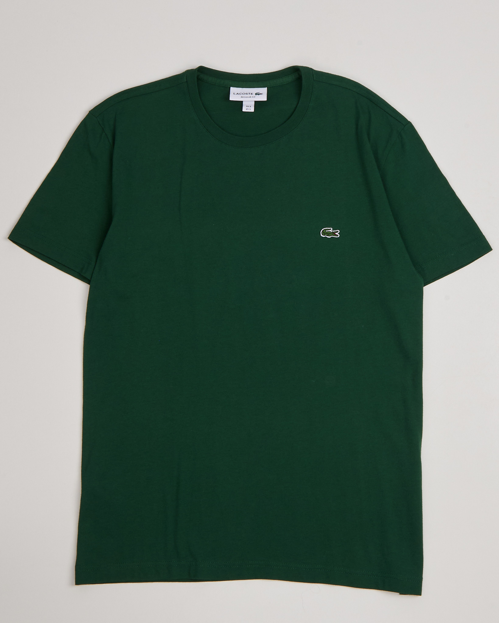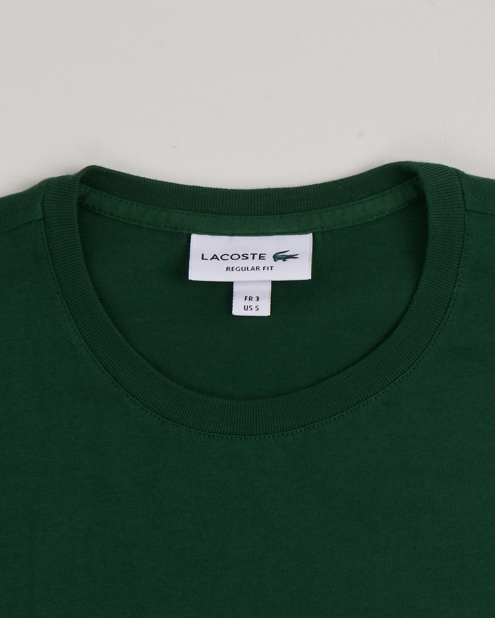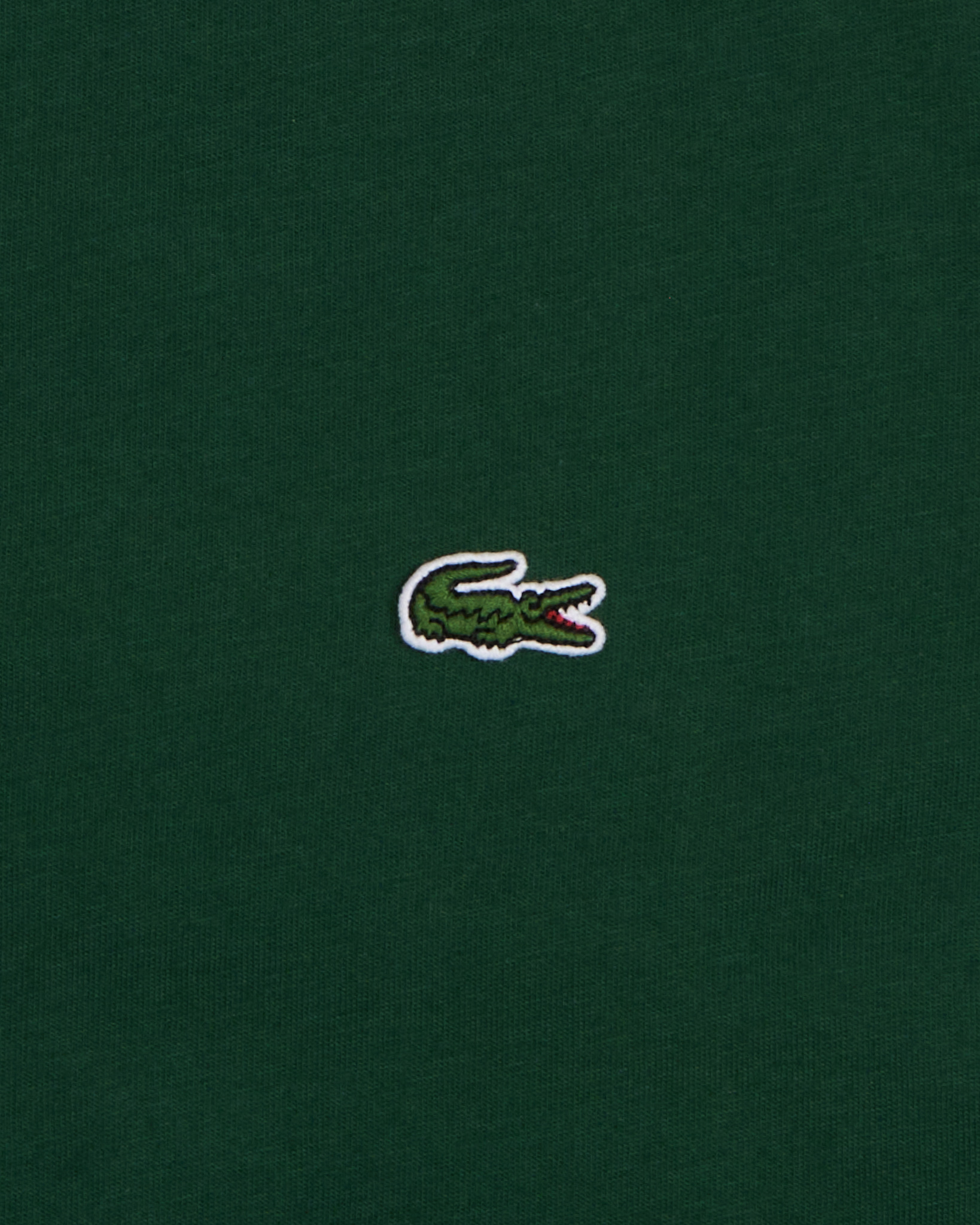 Футболка из мягкого хлопкового трикотажа от Lacoste. Материал гладкий, приятный к телу, с лёгкой плотностью и ровной поверхностью. Классический круглый вырез. Небольшой вышитый логотип на груди