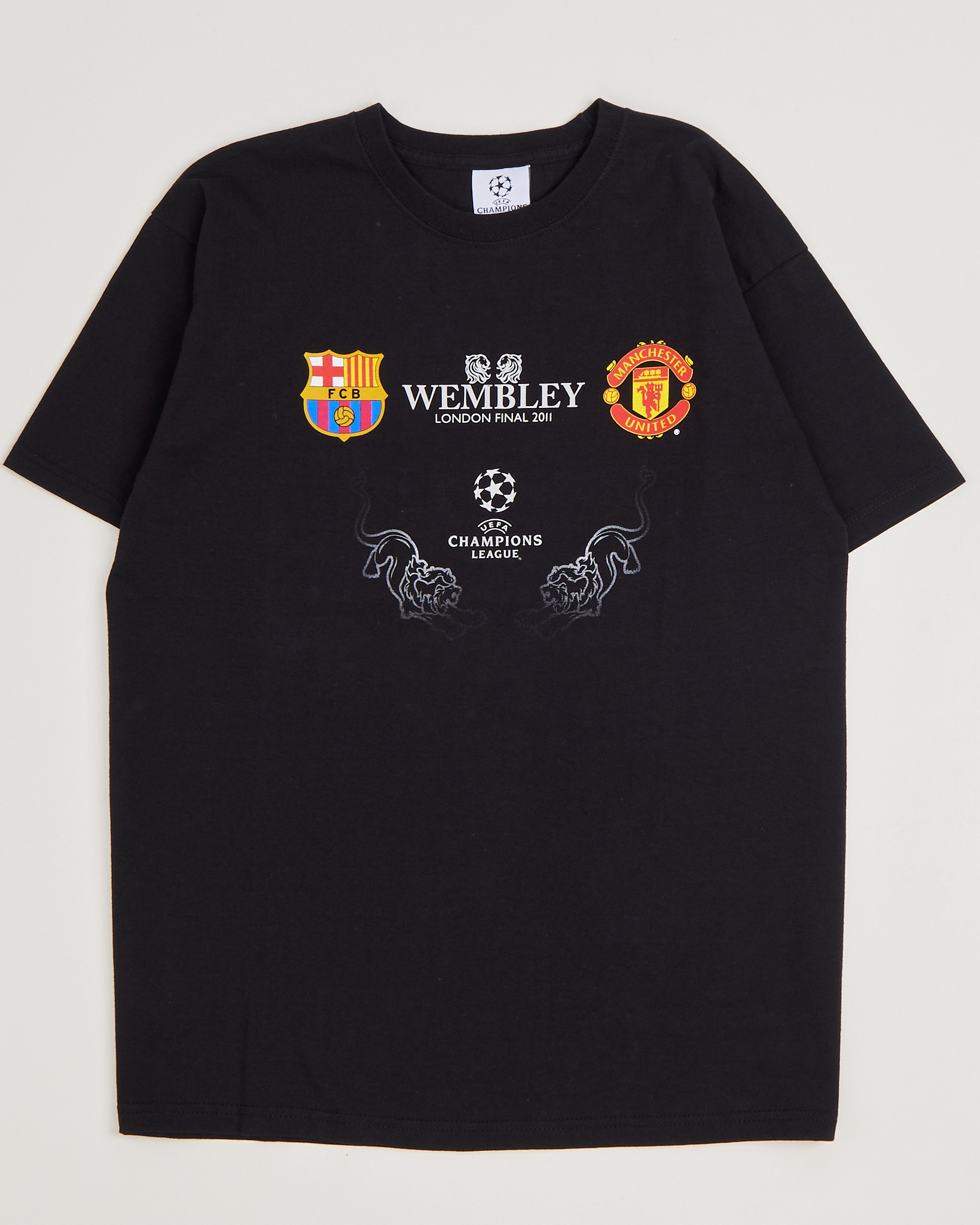 Футболка из хлопкового трикотажа от бренда UEFA Champions League. Прямой крой, свободная посадка. Фронтальный принт с символикой финала Wembley 2011 и эмблемами клубов.