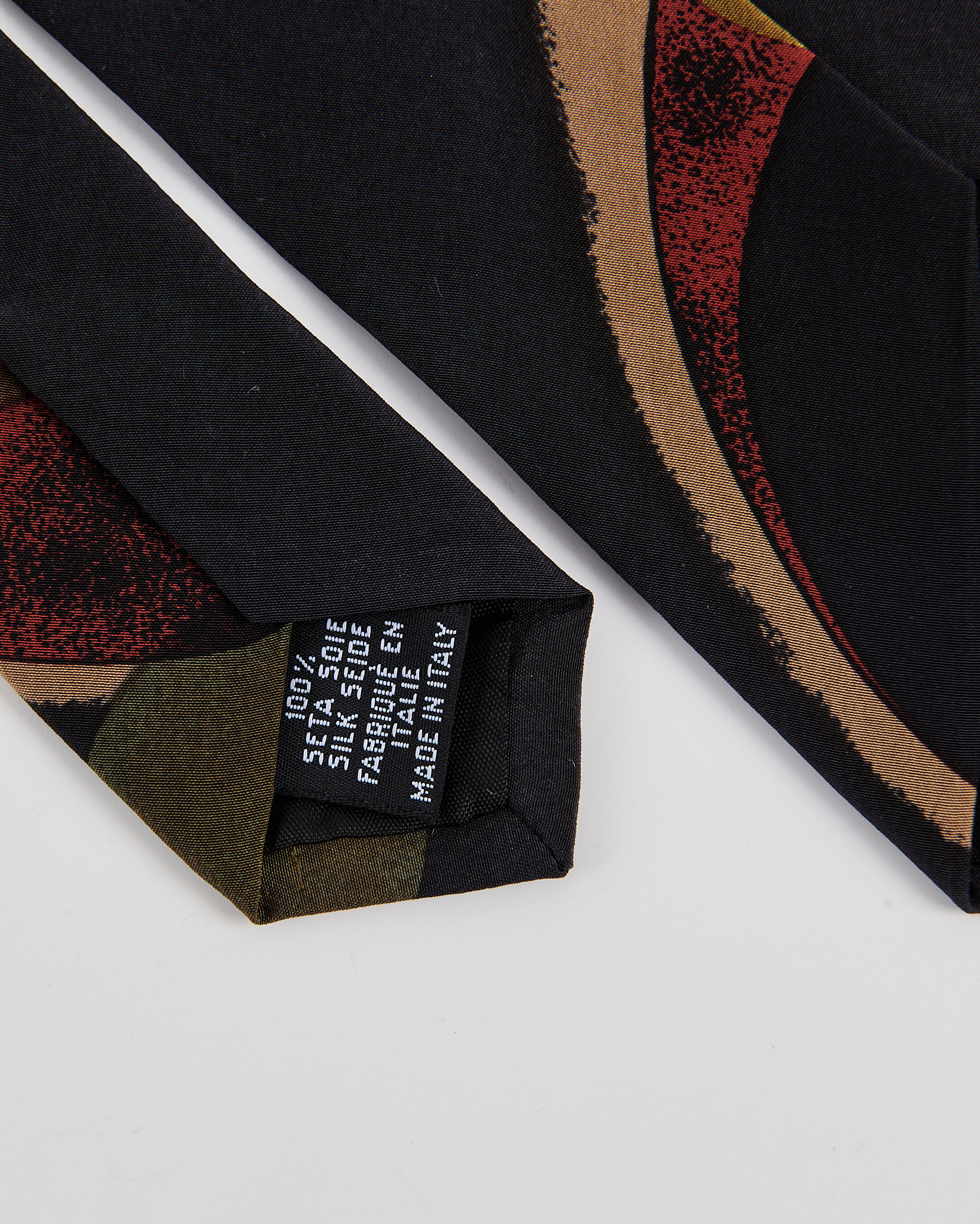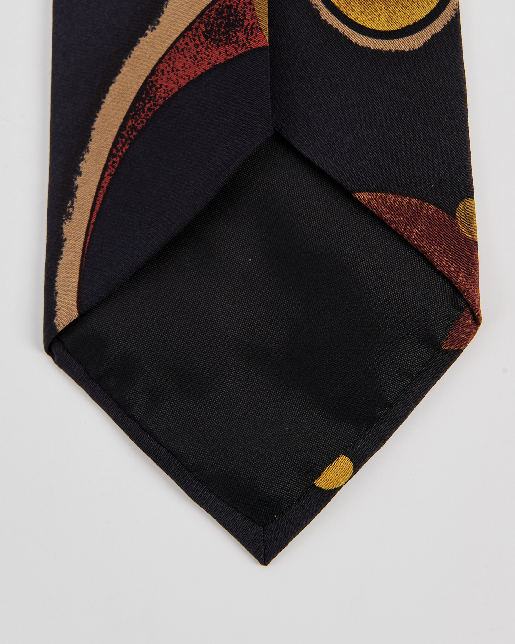 Галстук  из гладкого шелка. Глубокий темный фон дополнен абстрактными кругами в теплых оттенках.
