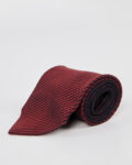 Галстук из 100% шелка с диагональным рисунком и плавным переходом оттенков от алого к глубокому бордовому. Абстрактный узор с кругами, сочетание насыщенного цвета и редкого дизайнерского рисунка