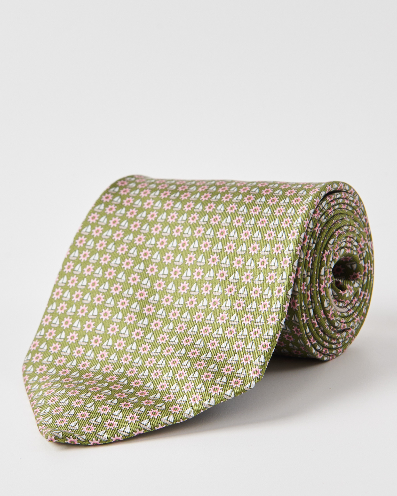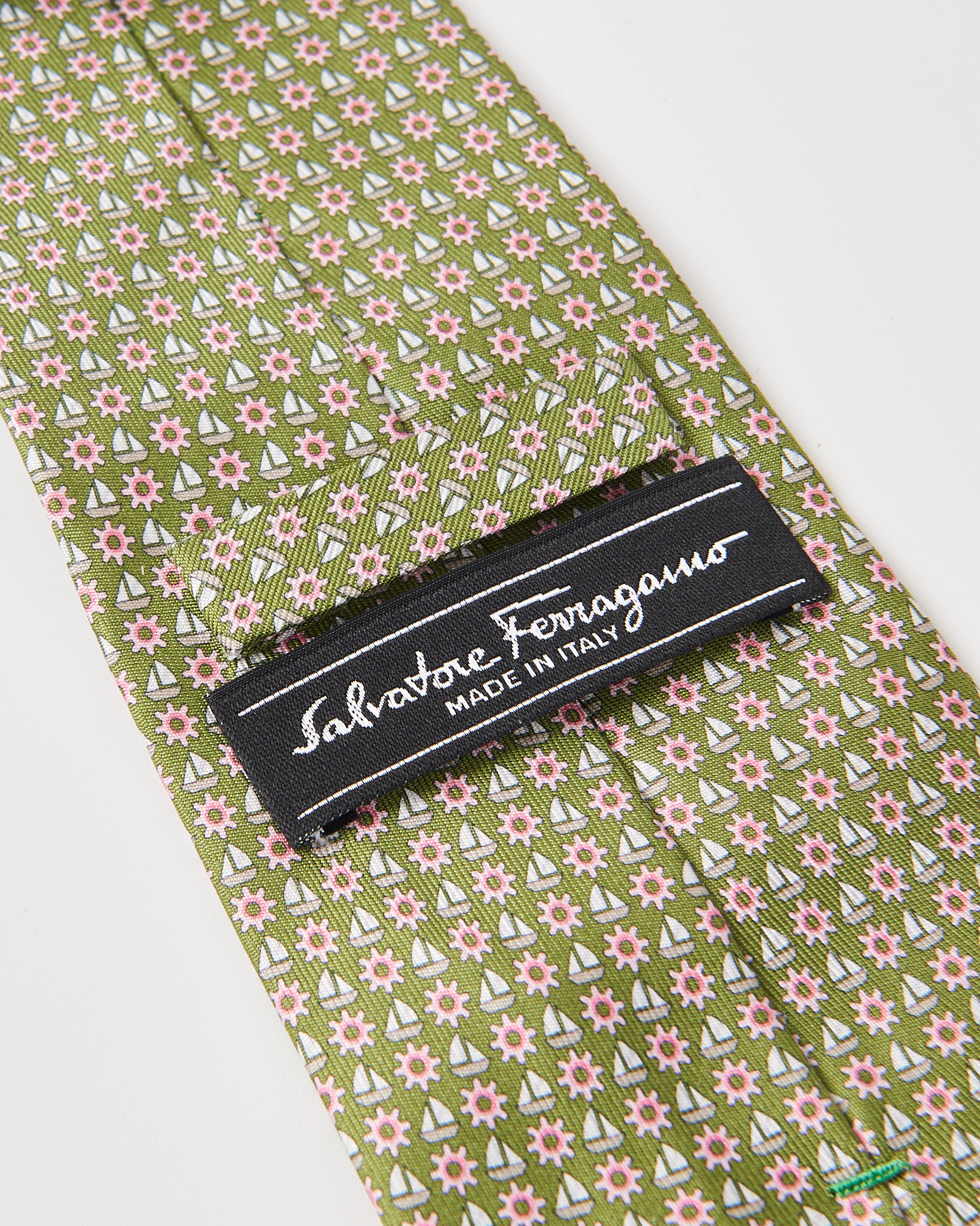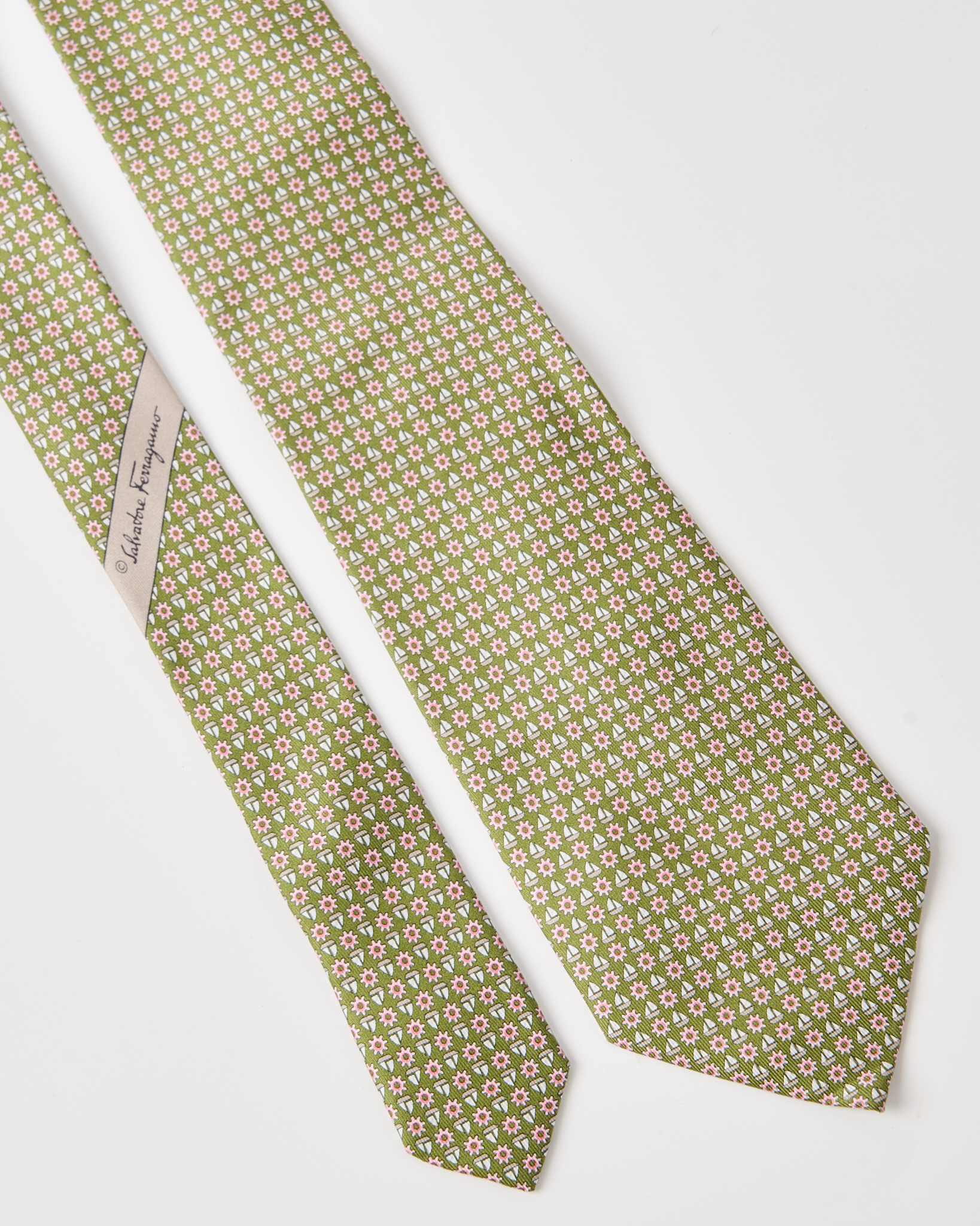Галстук Salvatore Ferragamo из 100% шелка в зелёном оттенке с мелким графичным узором в розовых и белых тонах. Выполнен из шелка, ложится аккуратно.