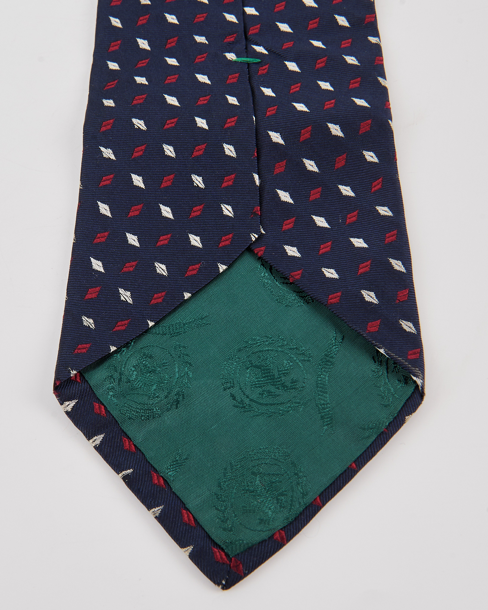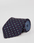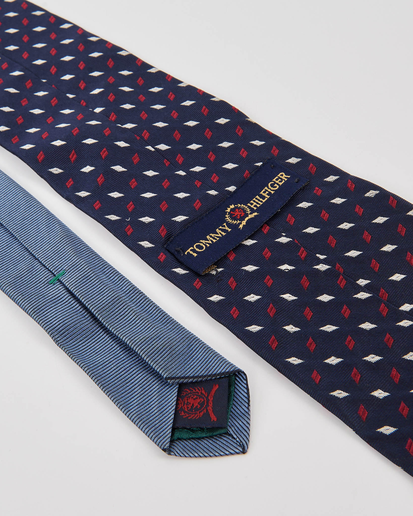 Галстук Tommy Hilfiger из шелка с геометрическим рисунком в красно-белых тонах на темно-синем фоне. Контрастный узор, фирменная подкладка и аккуратная обработка.