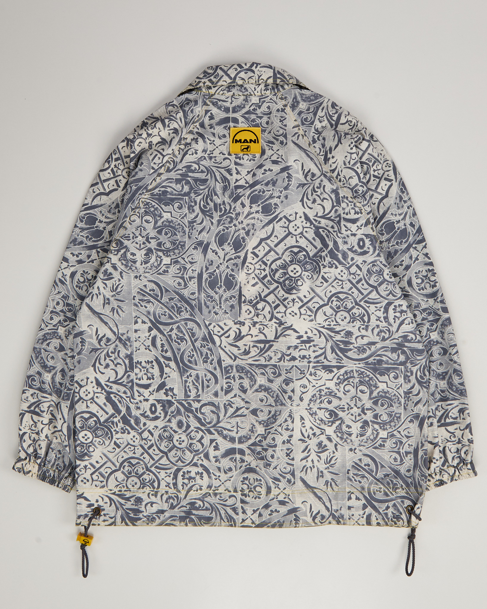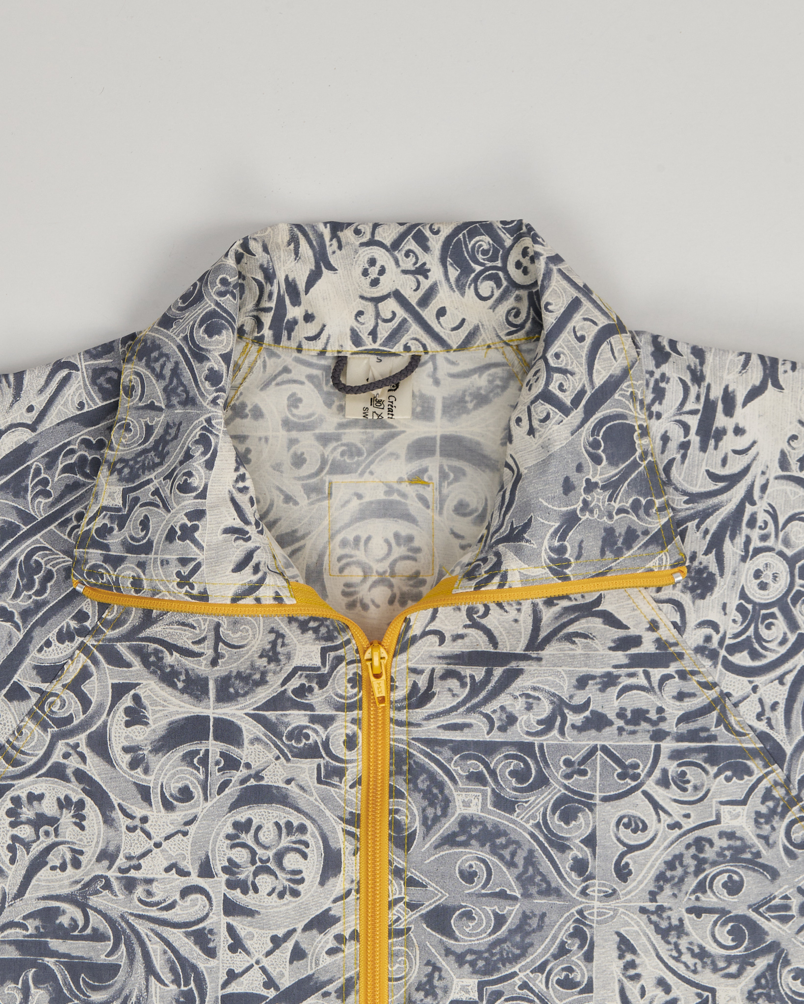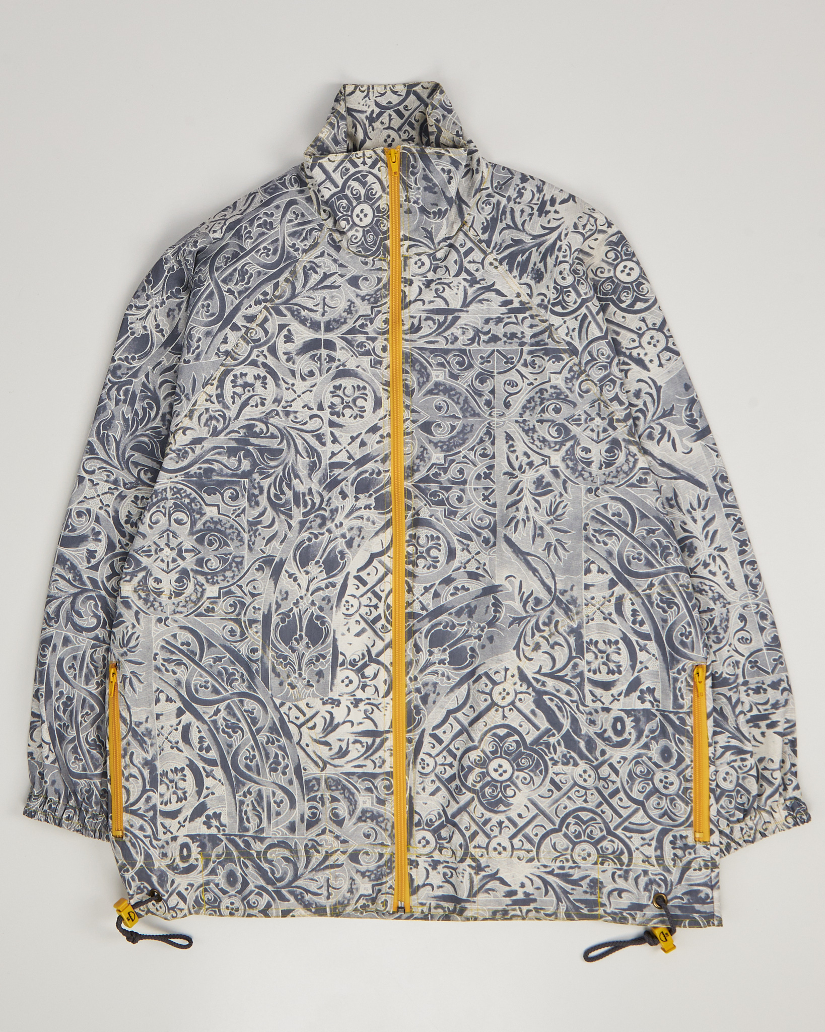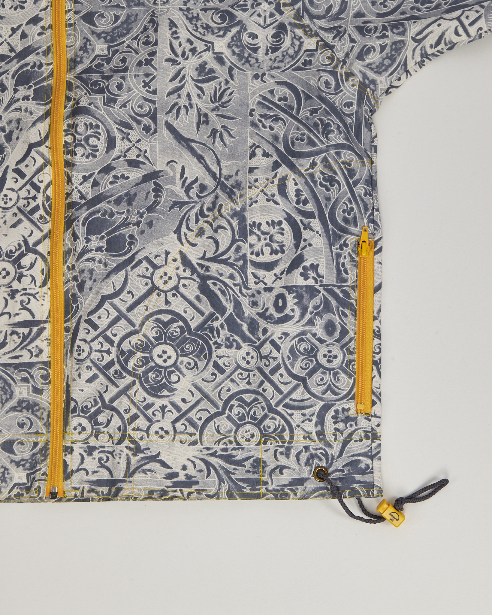 Легкая куртка из 100% хлопка. Материал тактильно приятный, держит форму. Посадка прямая, рукава реглан. Контрастный рисунок в сером оттенке, застежка на молнию, функциональные карманы по бокам и кулиска внизу.