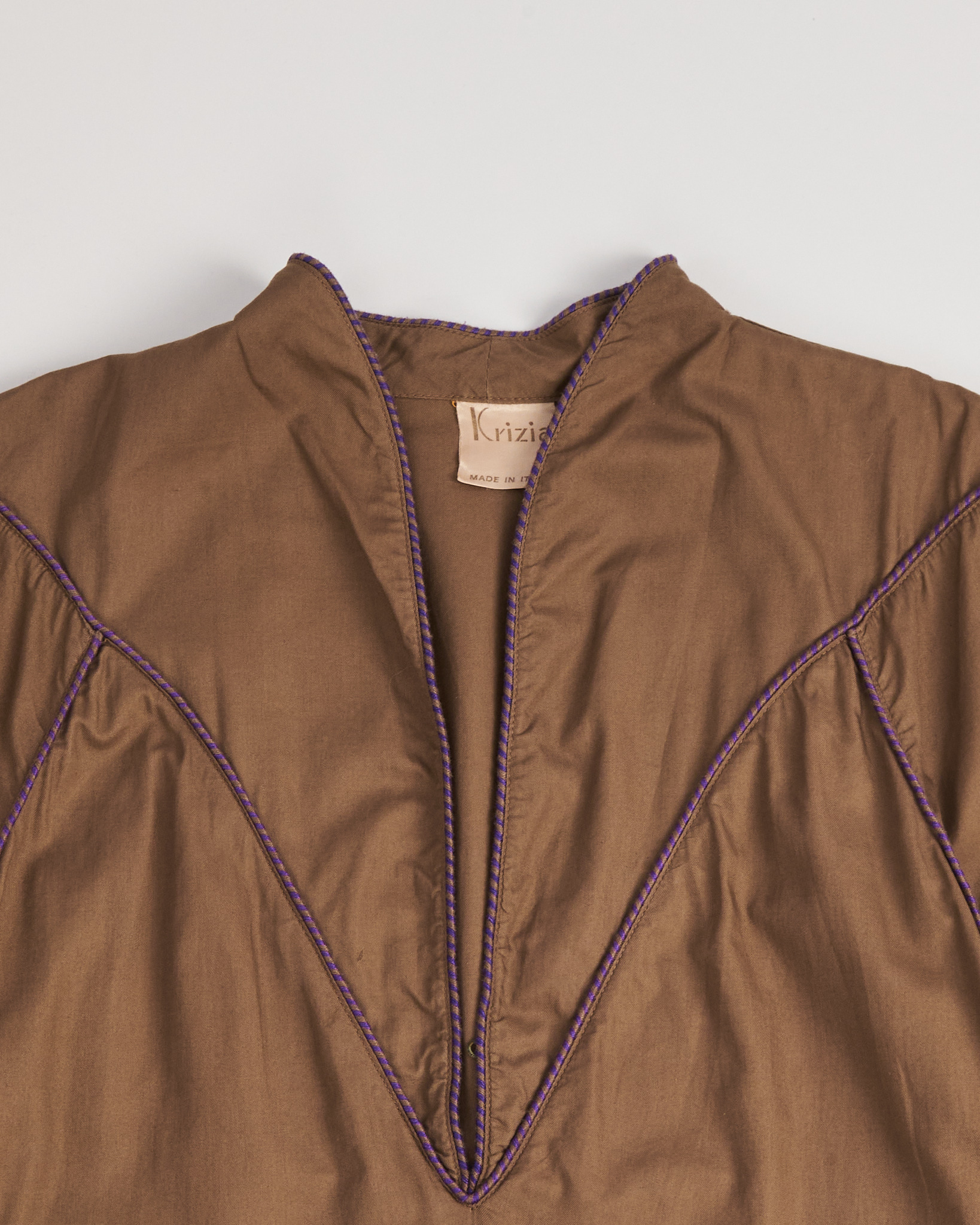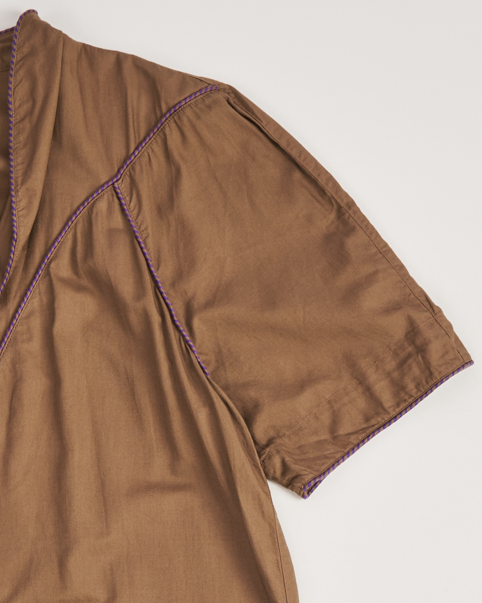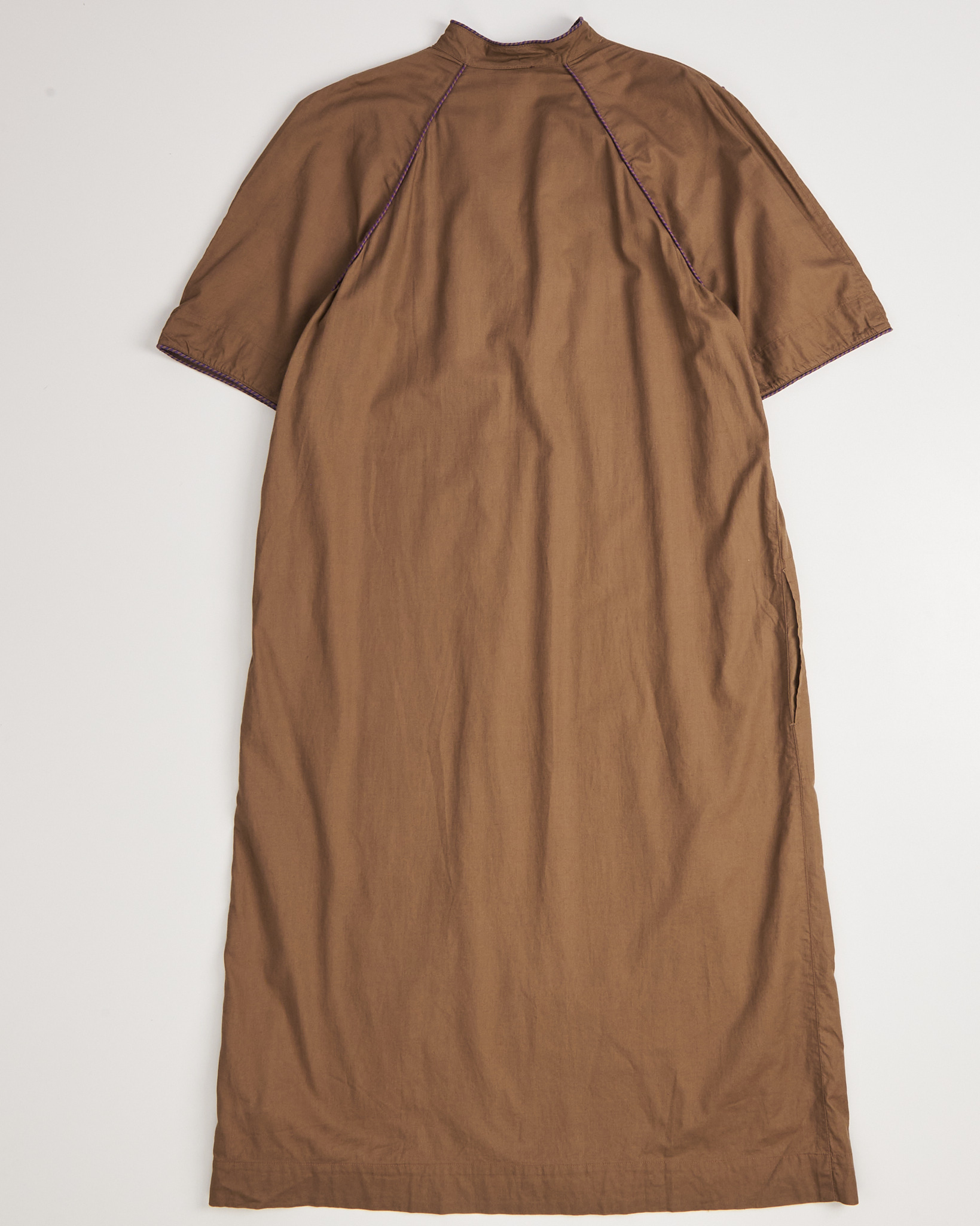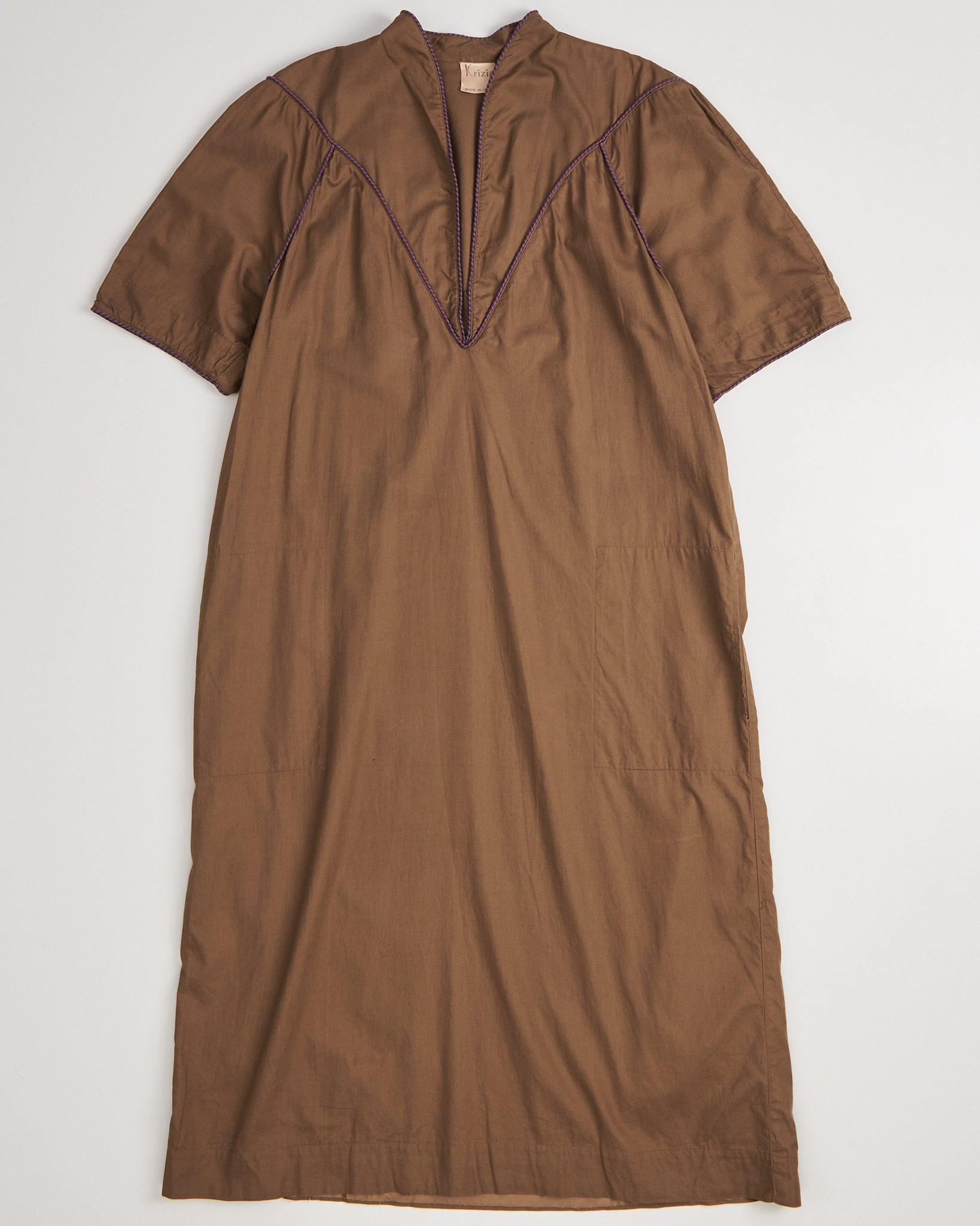 Платье из 100% хлопка в коричневом цвете. Материал мягкий на ощупь, комфортно ощущается в носке. Посадка свободная, прямой крой. Акцентная окантовка в зоне декольте, застежка на крючок на груди.