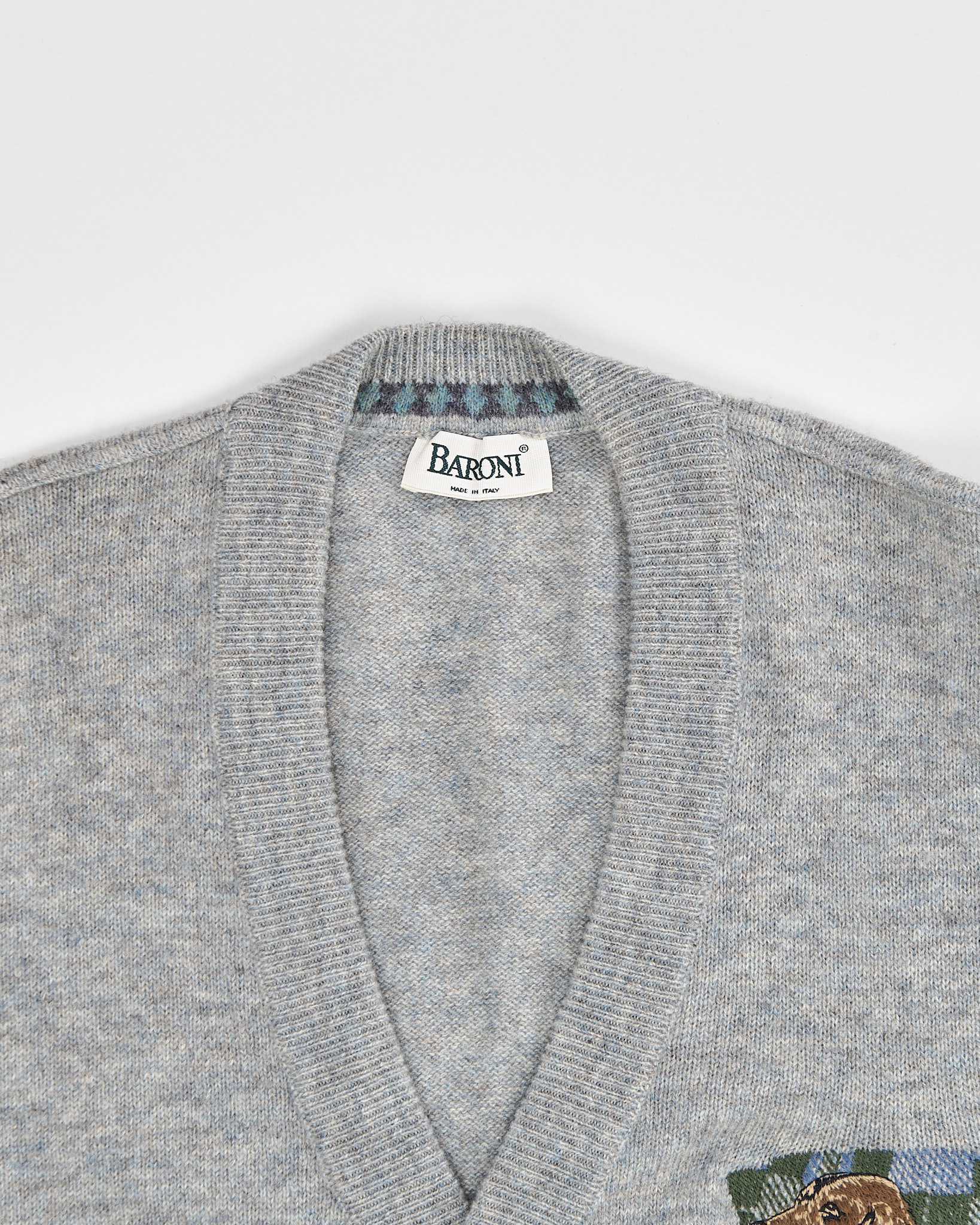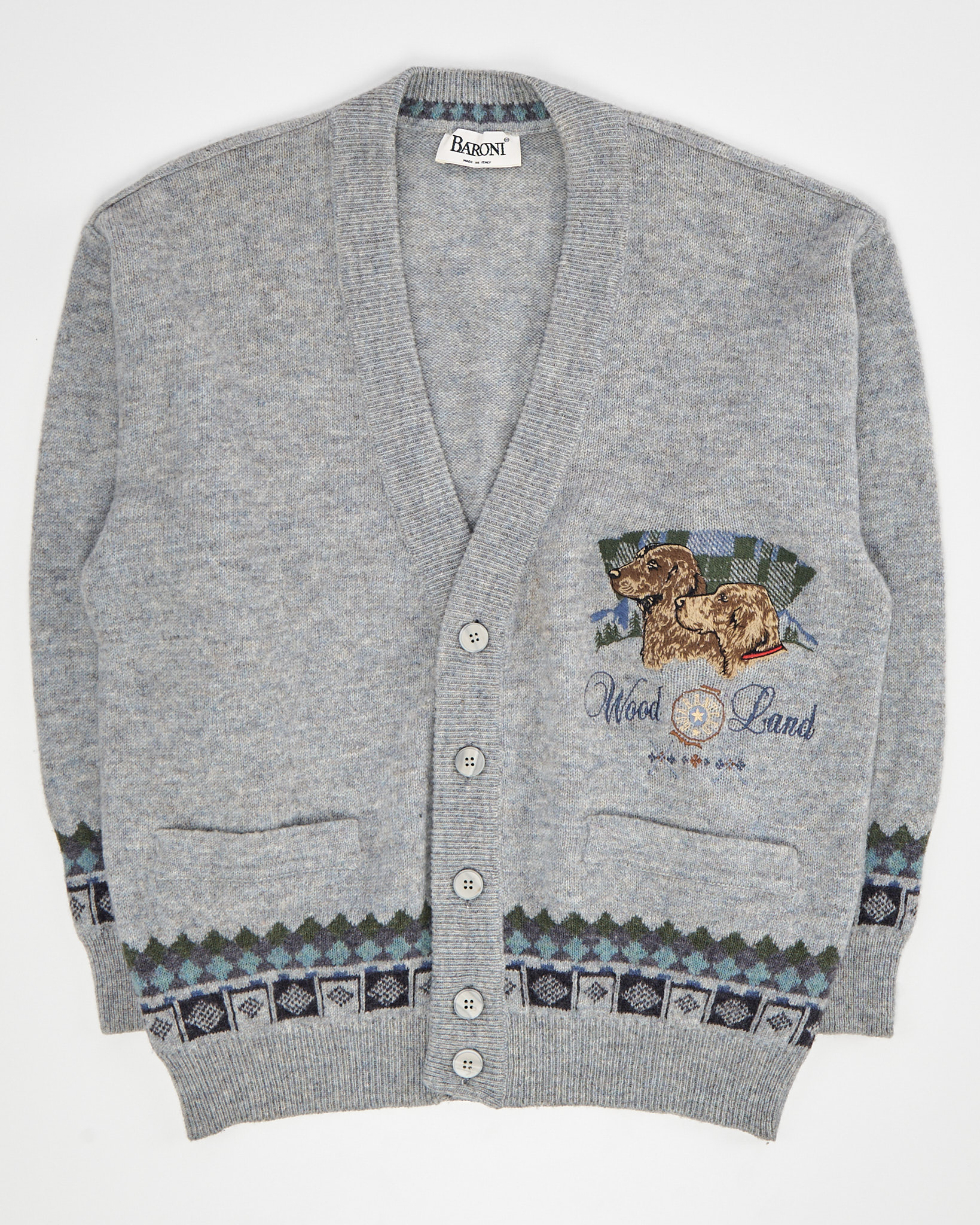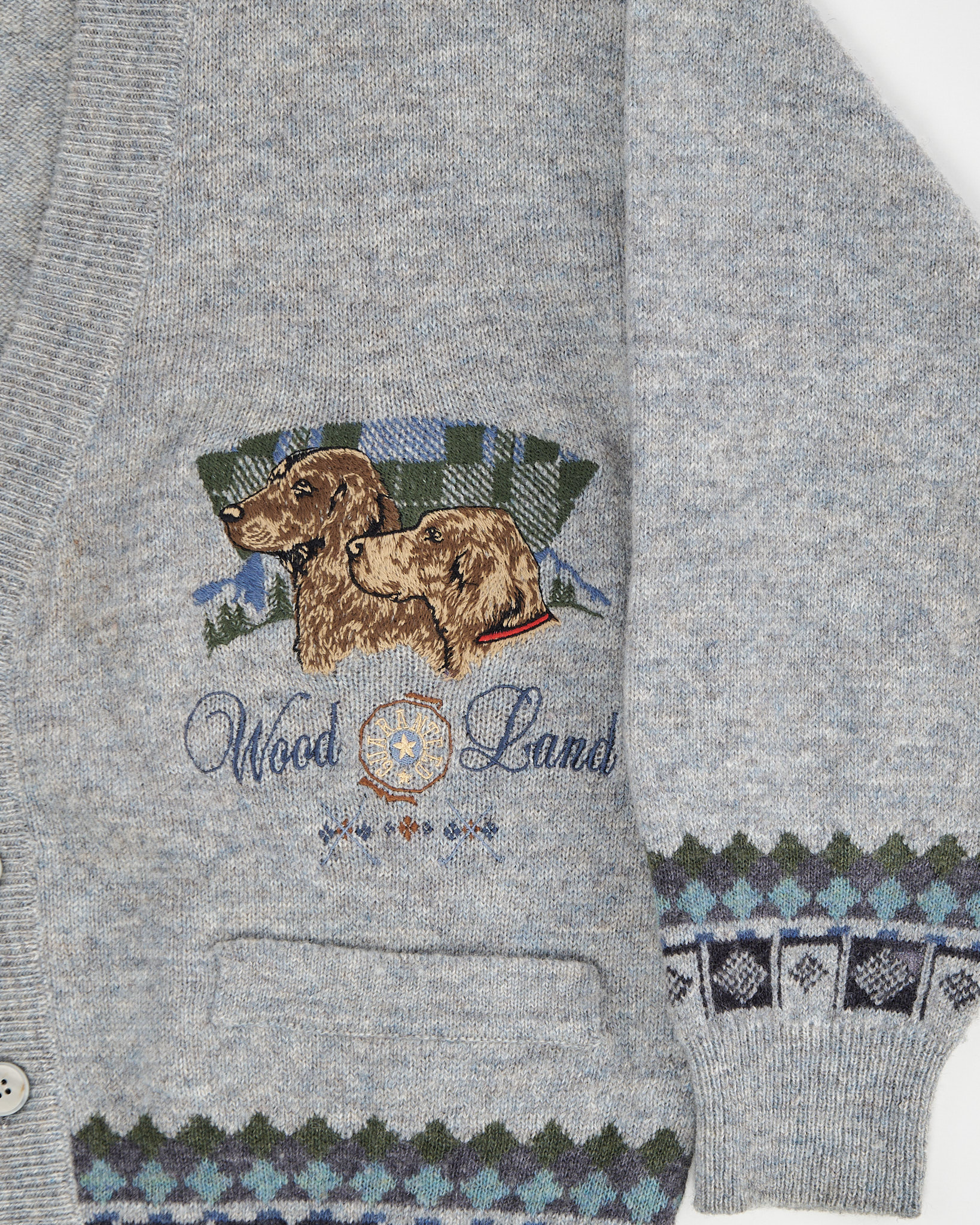 - Акцентом модели выступает детальная вышивка с изображением собаки и декоративными элементами.