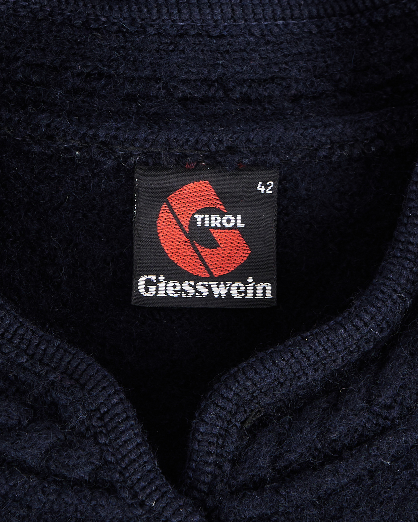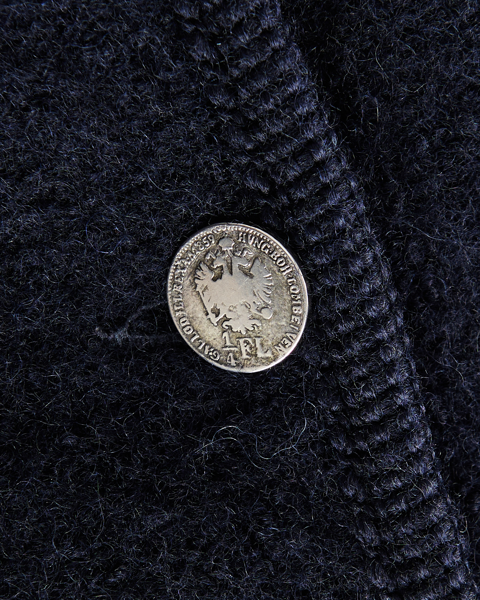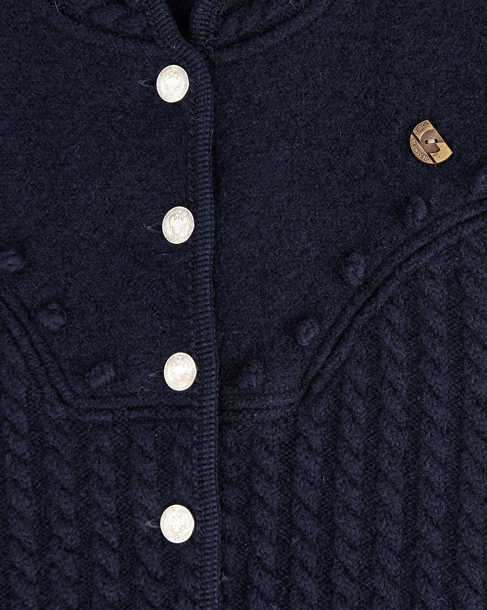 Кардиган Giesswein Tirol из 100% шерсти, отмечен знаком woolmark. Посадка аккуратная, с четкой линией плеч и прямым силуэтом. Металлические пуговицы с гербом и фирменный значок на груди.
