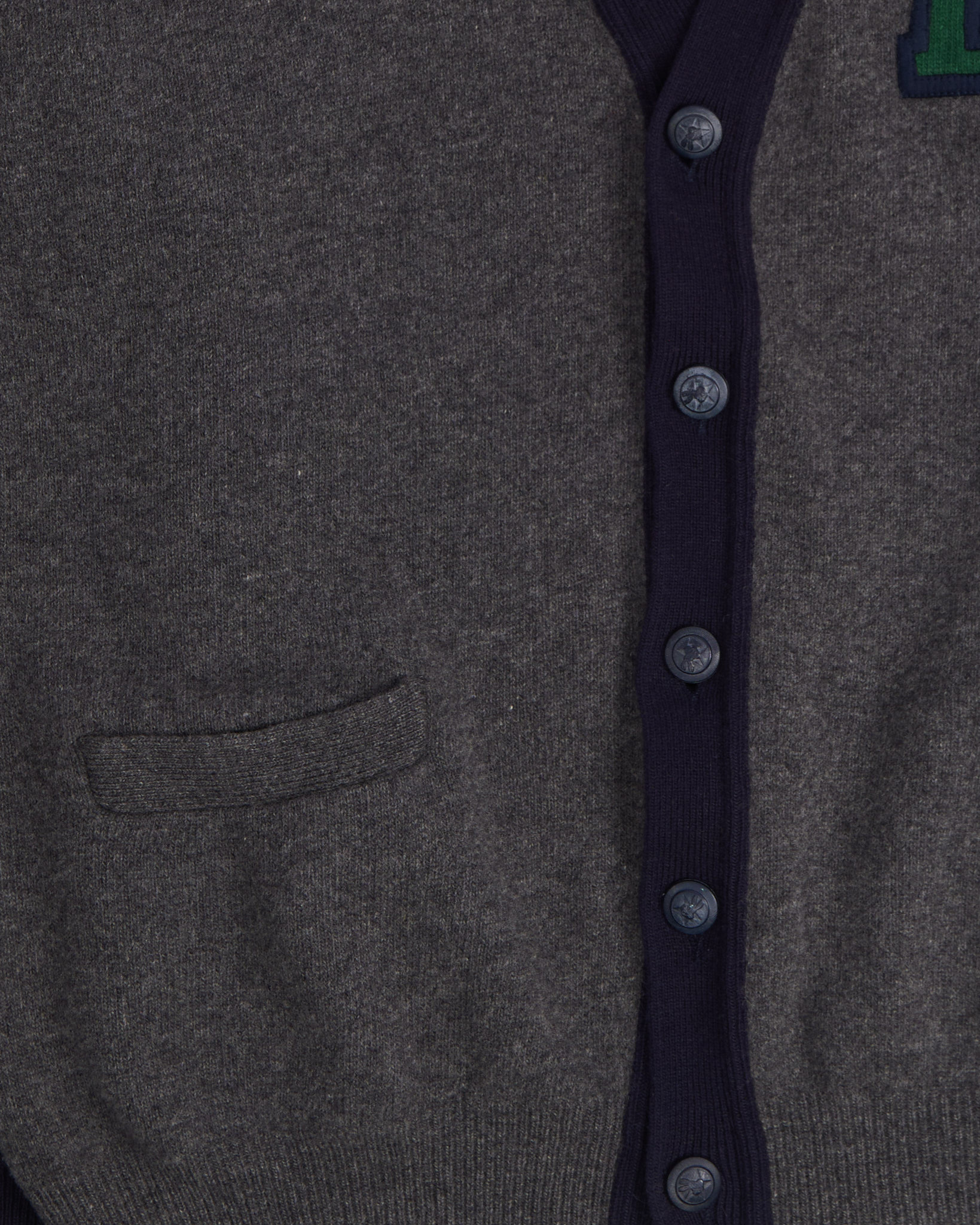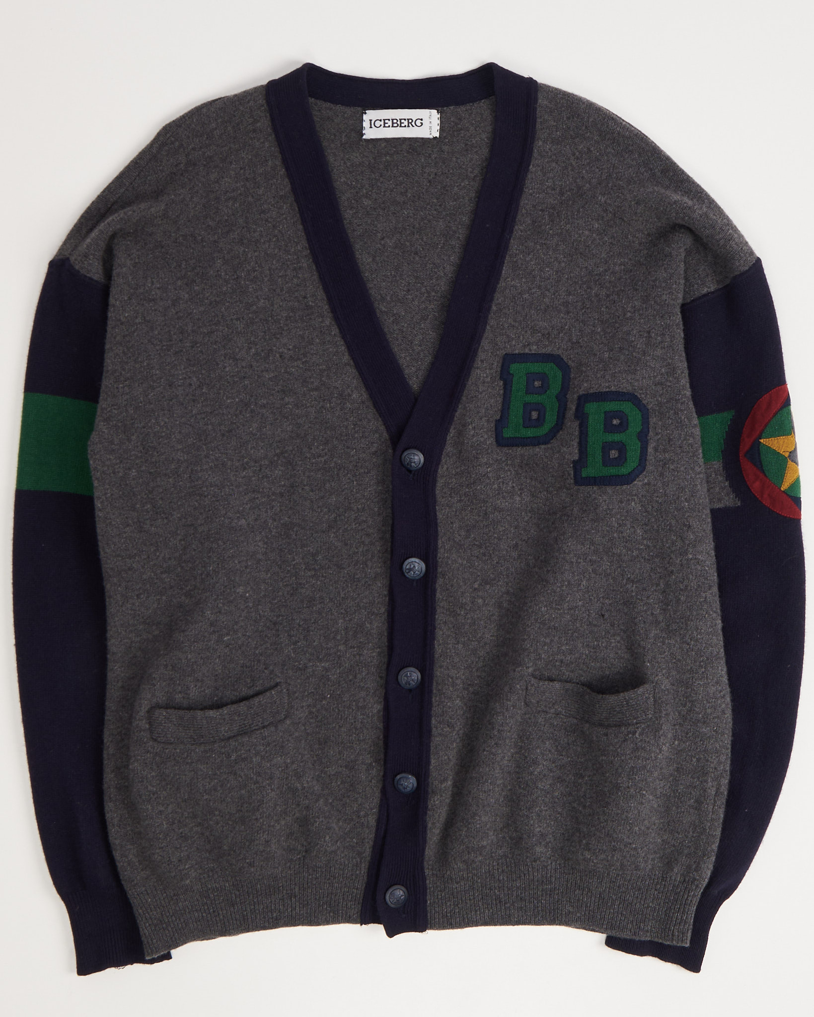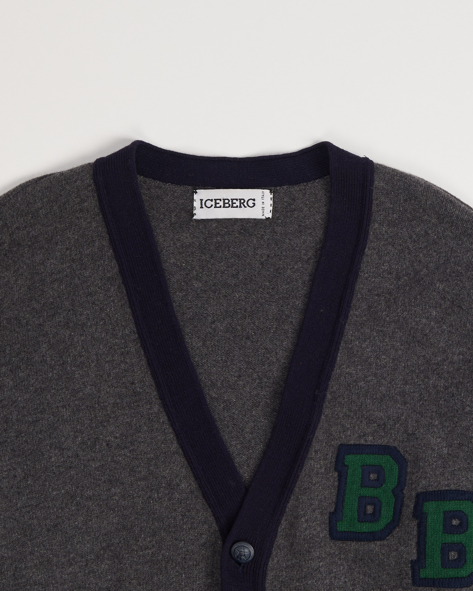 Кардиган Iceberg из 100% шерсти, отмечена знаком Woolmark. Аппликация на рукаве. Глубокий V-образный вырез с темно-синей планкой. Брендированные пуговицы. Сделан в Италии