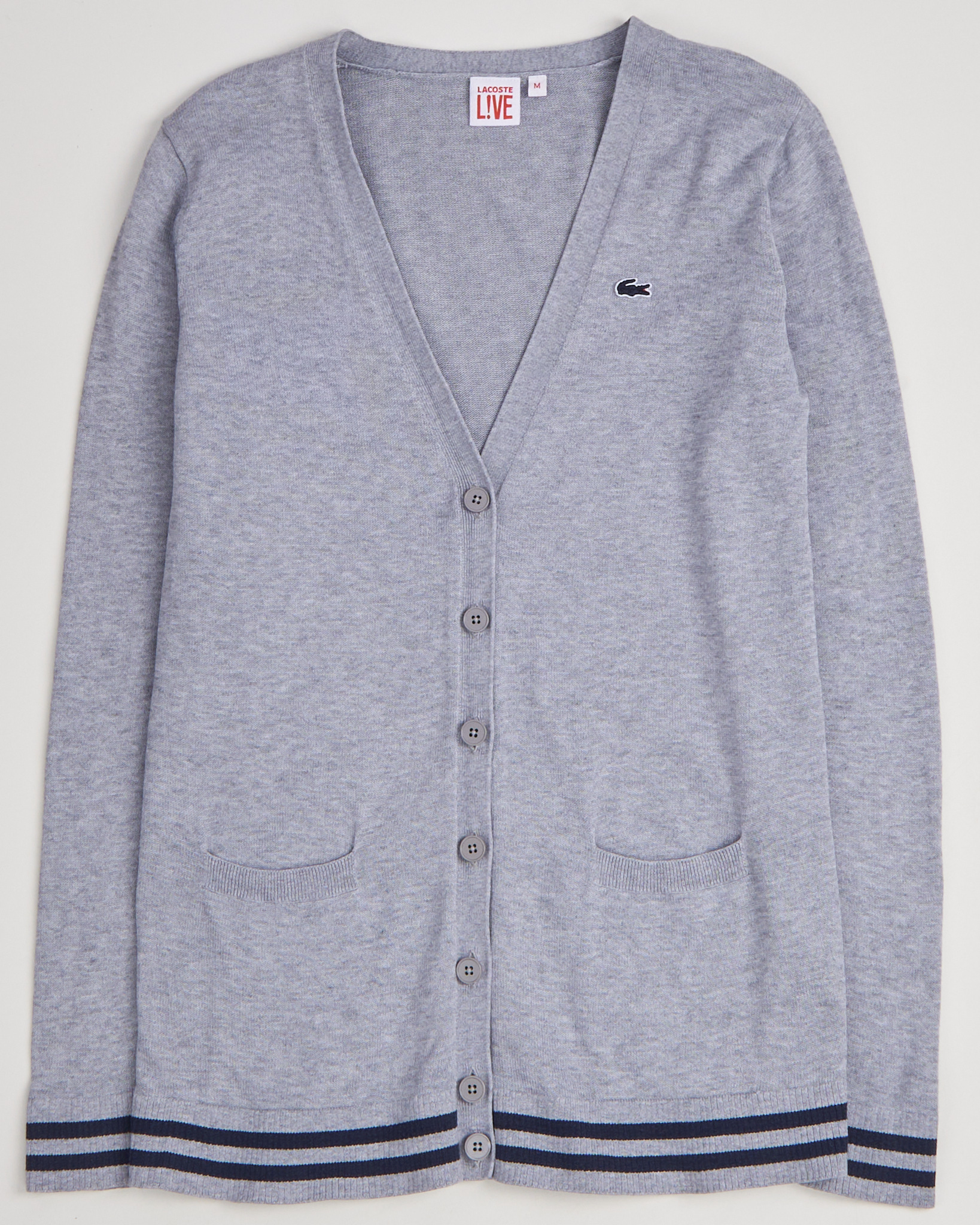 Кардиган из мягкого трикотажа от Lacoste Live. Прямой крой, аккуратная линия плеча и V - образный вырез. Застежка на брендированые пуговицы. Накладные карманы. Контрастные полосы по низу и на манжетах.