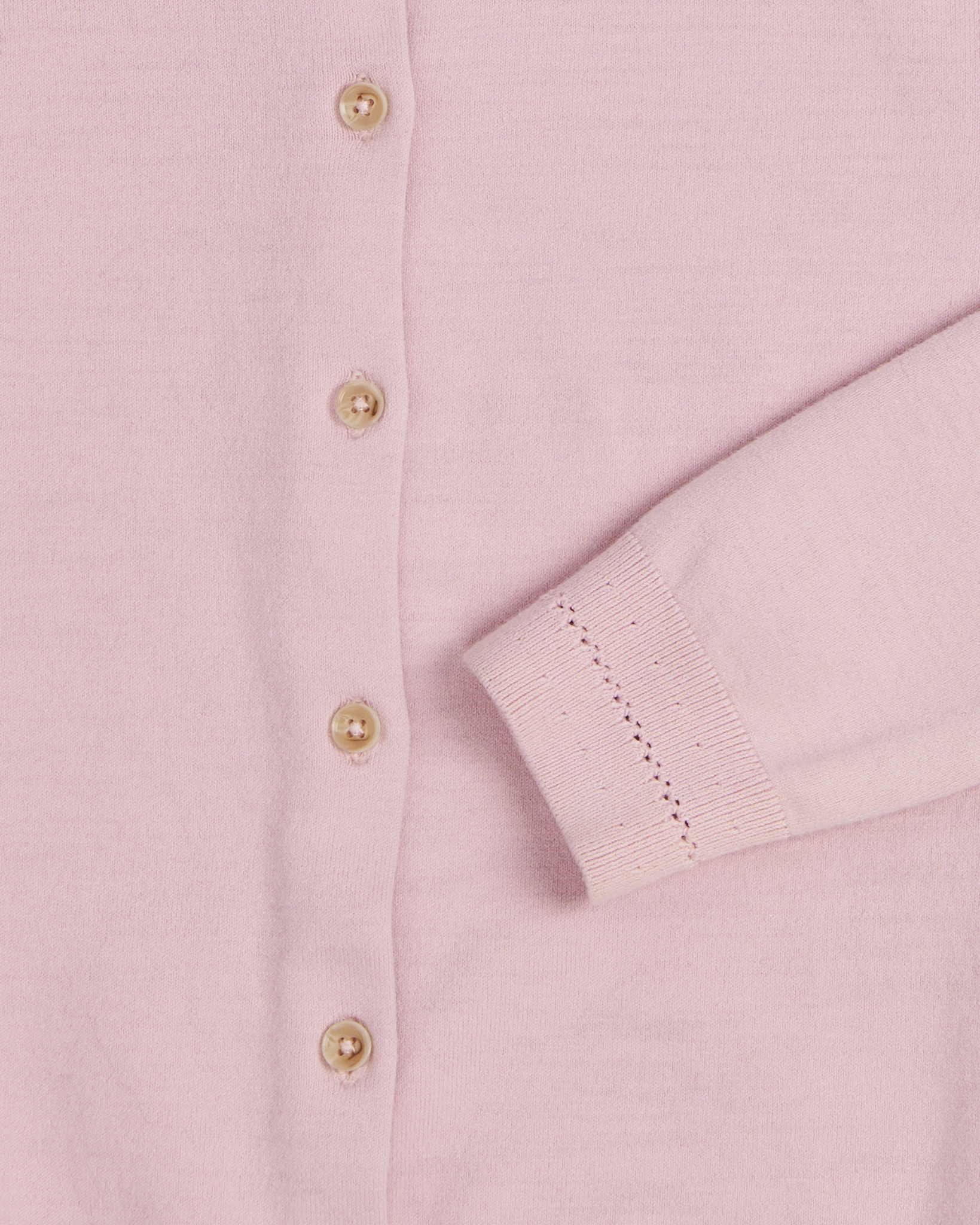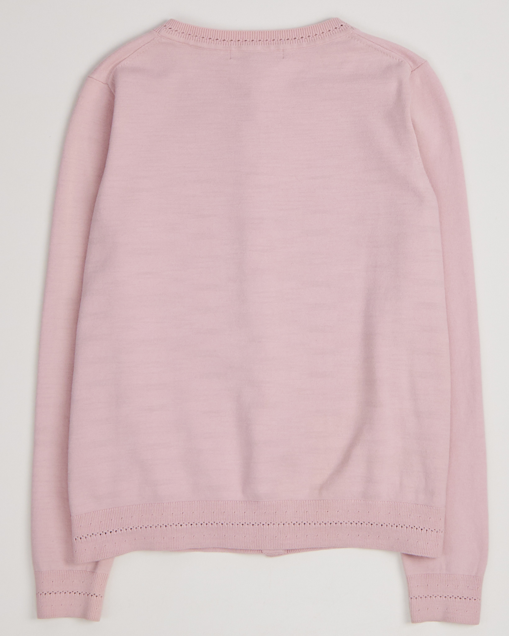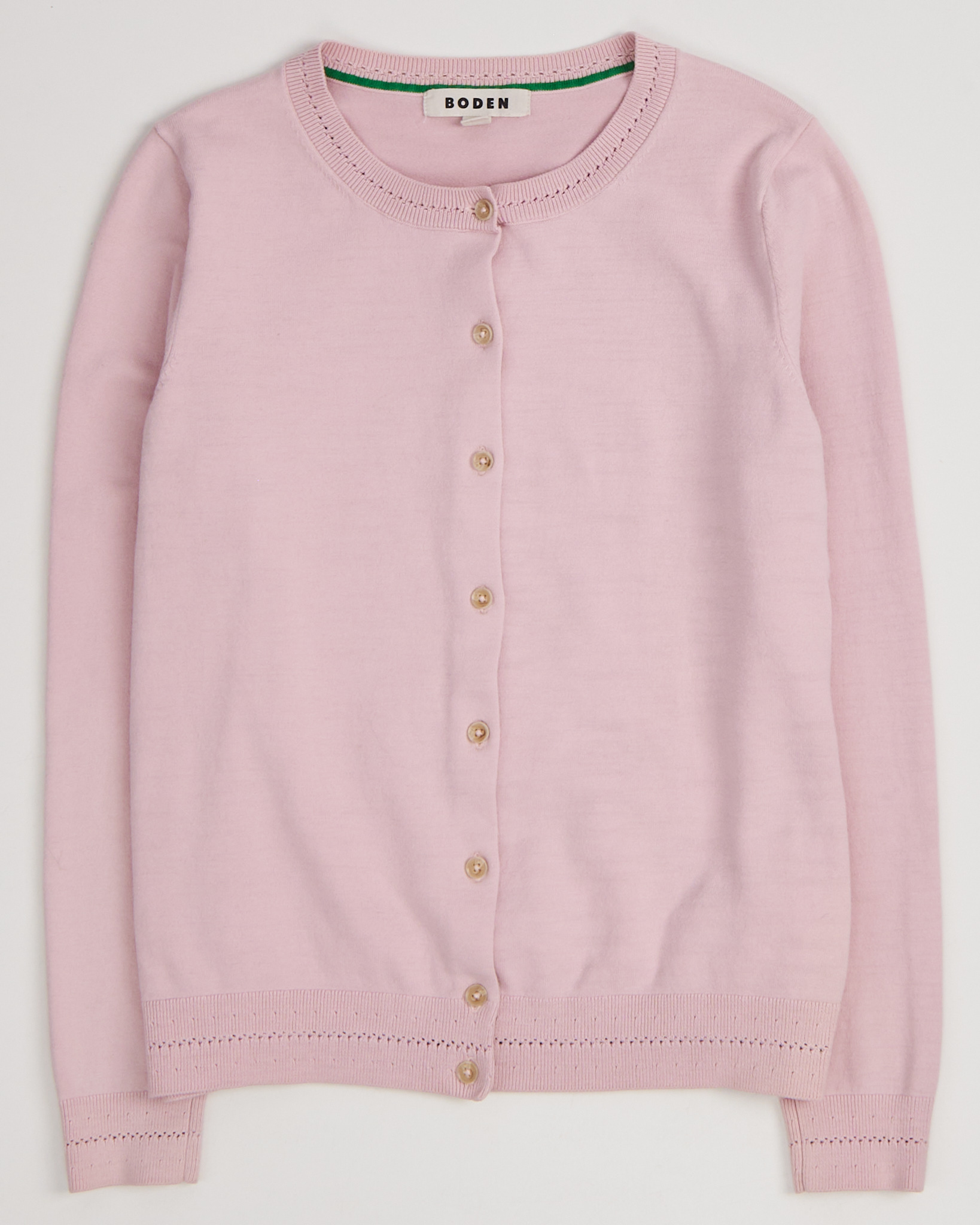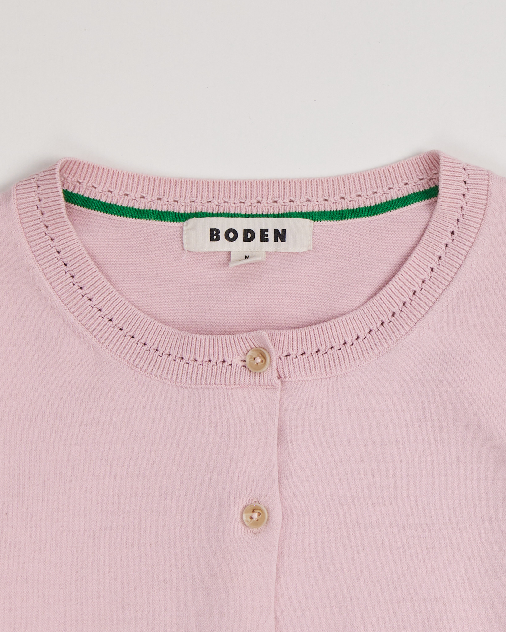 Кардиган в нежно-розовом оттенке от бренда Boden. Прямого силуэта, застёжка на пуговицах. Манжеты и нижний край оформлены эластичной вязкой с ажурной линией.