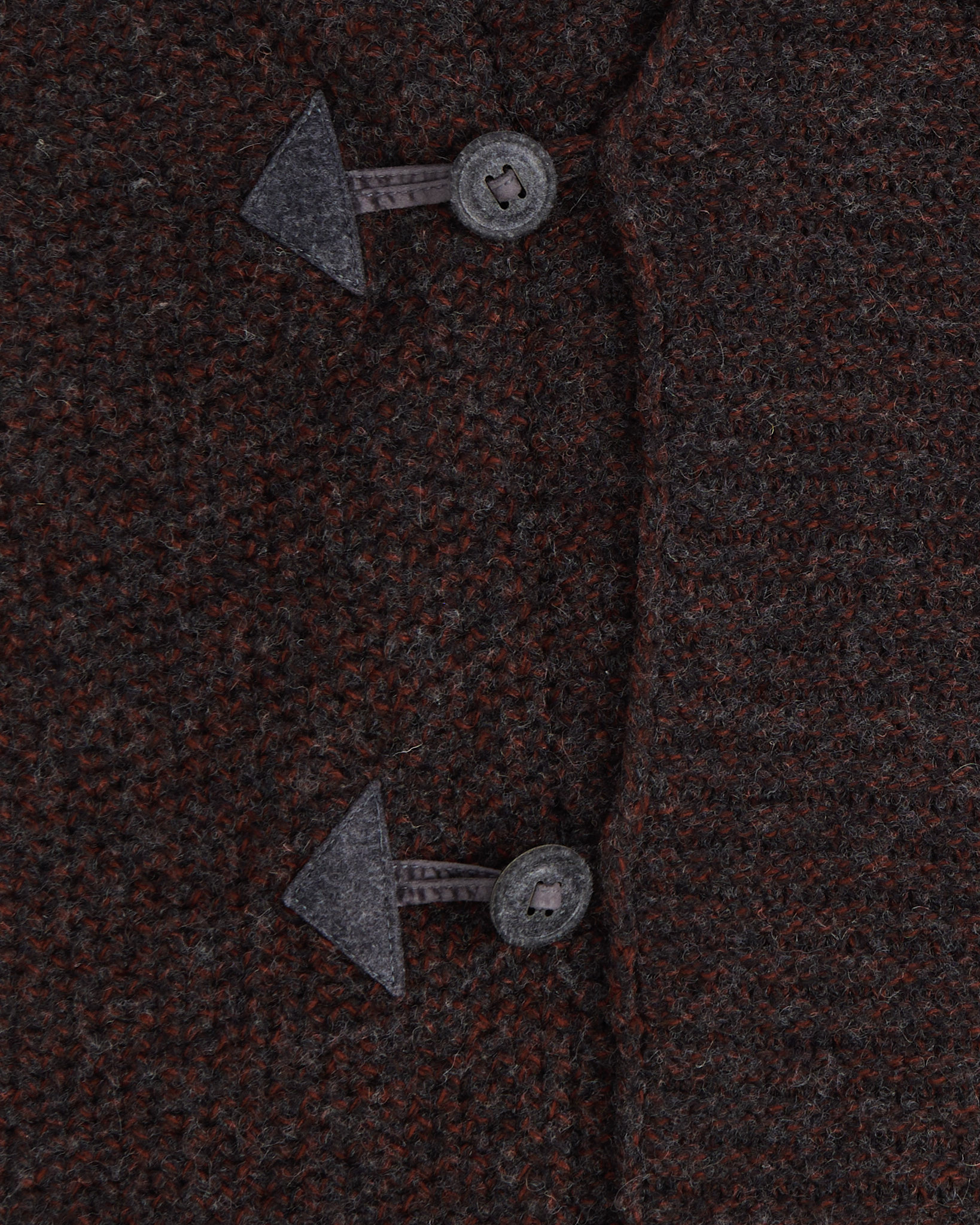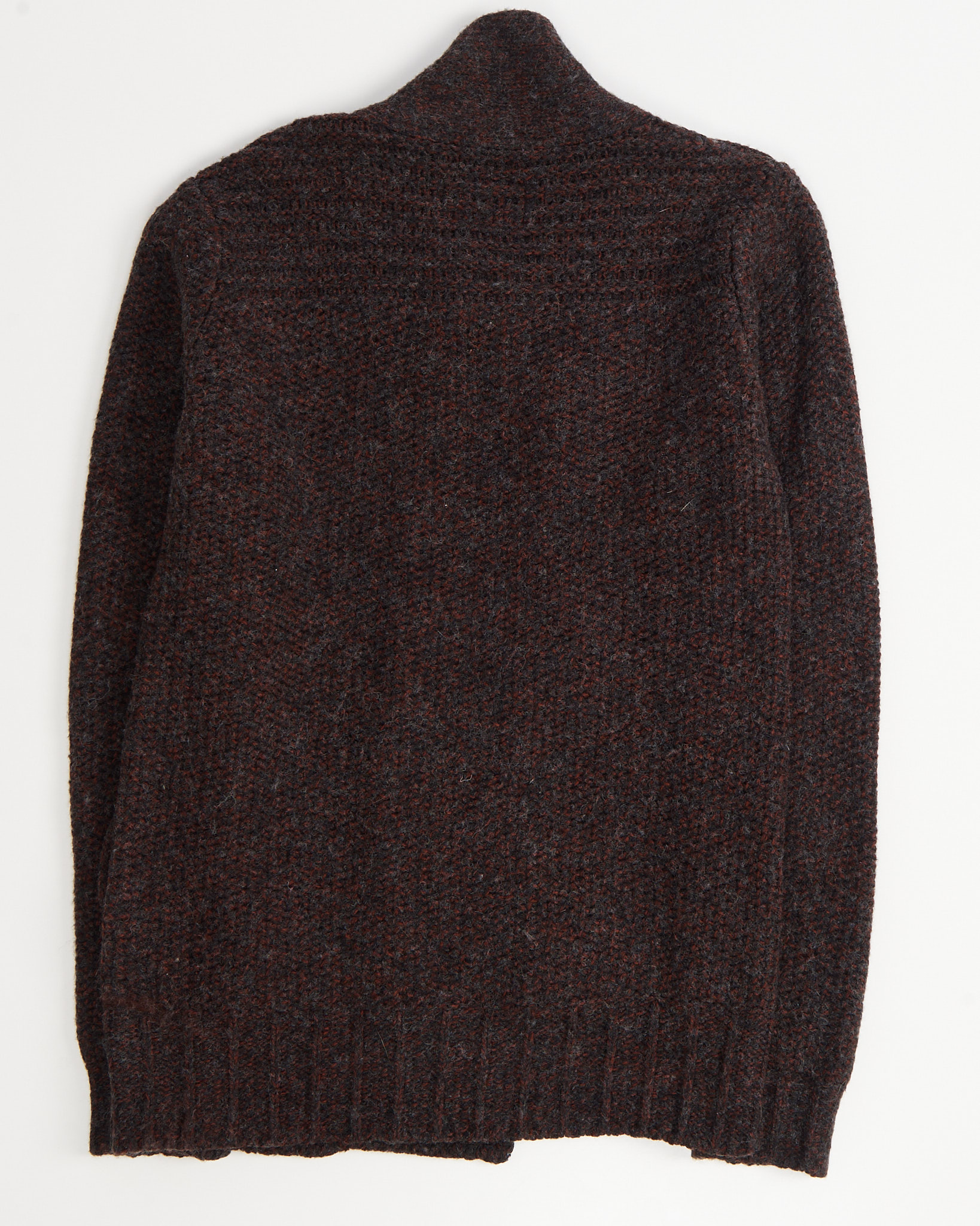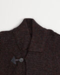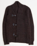 Кардиган со свободной посадкой и широким воротником. Ассиметричная линия застёжек с тремя контрастными пуговицами придаёт акцент. У кардигана есть шлёвки для пояса.