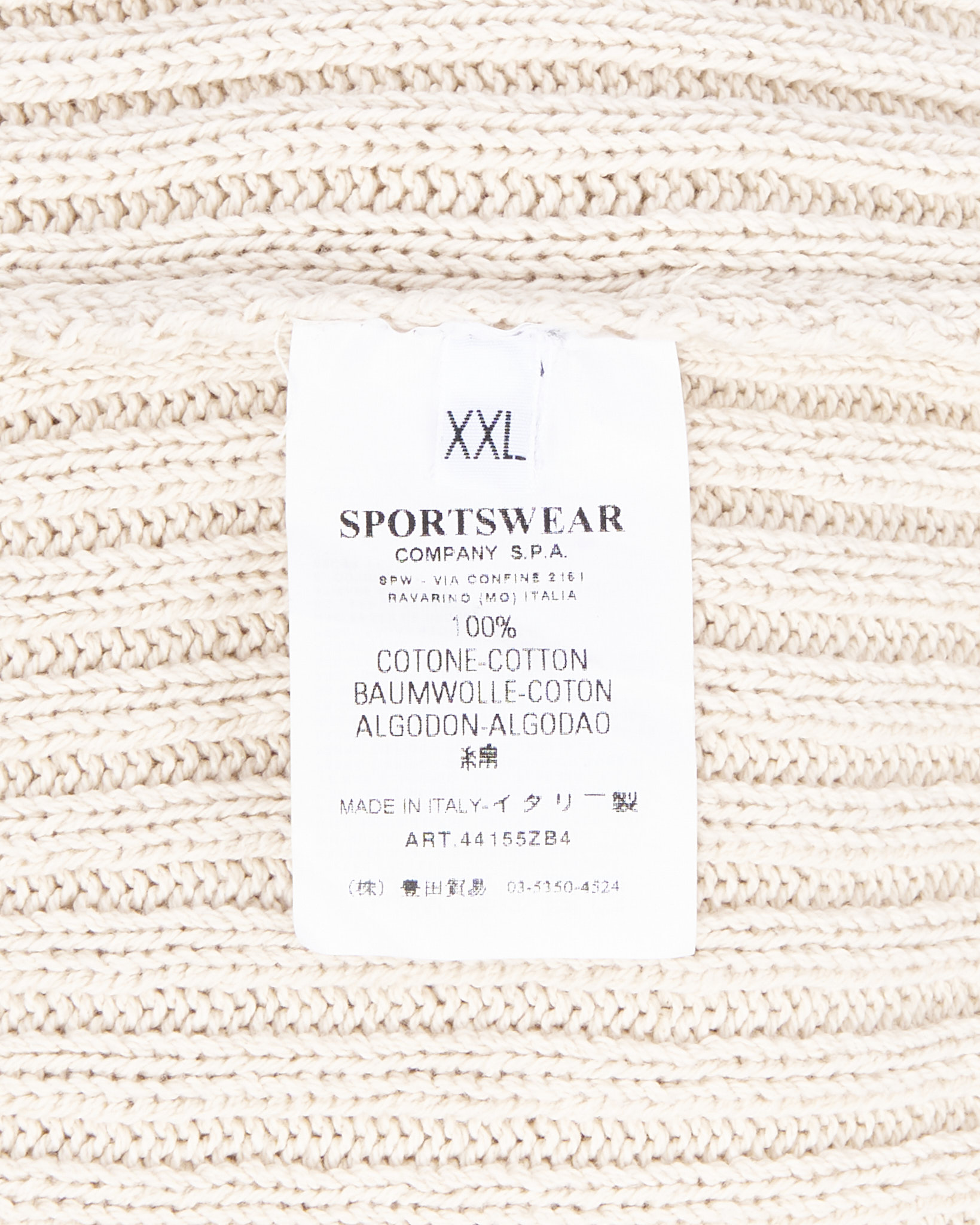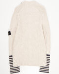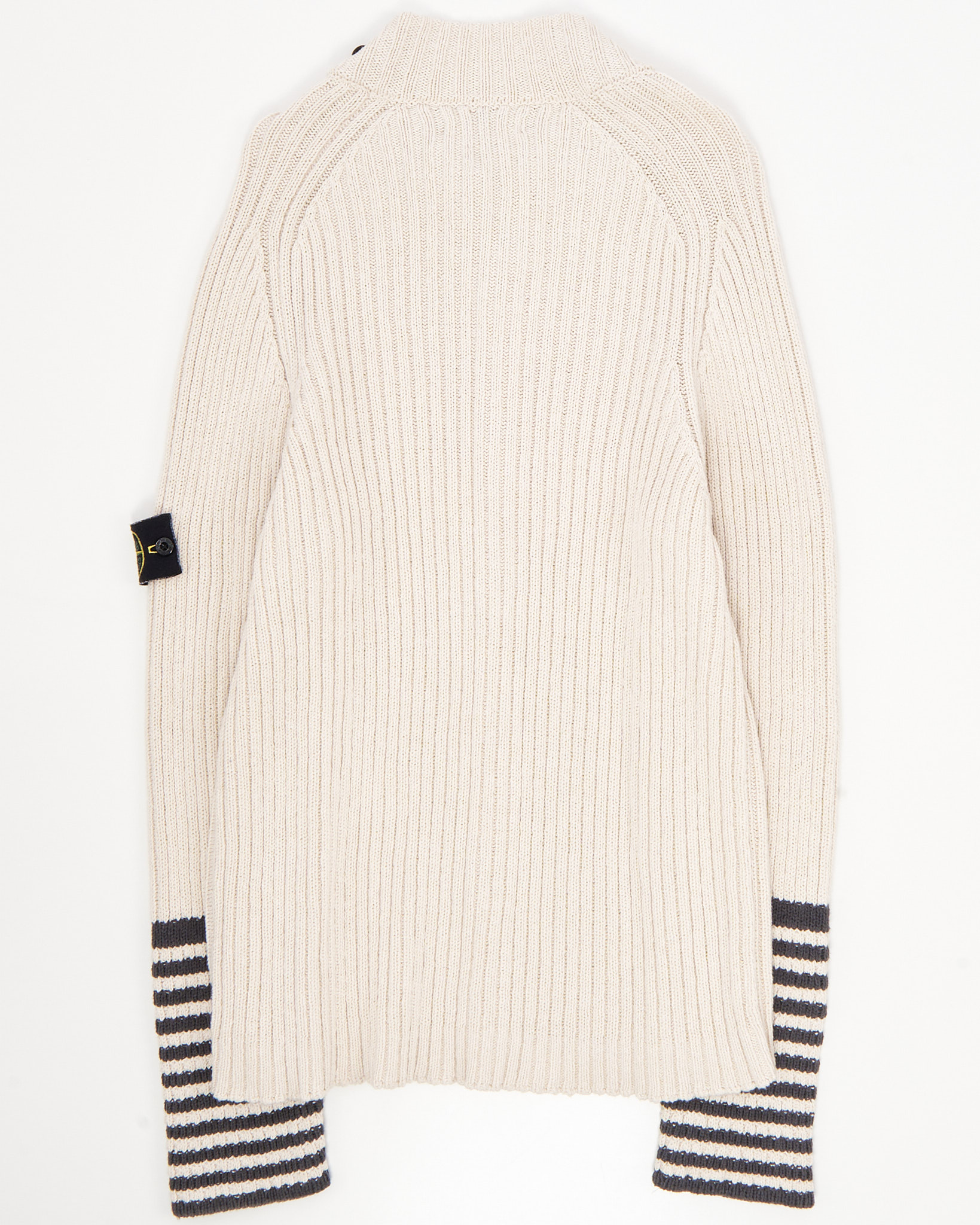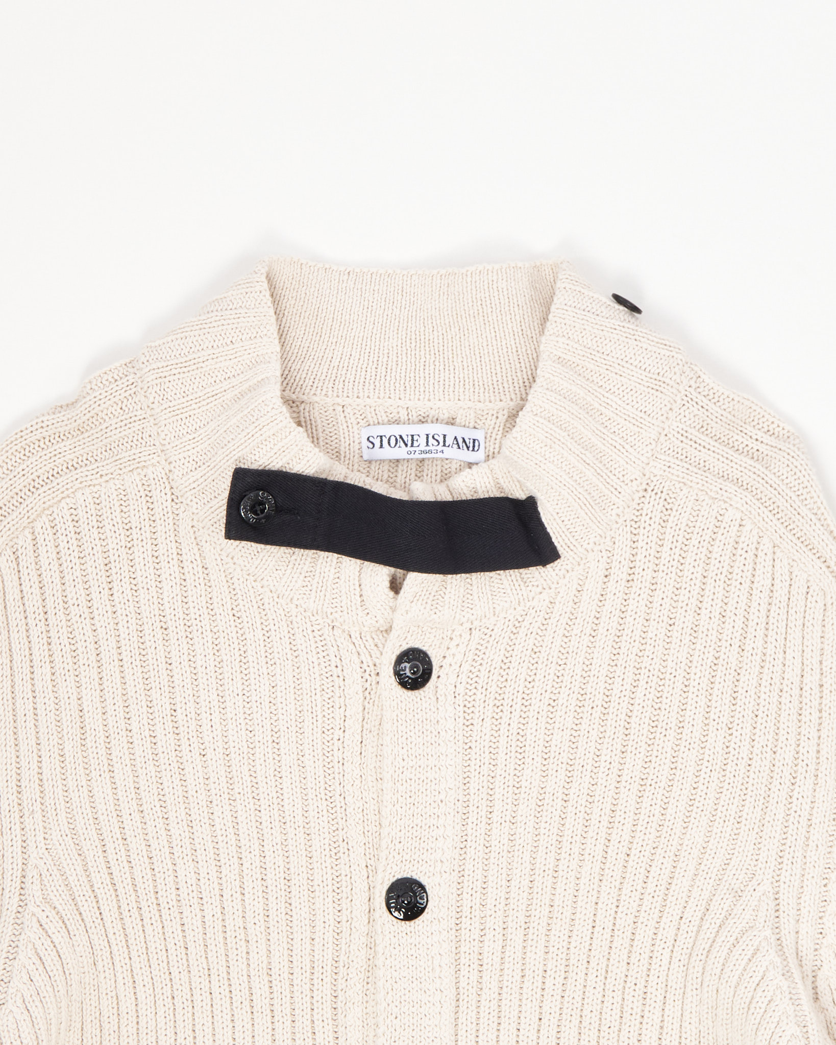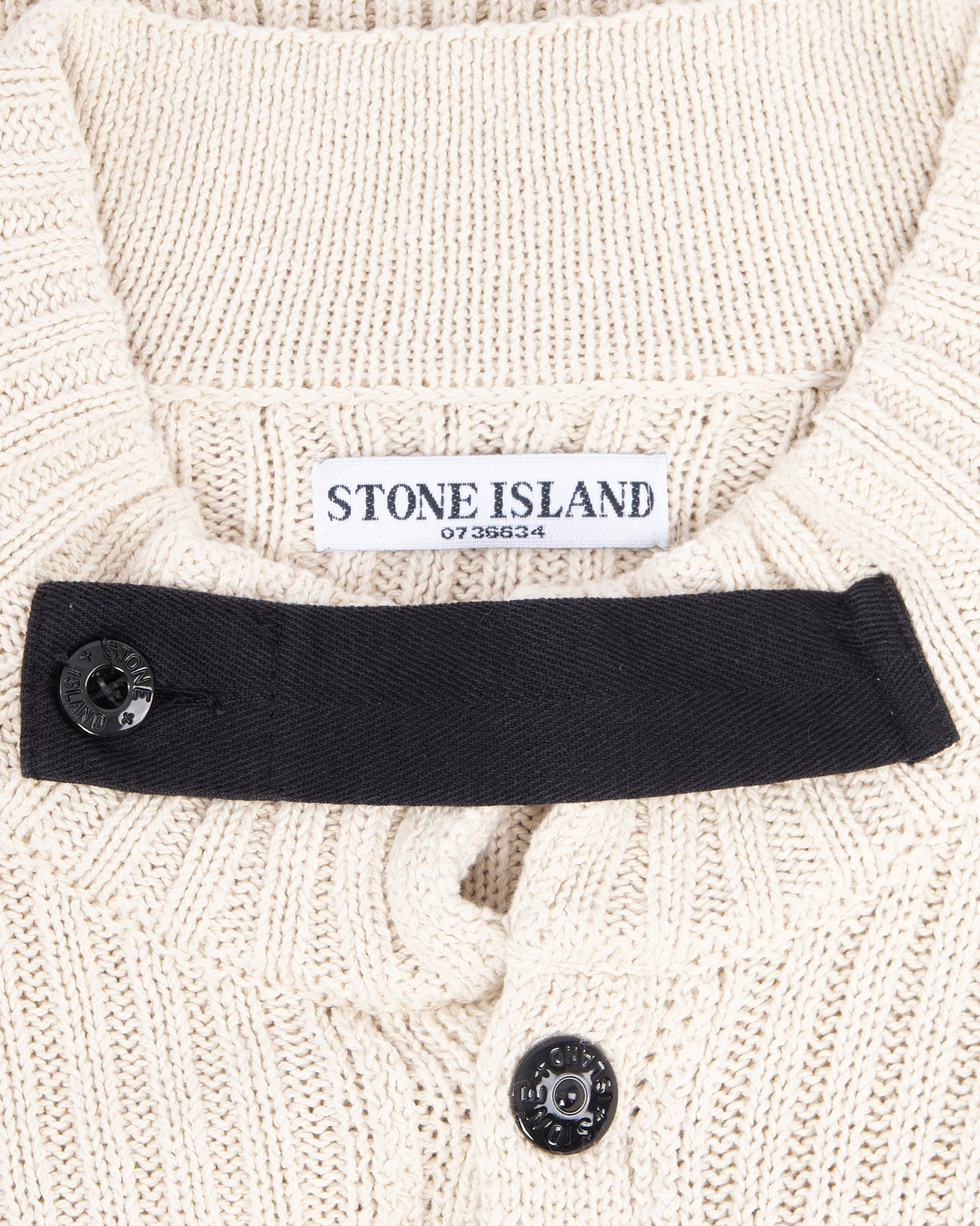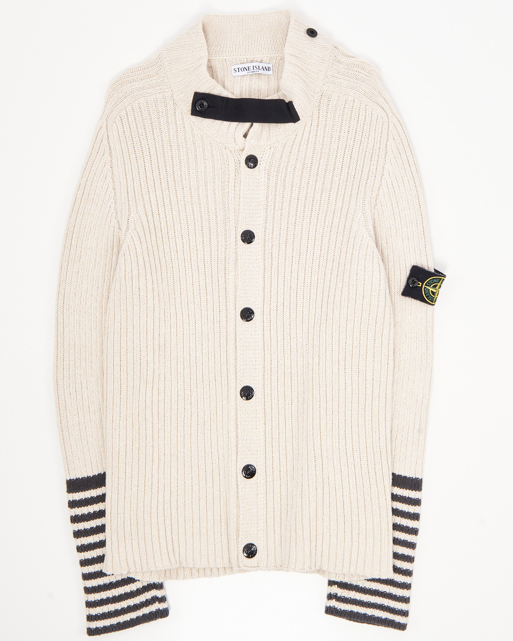 Бежевый хлопковый кардиган с чёрными пуговицами и воротником-стойкой. Контрастные чёрные полоски на рукавах. Фирменный патч Stone Island на рукаве. Изготовлен в Италии из 100% хлопка.
