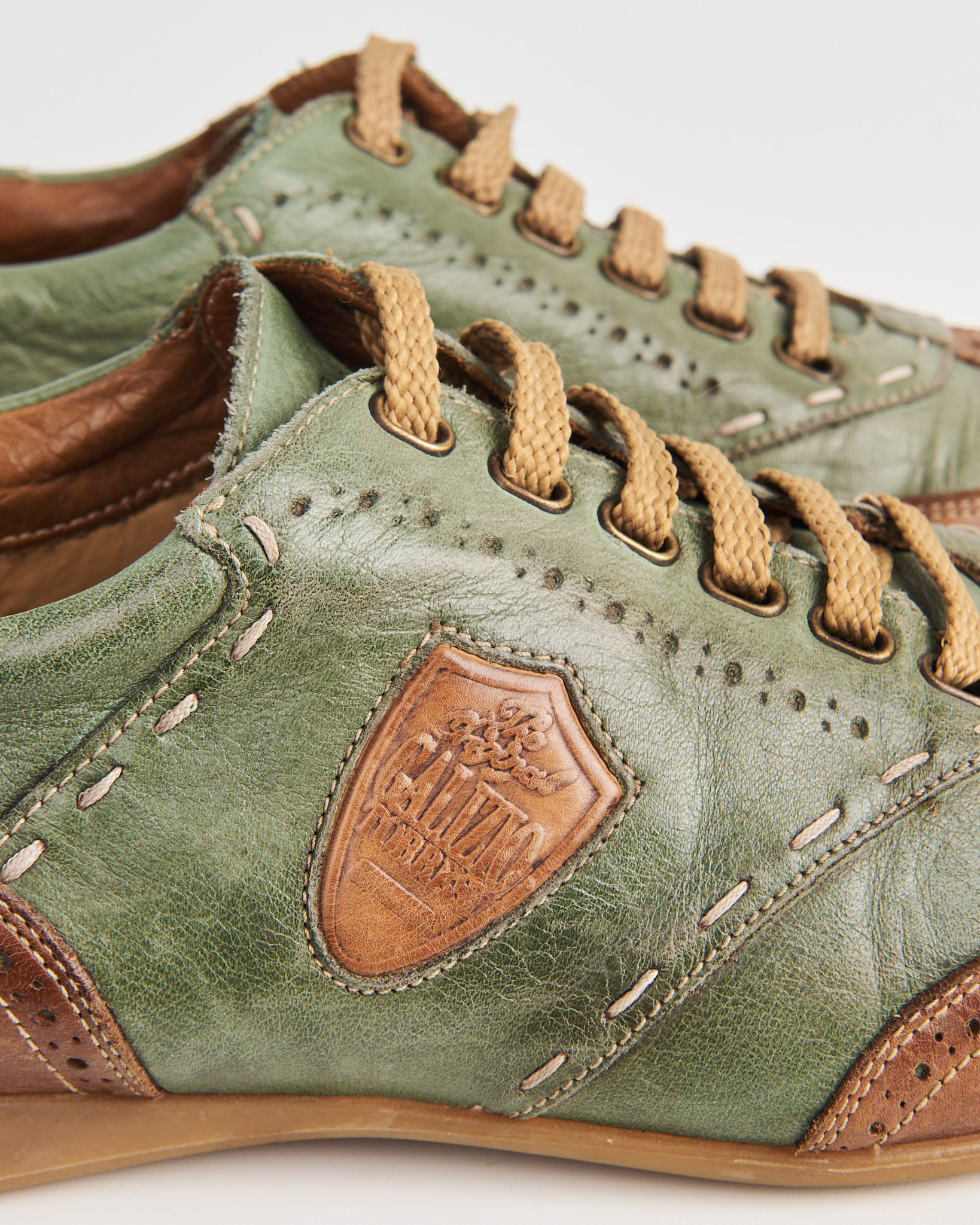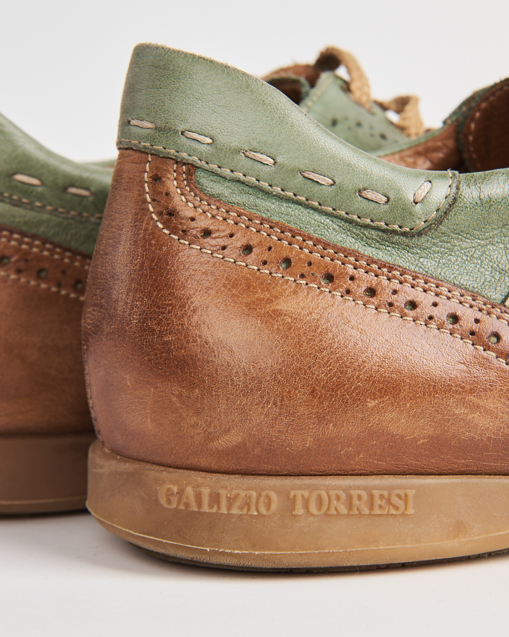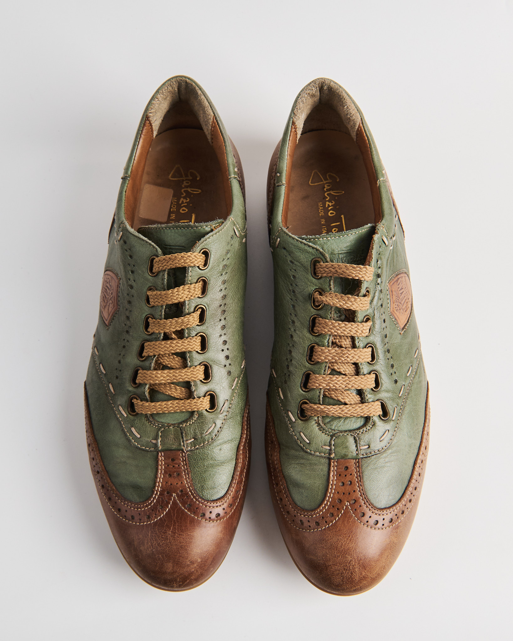 Кожаные кеды Galizio Torresi в сочетании зеленого и теплого коричневого цвета. Мыс оформлен перфорацией в стиле брогов. По корпусу проходят декоративные строчки и контрастные вставки. Сбоку кожаный шеврон с тиснением логотипа. Внутри кожаная стелька. Сделано в Италии.