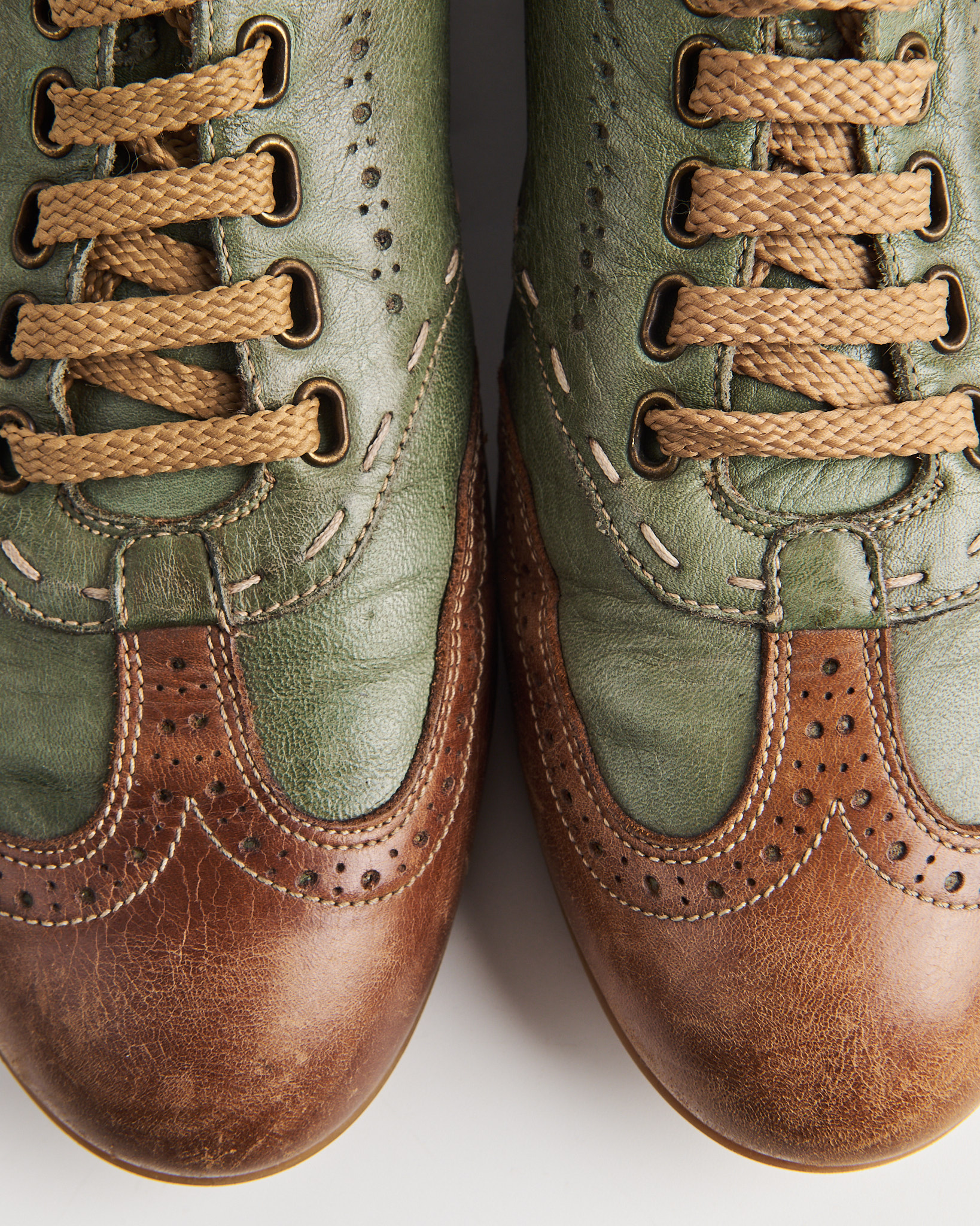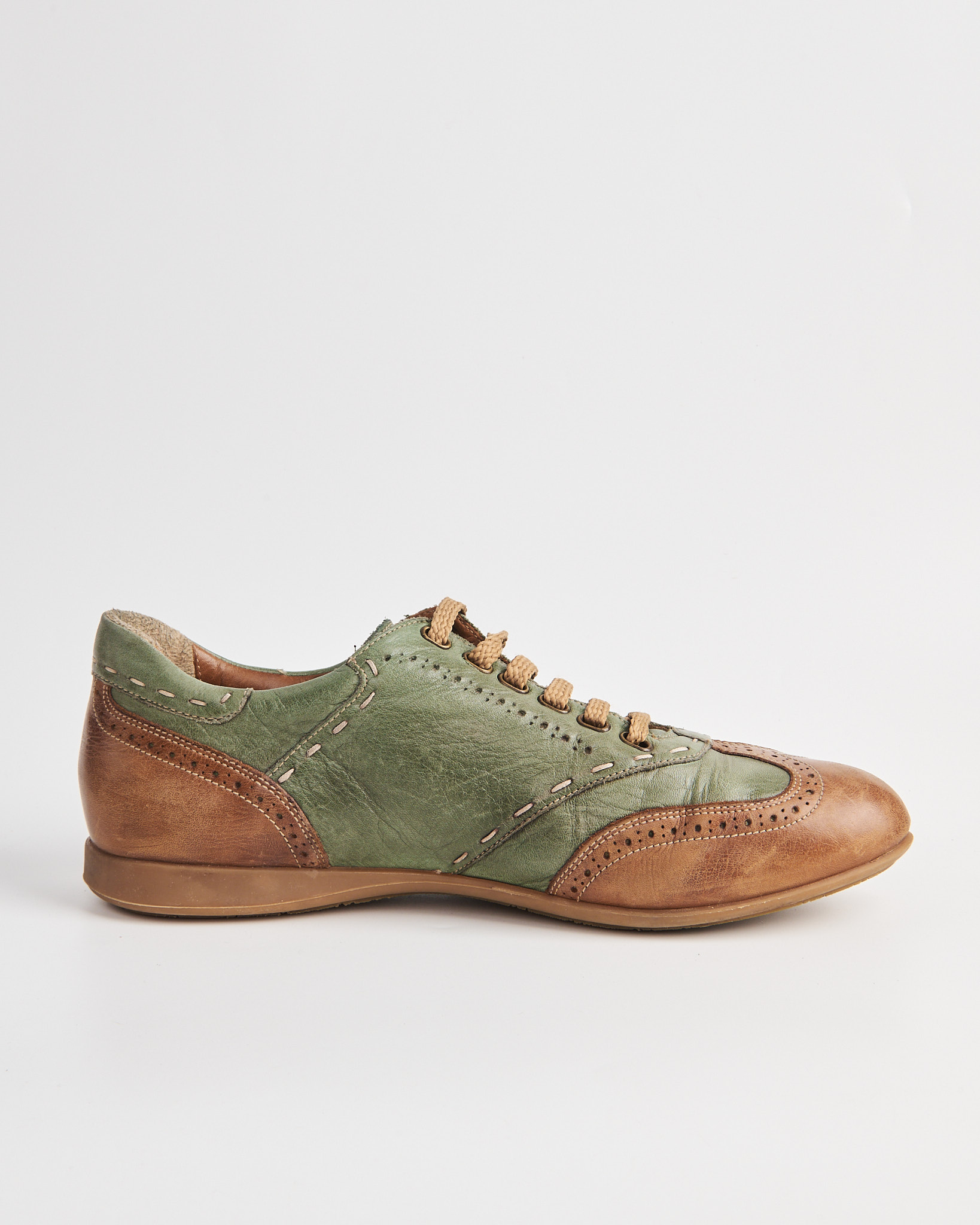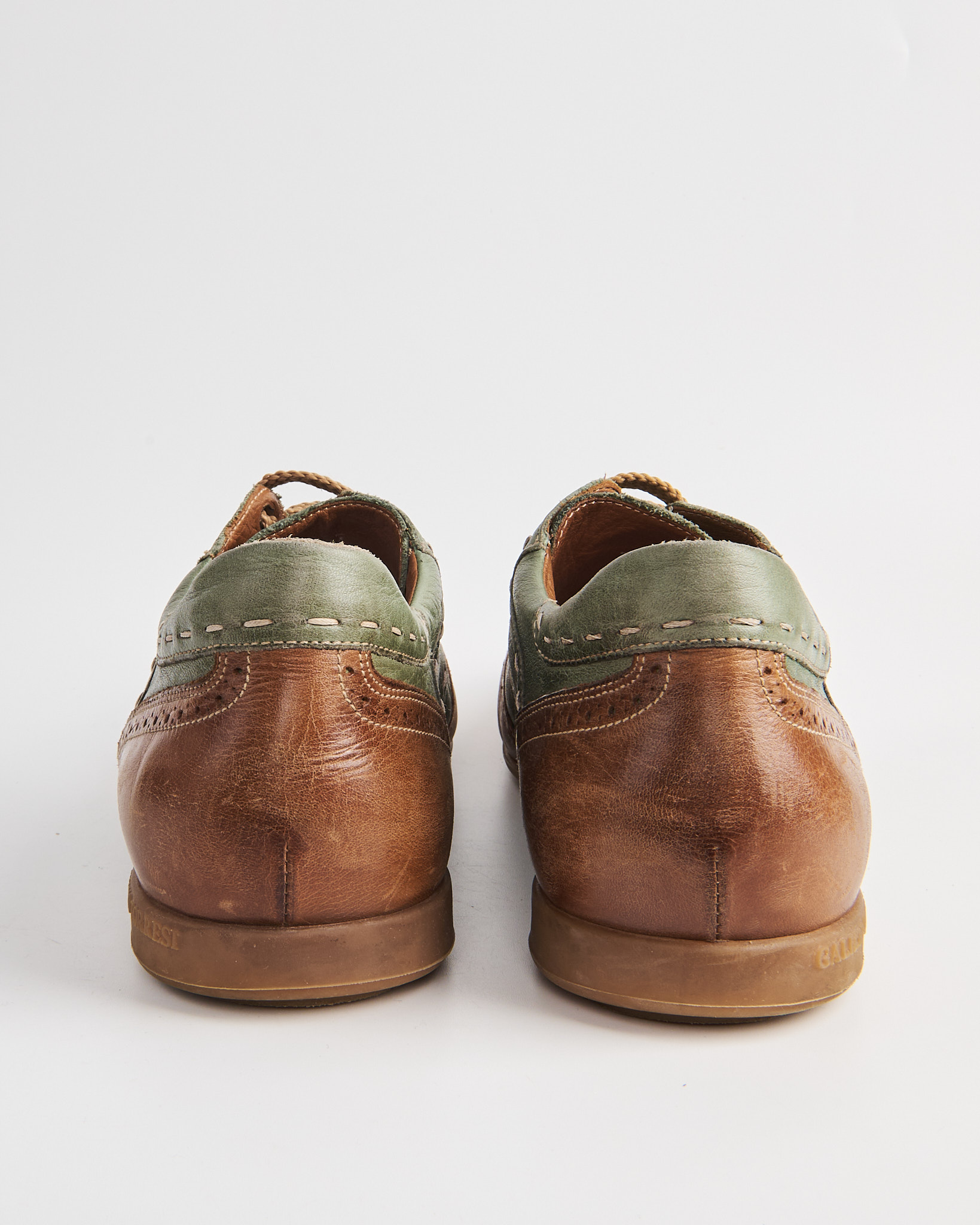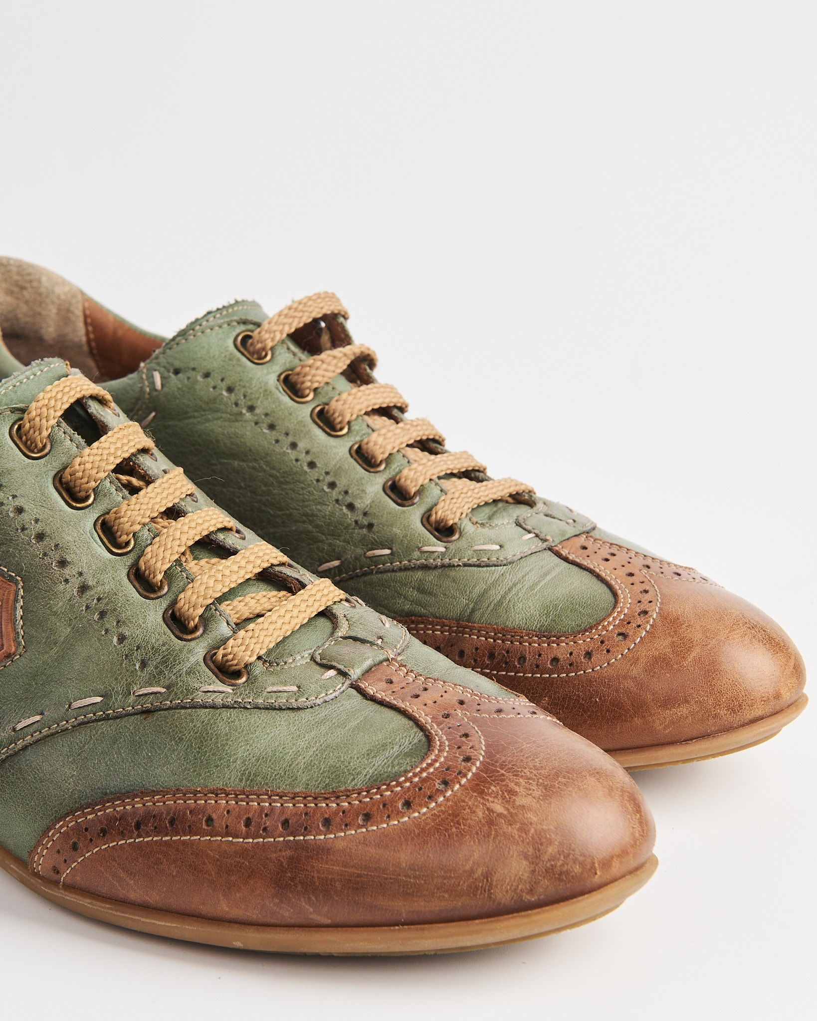 Кожаные кеды Galizio Torresi в сочетании зеленого и теплого коричневого цвета. Мыс оформлен перфорацией в стиле брогов. По корпусу проходят декоративные строчки и контрастные вставки. Сбоку кожаный шеврон с тиснением логотипа. Внутри кожаная стелька. Сделано в Италии.