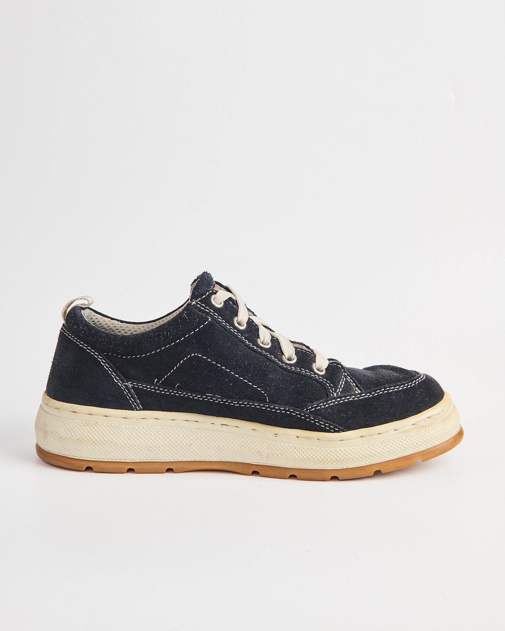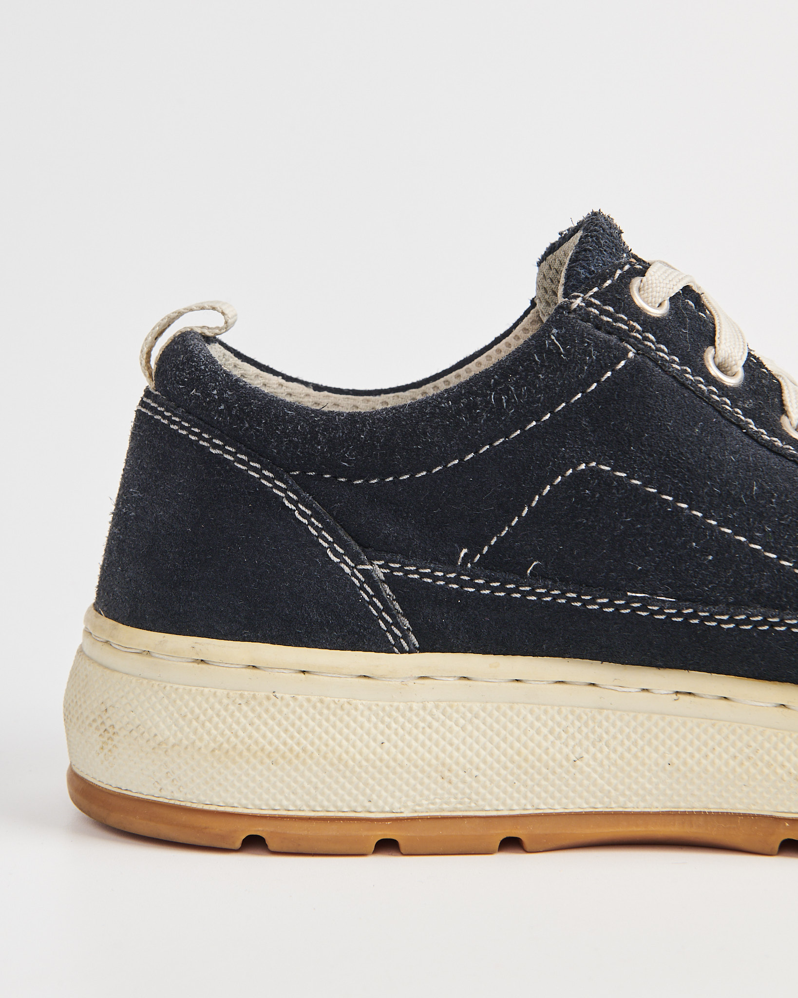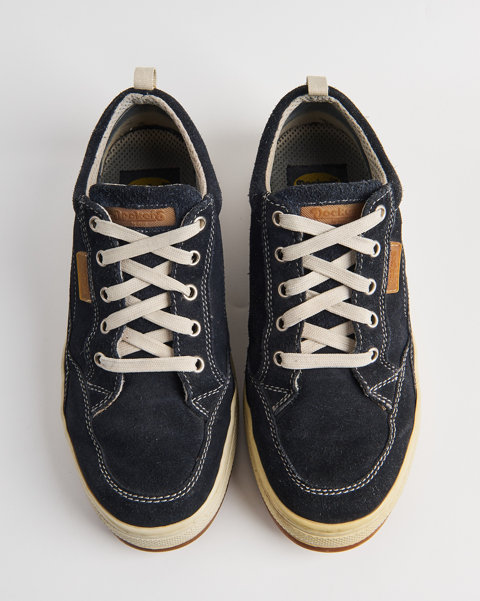 Замшевые кеды Dockers темно-синего цвета. Контрастная строчка. Металлические люверсы. Сбоку фирменный патч с логотипом. Подошва светлая, с выраженным протектором и плотной кромкой. Внутренняя часть с текстильной подкладкой.