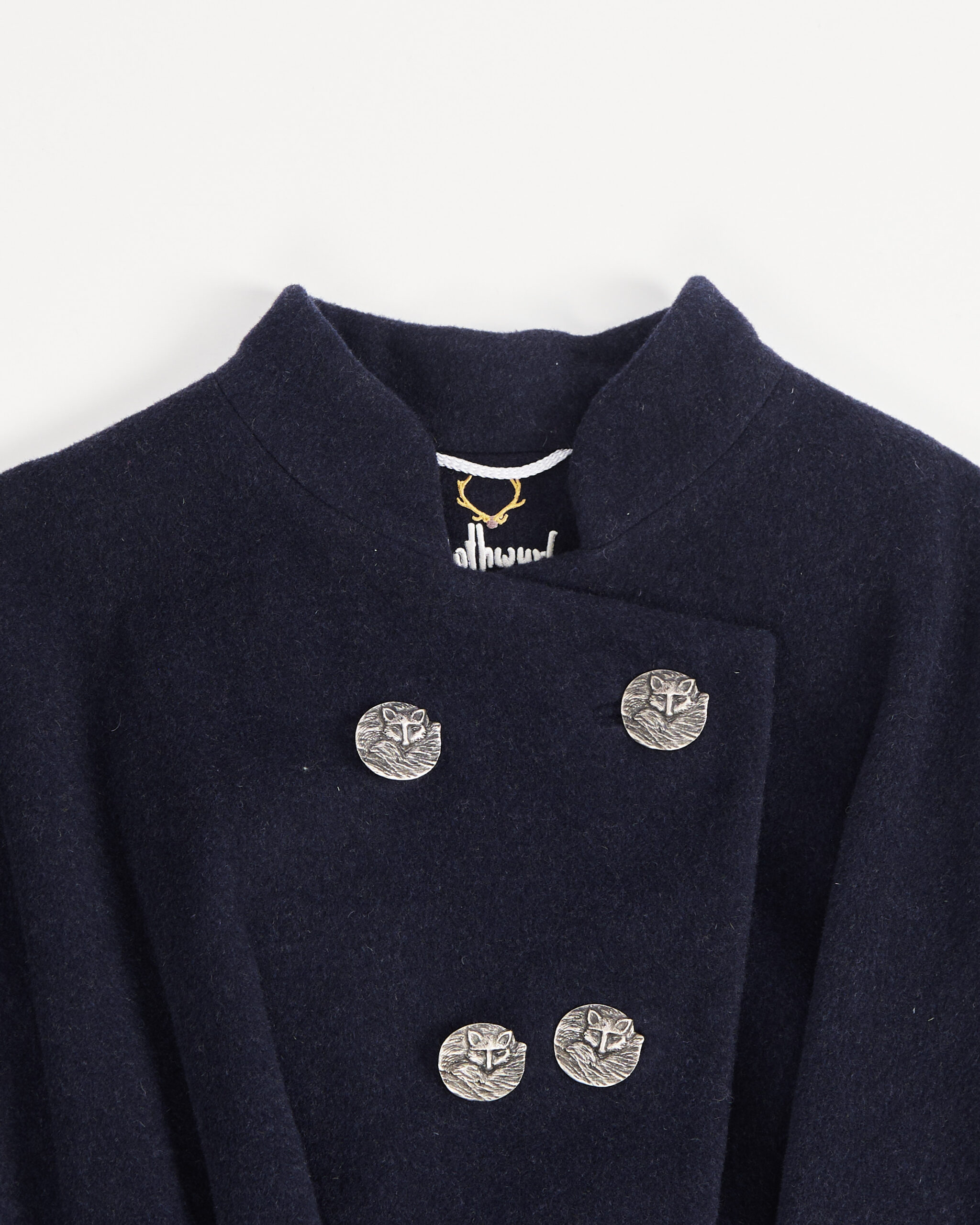 Винтажный кейп с поясом и закрепленным подпуговичником из натурального перламутра, акцентными пуговицами в виде спящих лис. Изделие легкое, но теплое, очень комфортное в носке. Выполнено из шерсти кашемира, талия регулируется поясом.