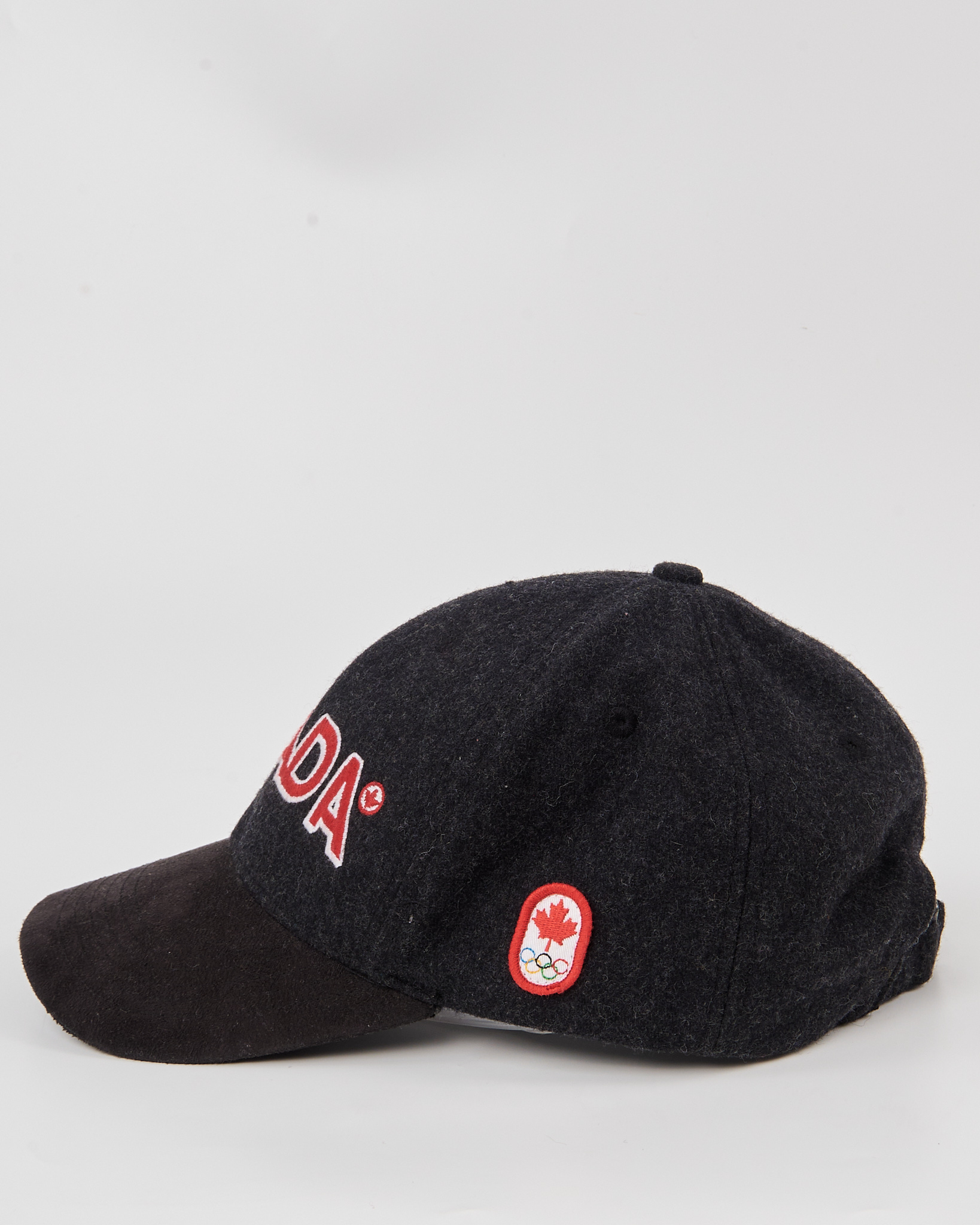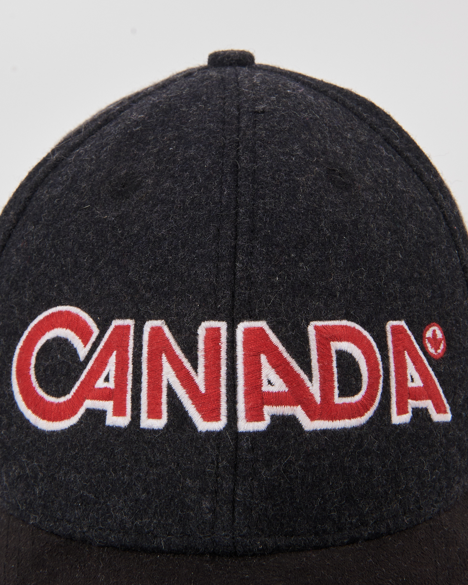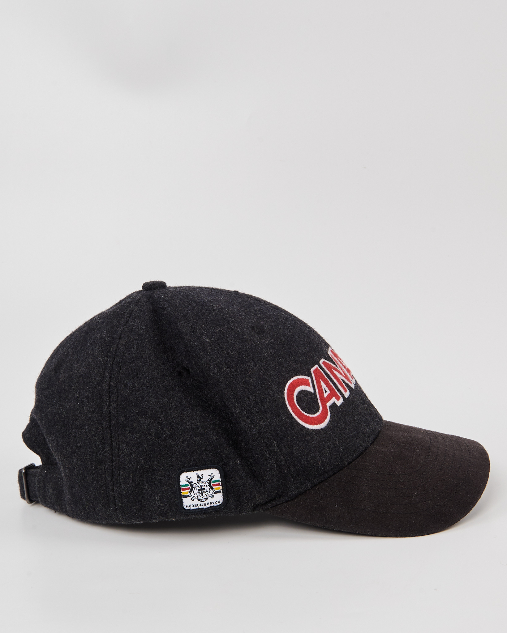 Кепка из плотной шерстяной ткани тёмного оттенка. Материал мягкий, посадка регулируется ремешком. Крупная вышивка Canada и боковые патчи придают акцент.