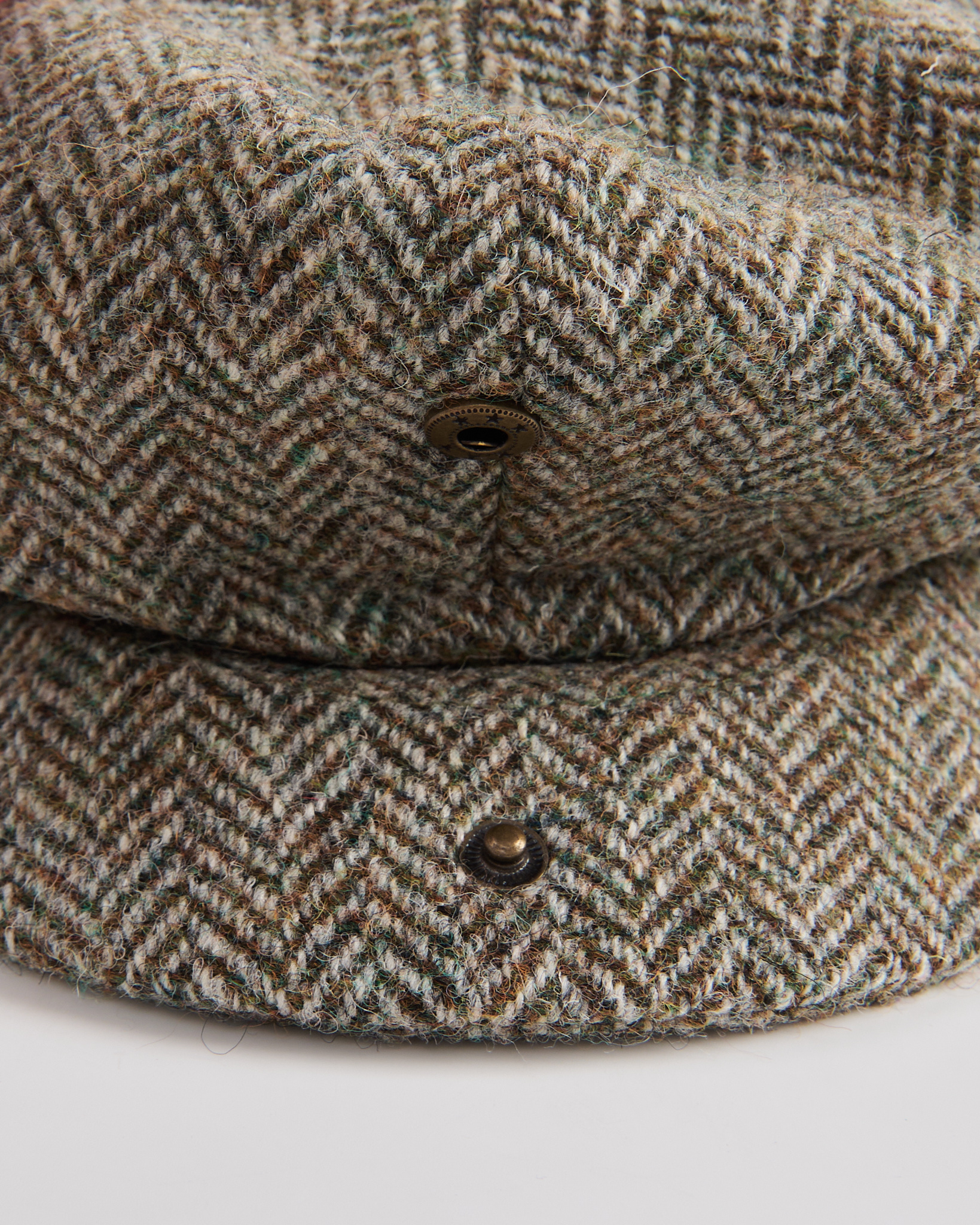 Кепка из плотной шерстяной ткани Harris Tweed. Выполнена в натуральной гамме с характерным ёлочным узором. Объёмная форма. Материал фактурный, слегка шероховатый, тёплый и плотный на ощупь. Внутри стёганая подкладка для дополнительного комфорта