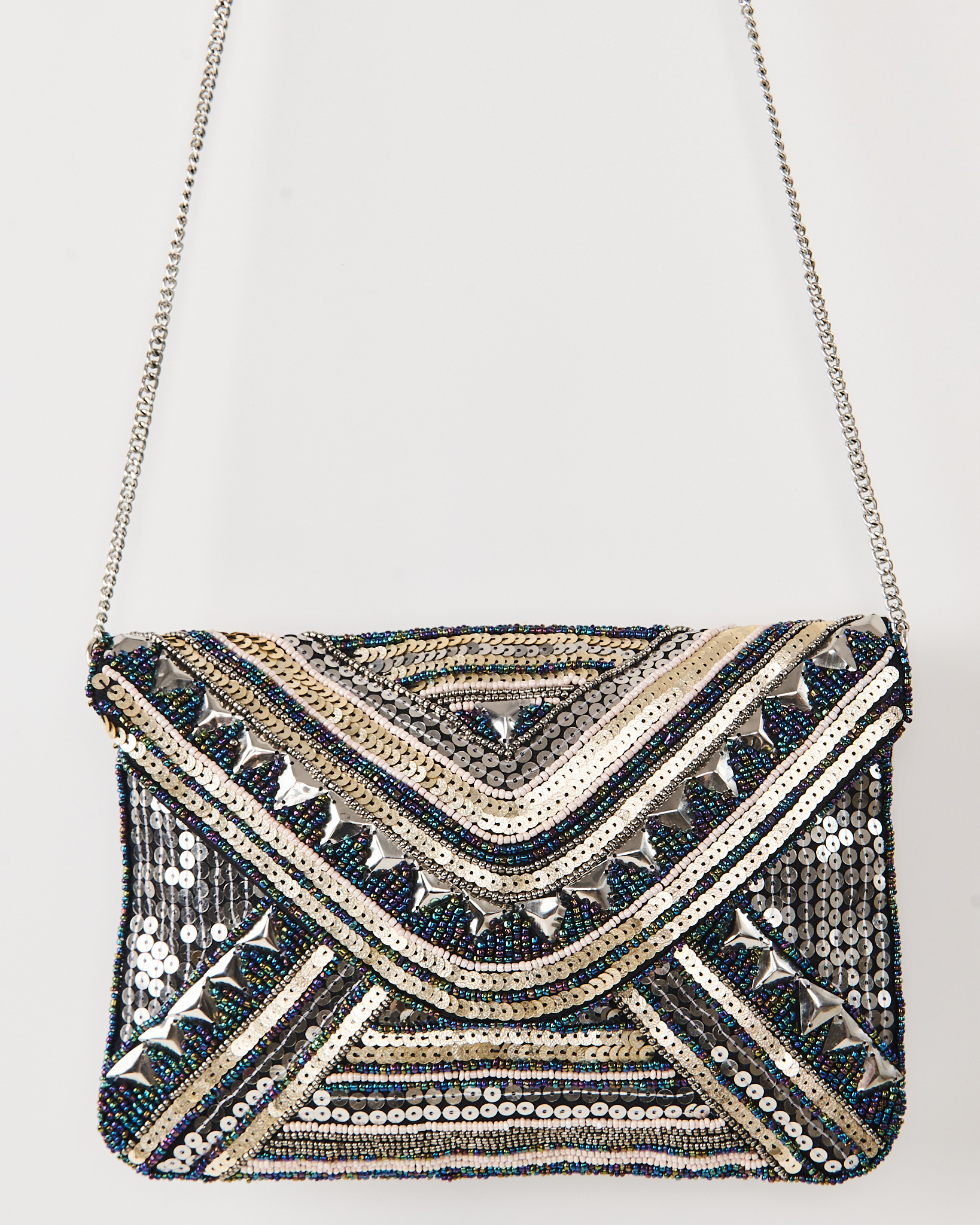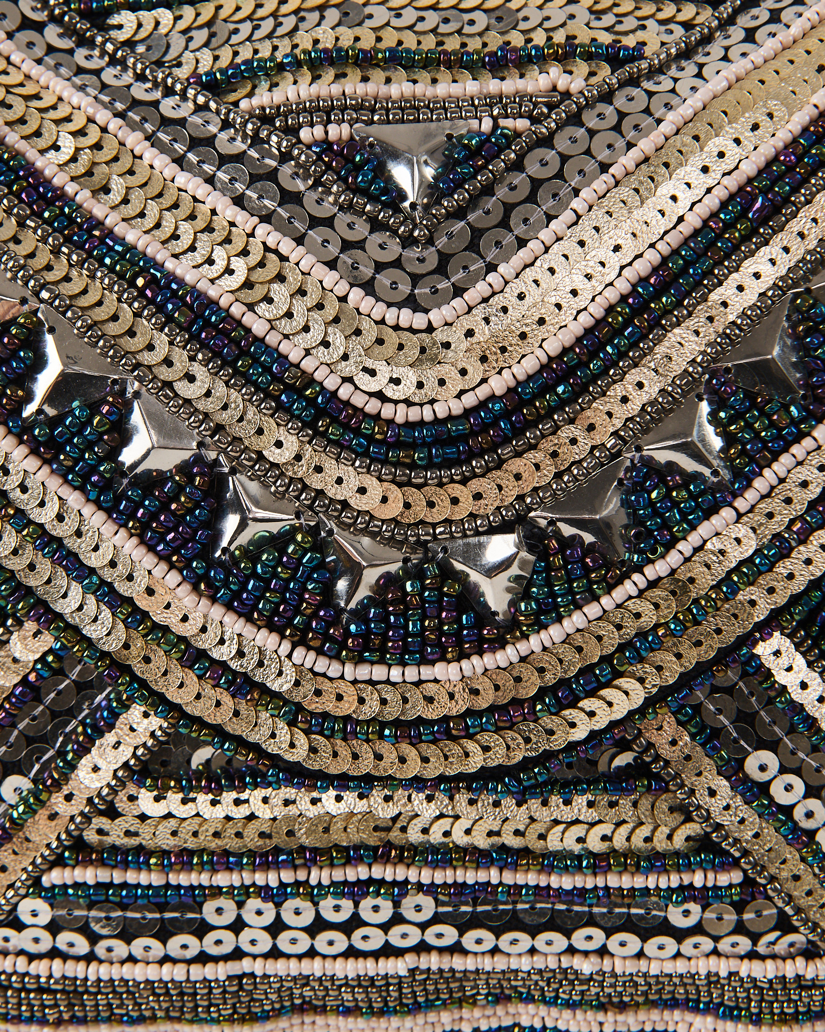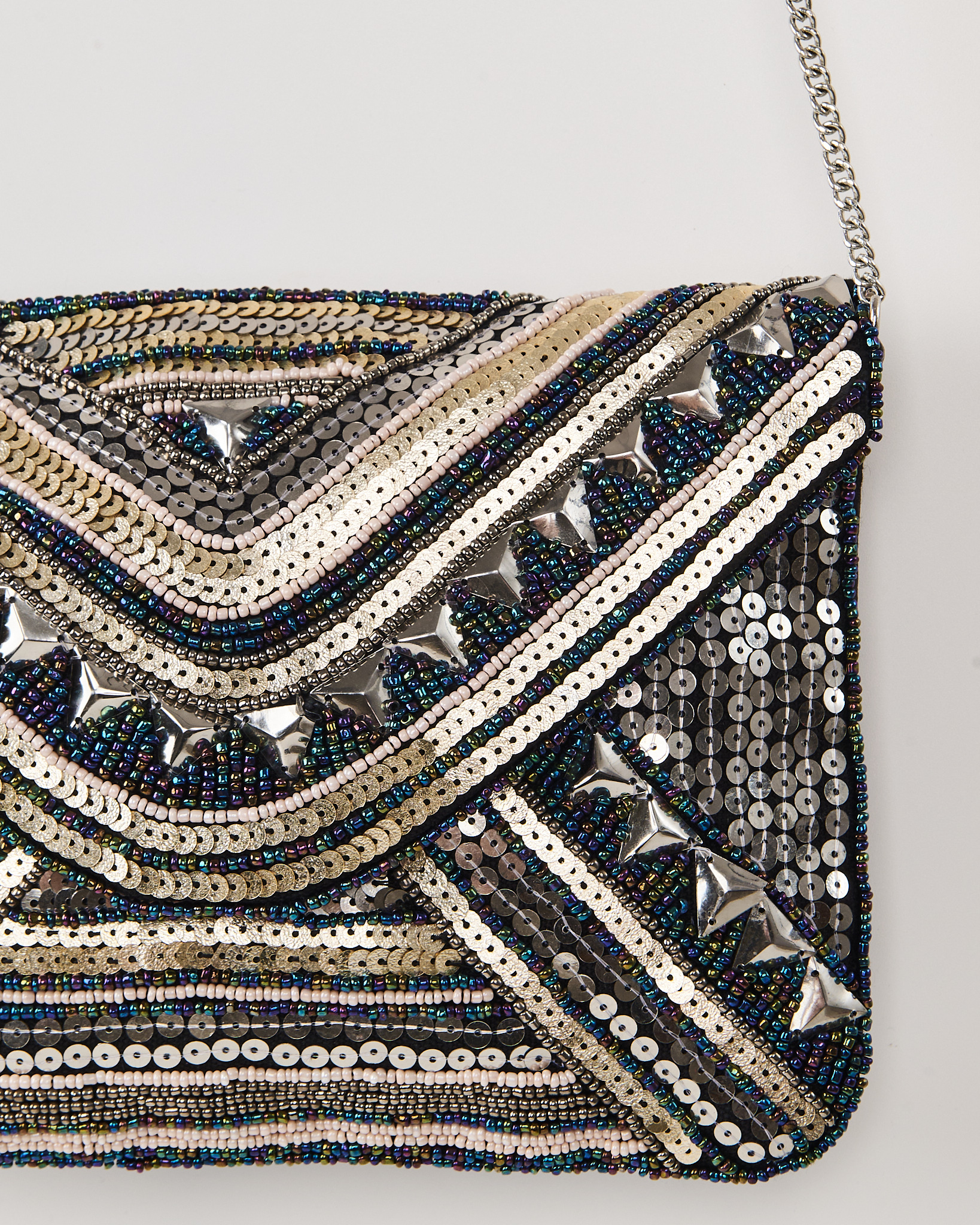 Винтажный клатч-конверт украшен пайетками и бисером. Геометрический узор. Металлическая цепочка-ремешок. Внутри дополнительный небольшой карман для мелочей.