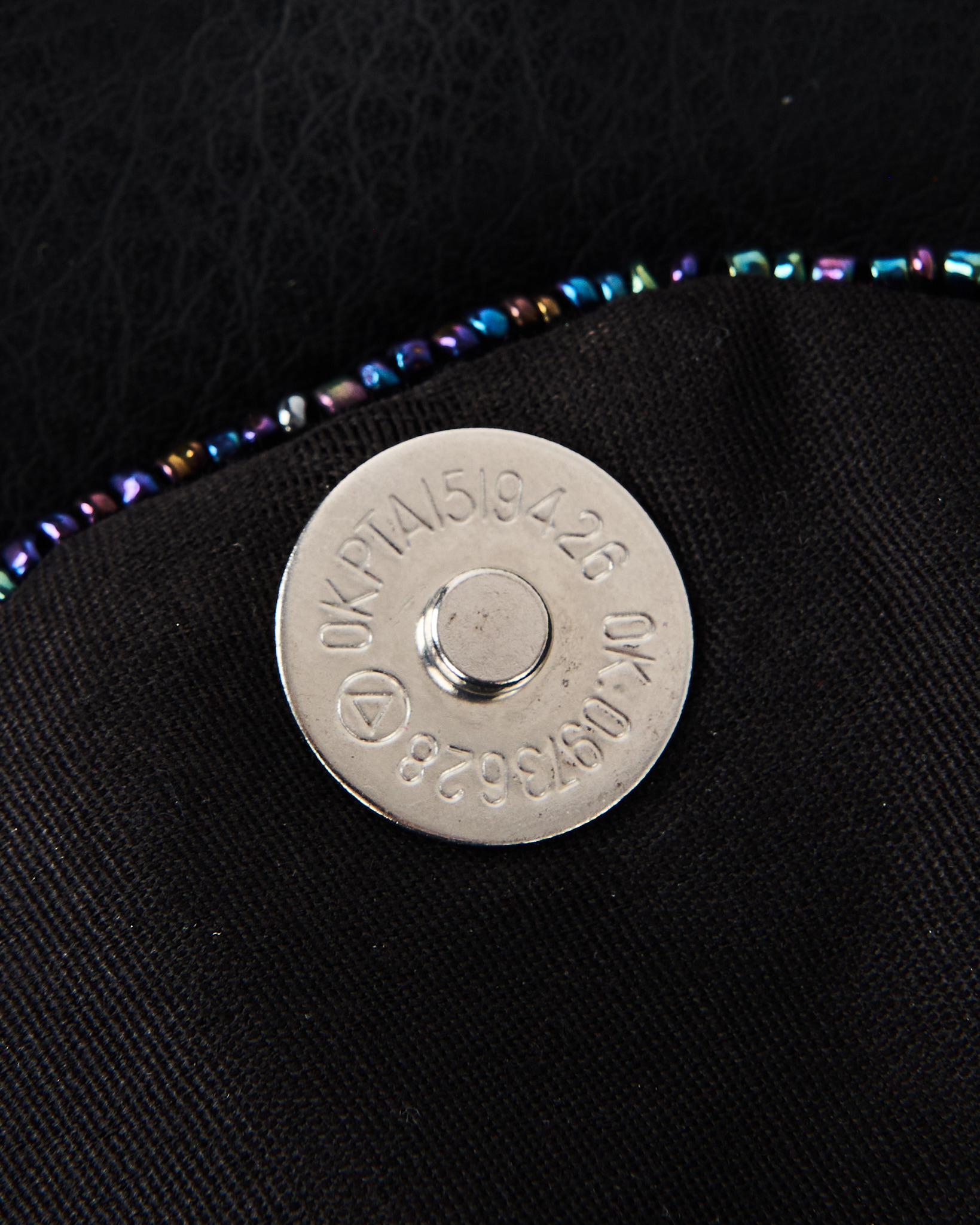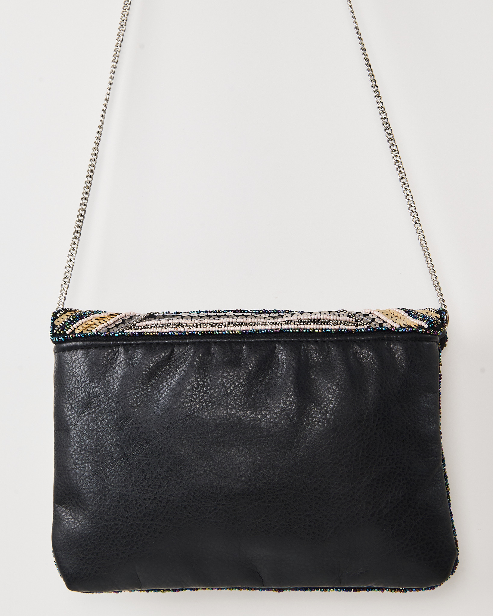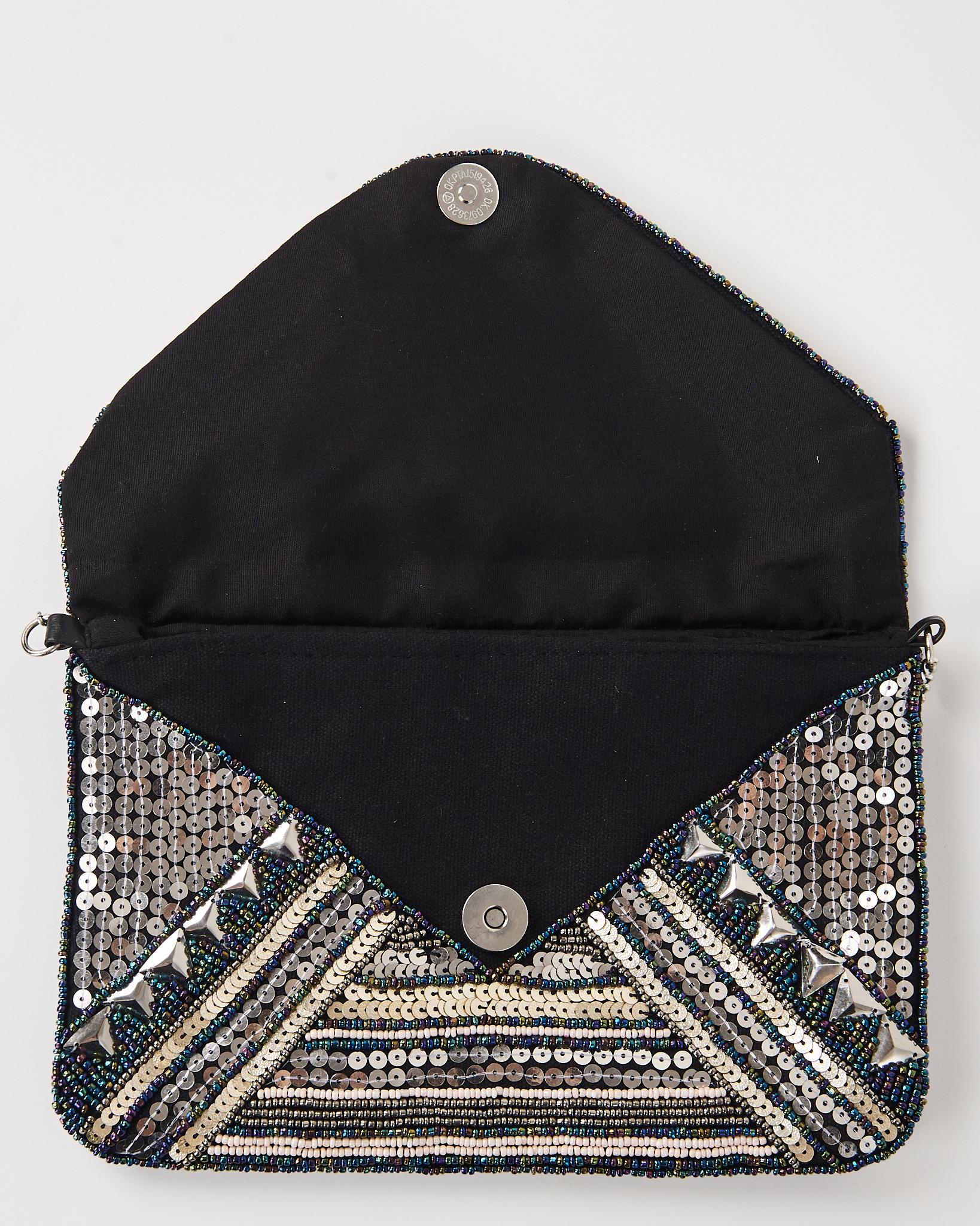 Винтажный клатч-конверт украшен пайетками и бисером. Геометрический узор. Металлическая цепочка-ремешок. Внутри дополнительный небольшой карман для мелочей.