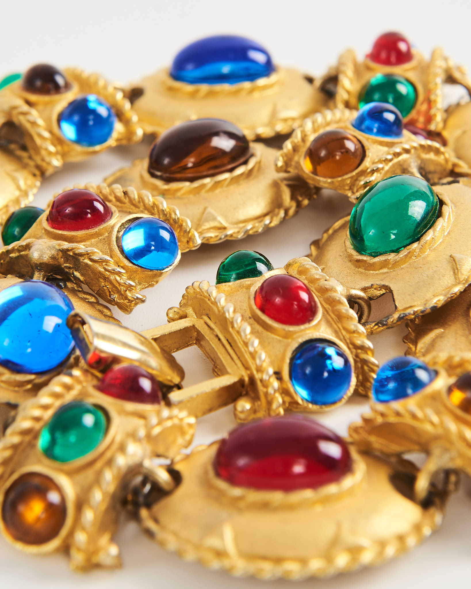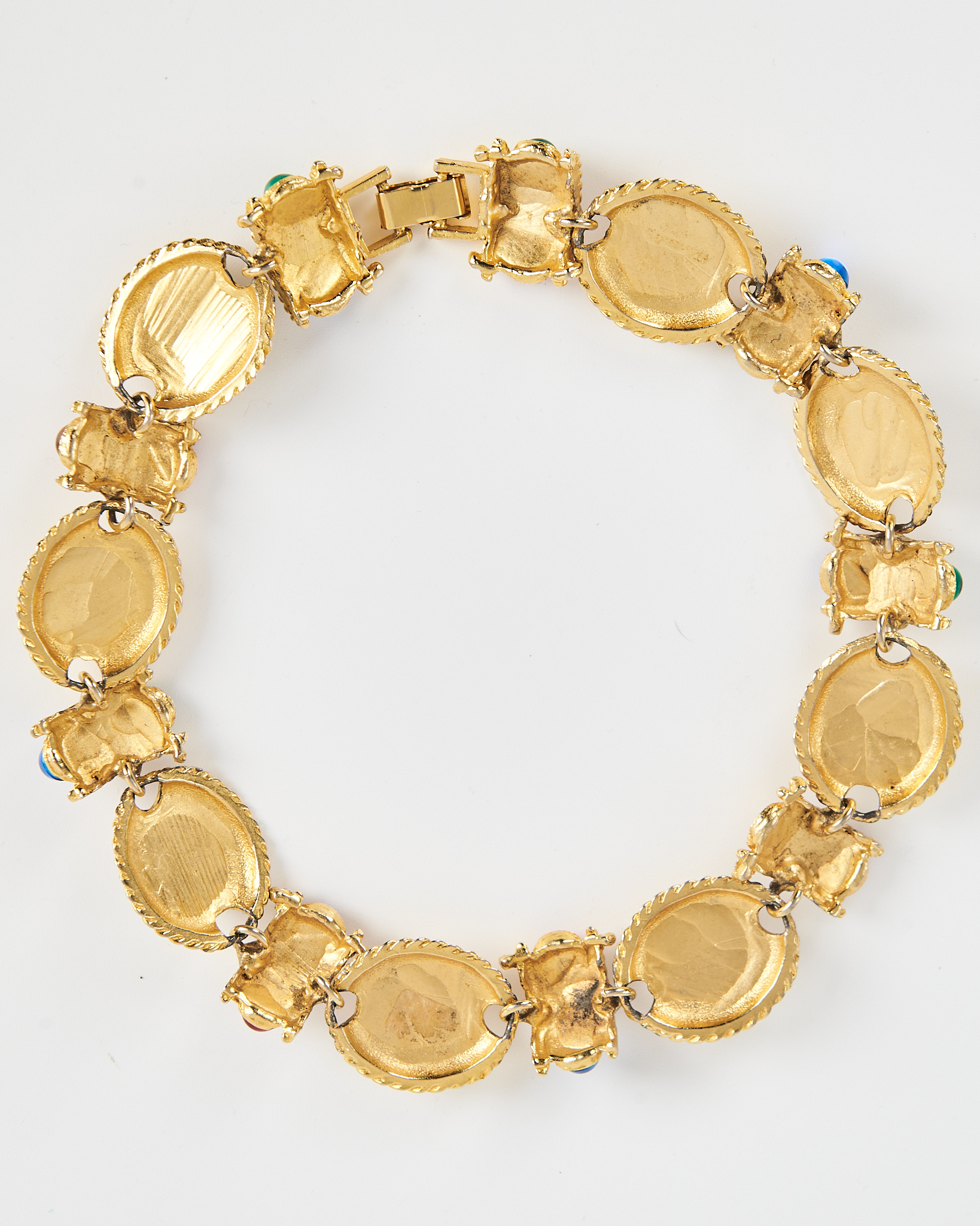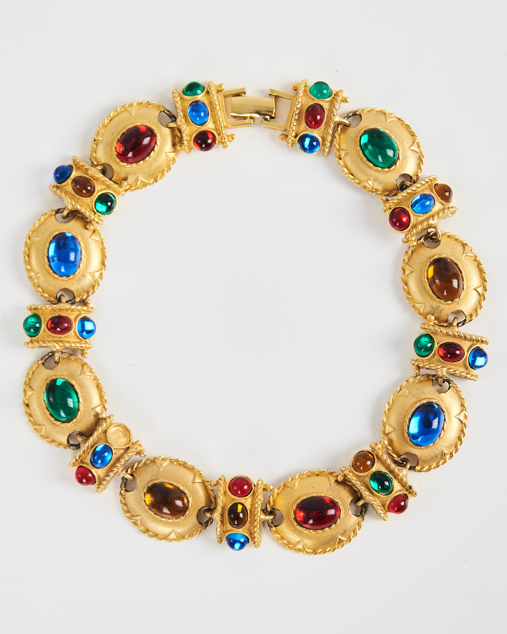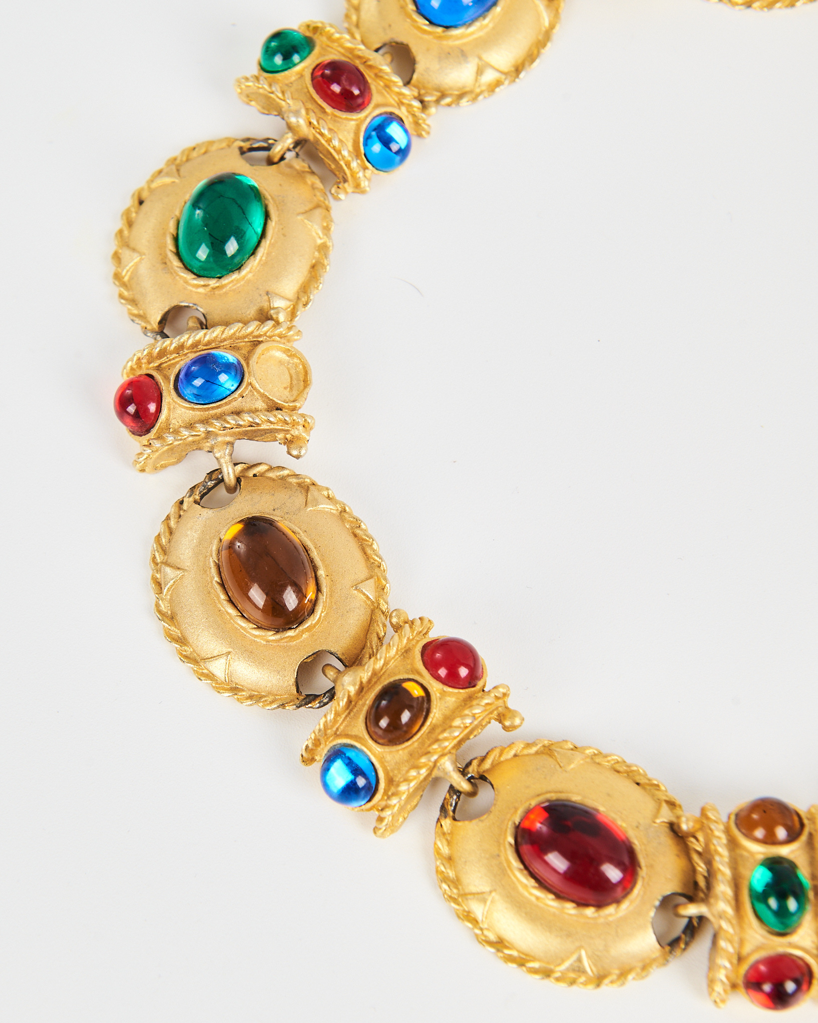 Колье с цветными вставками с золотистым покрытием и крупными цветными вставками. Посадка плотная, звенья гибко соединены, колье аккуратно повторяет линию шеи.