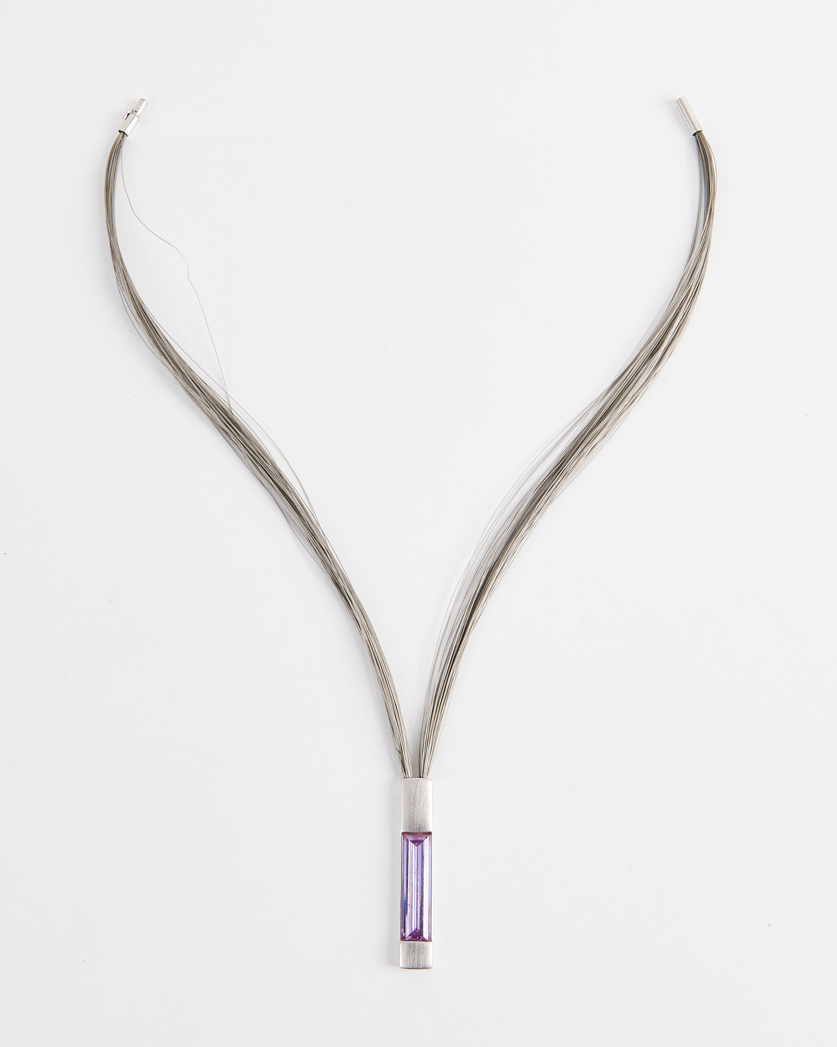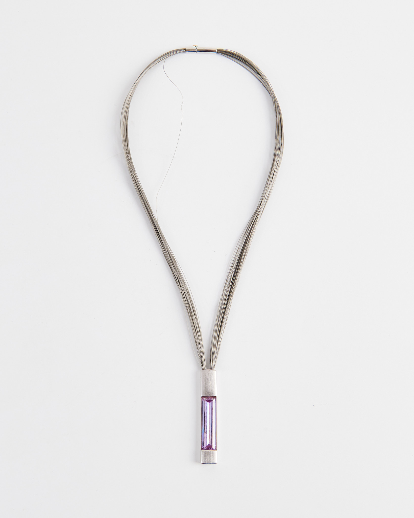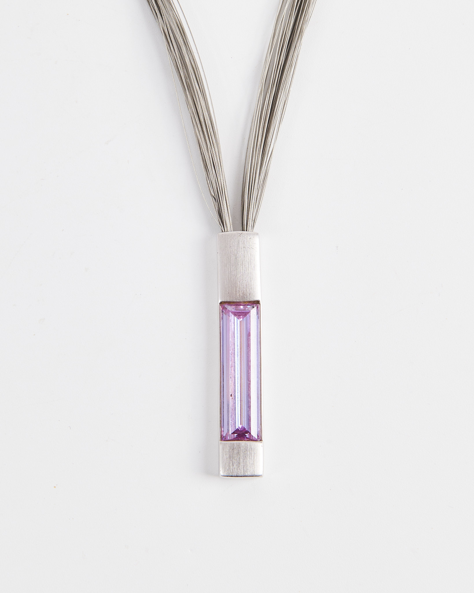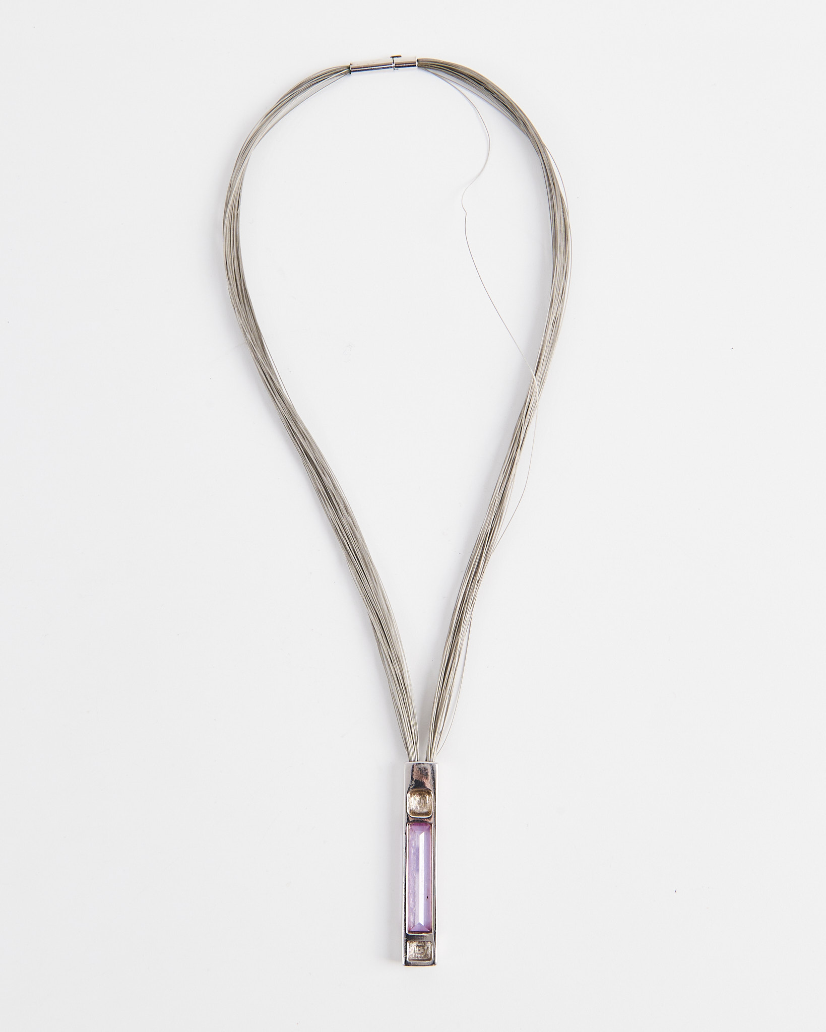 Колье из металла с подвеской прямоугольной формы и вставкой розового оттенка. Цепочка из множества тонких нитей мягко ложится по линии шеи. Удобная и надежная застежка.