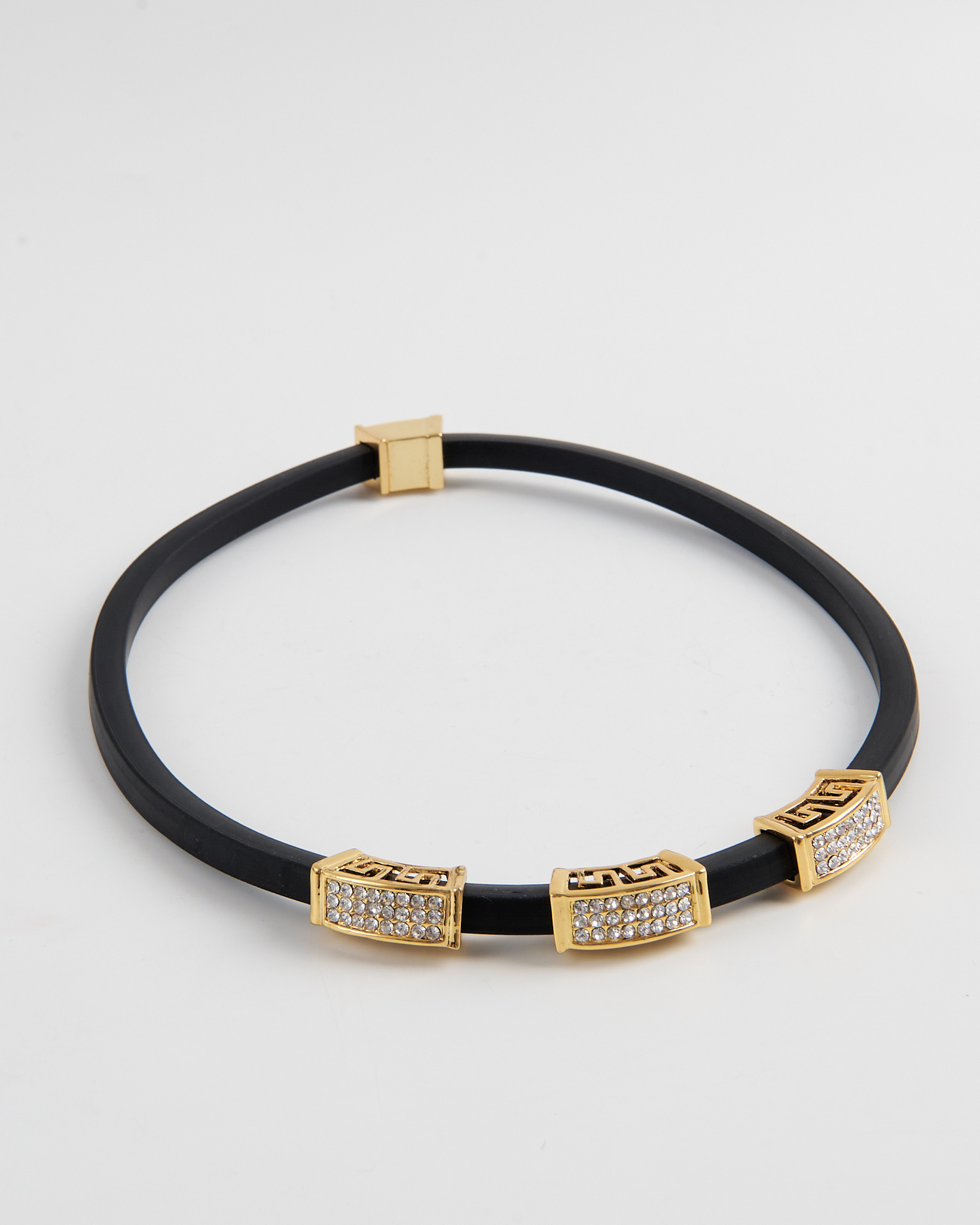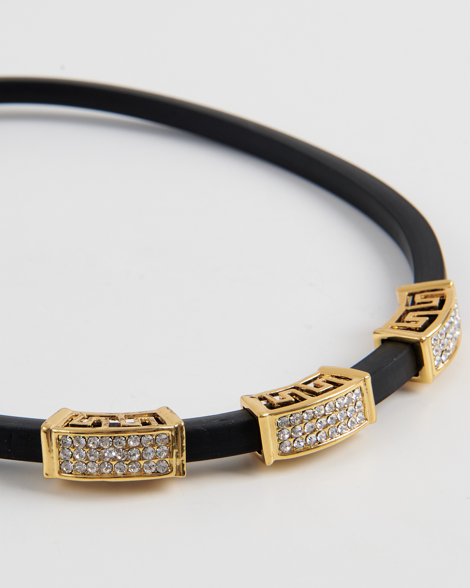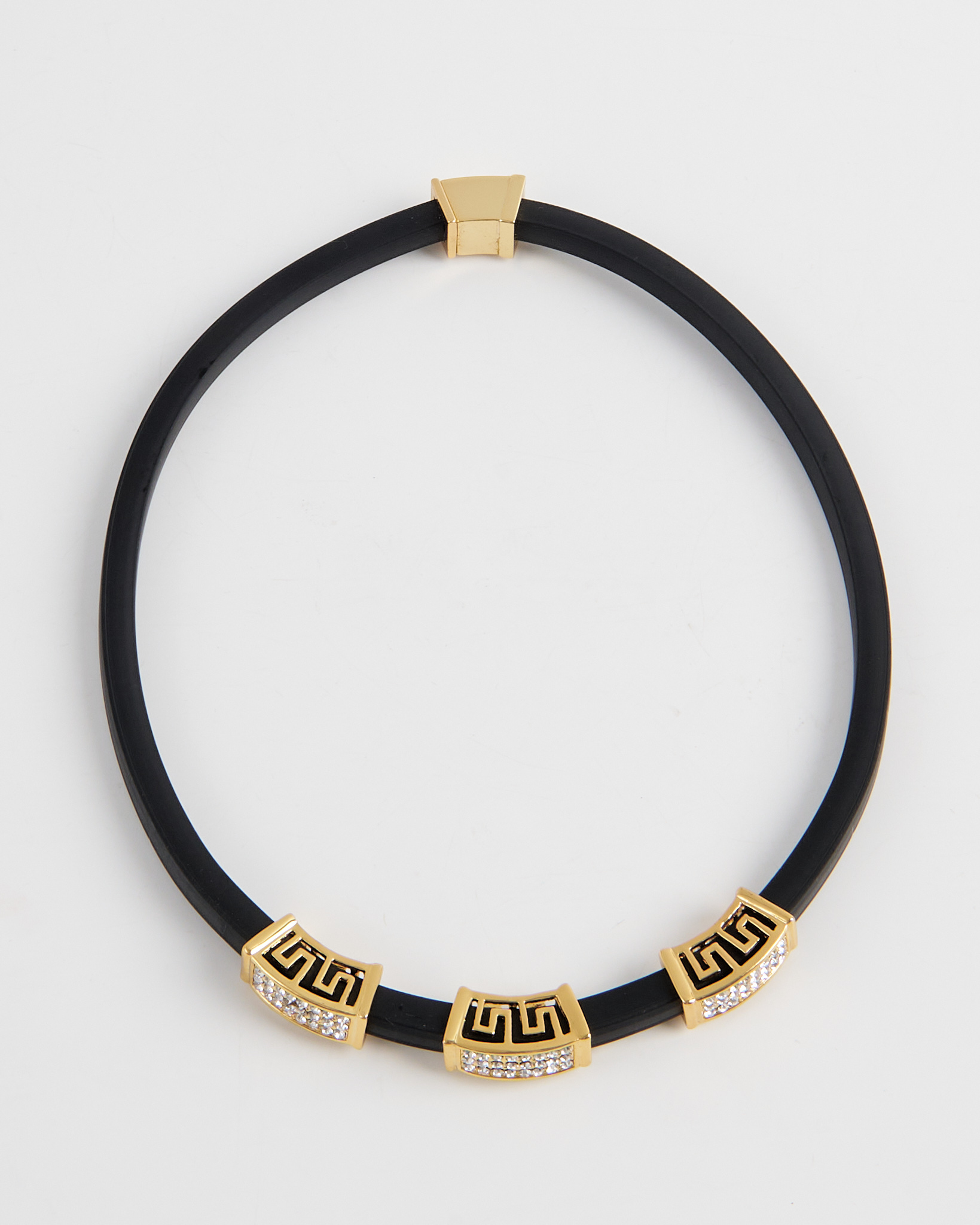 Колье из гибкого чёрного материала с металлическими вставками золотого оттенка. Комфортная посадка, удобная затсежка, декор с кристаллами и графическим орнаментом придает акцент.