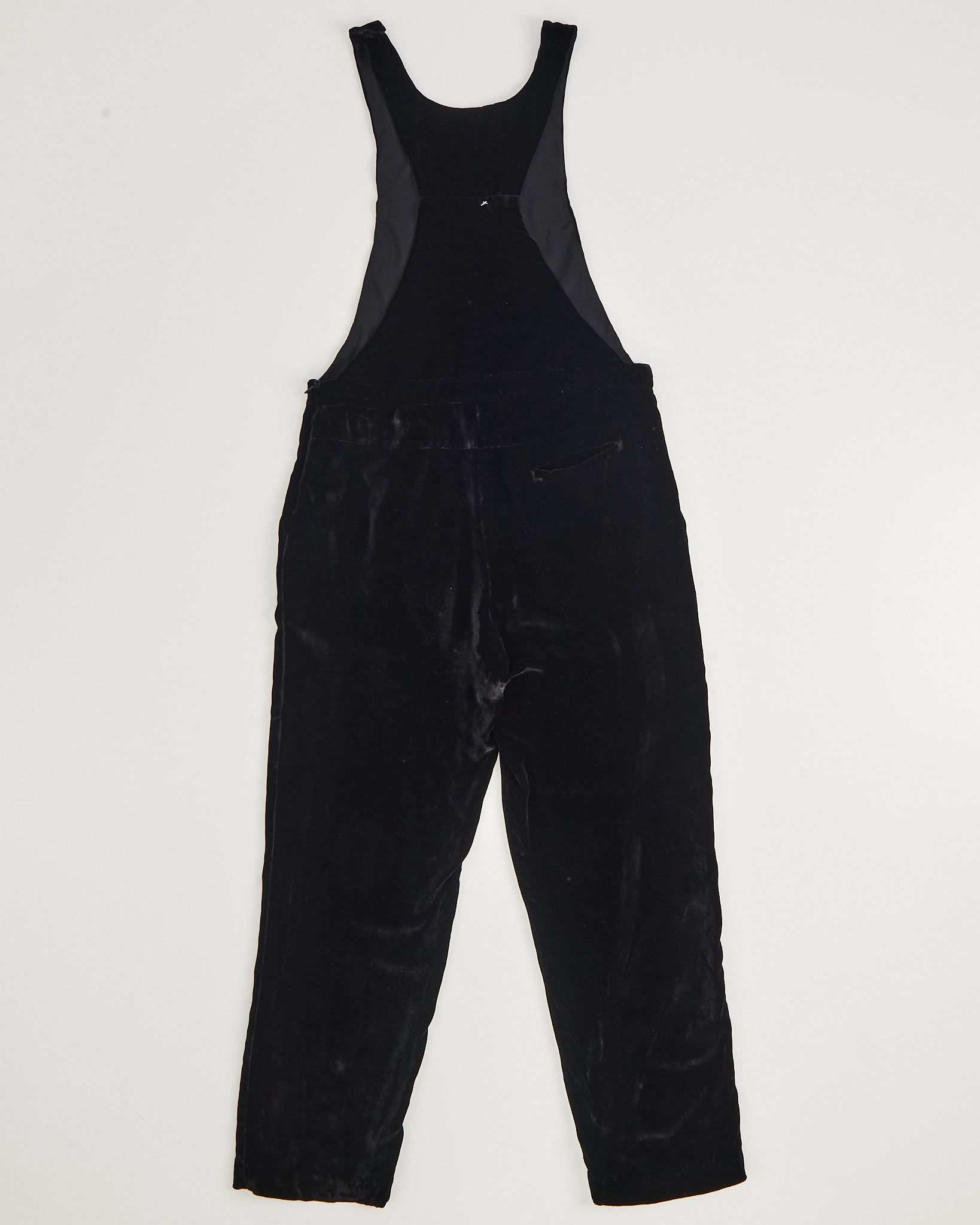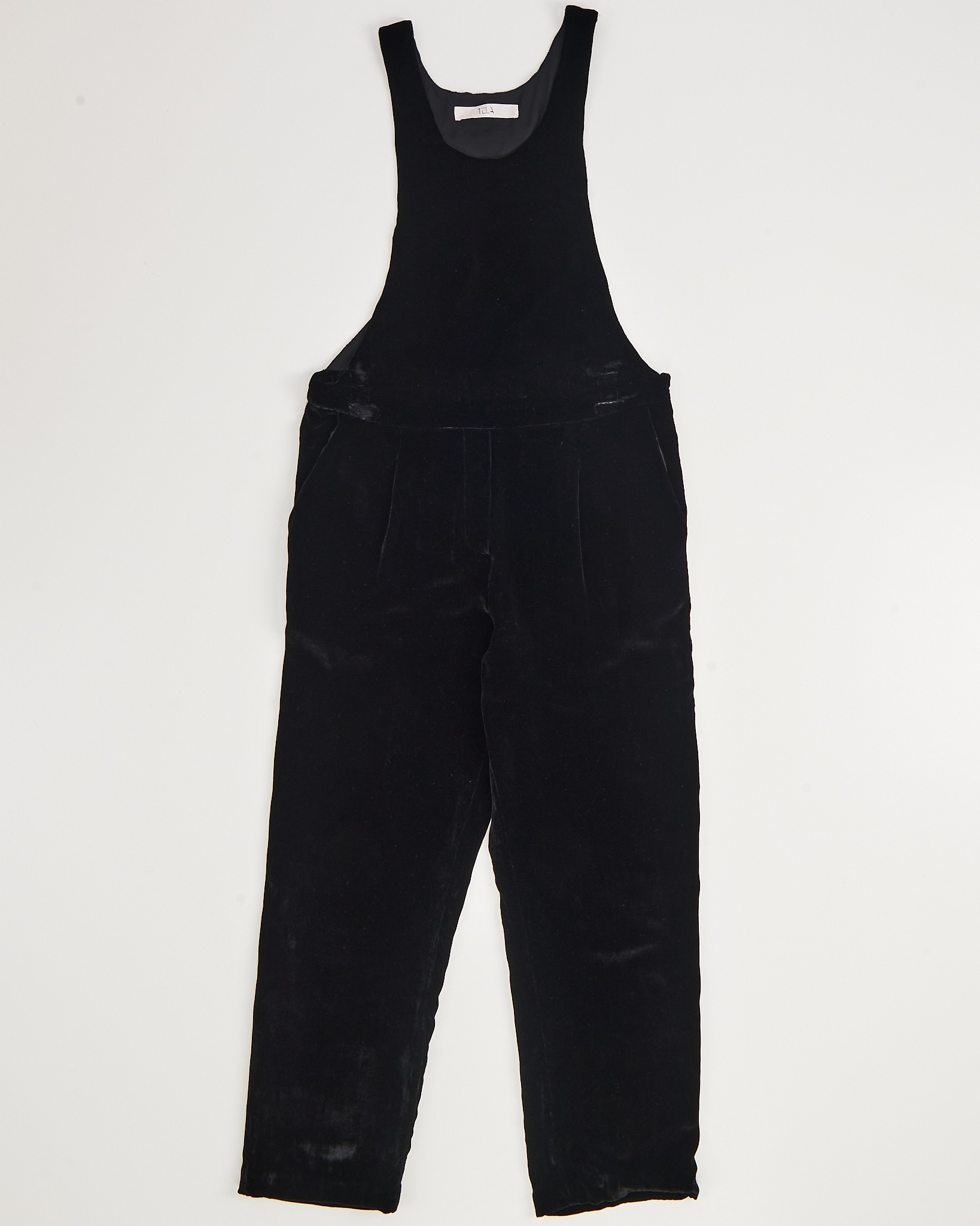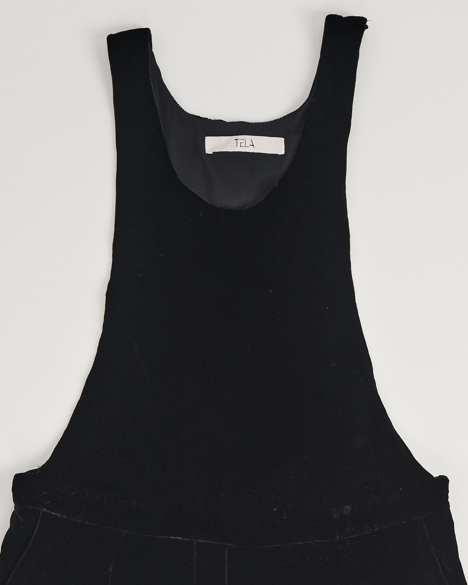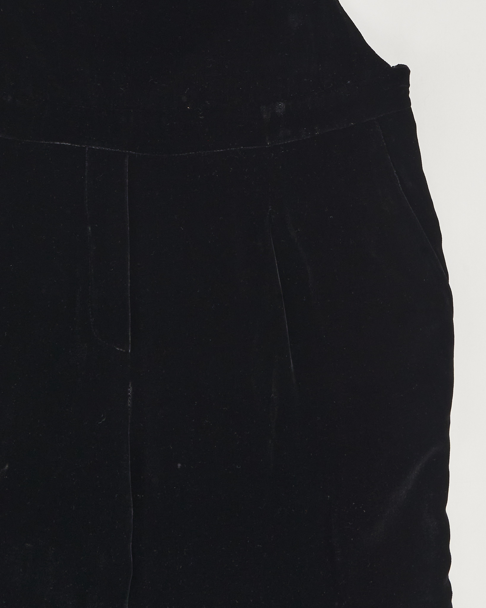 Комбинезон из бархатистого материала черного цвета. Аккуратные защипы на брюках. Два функциональных боковых кармана. Боковая застежка - молния