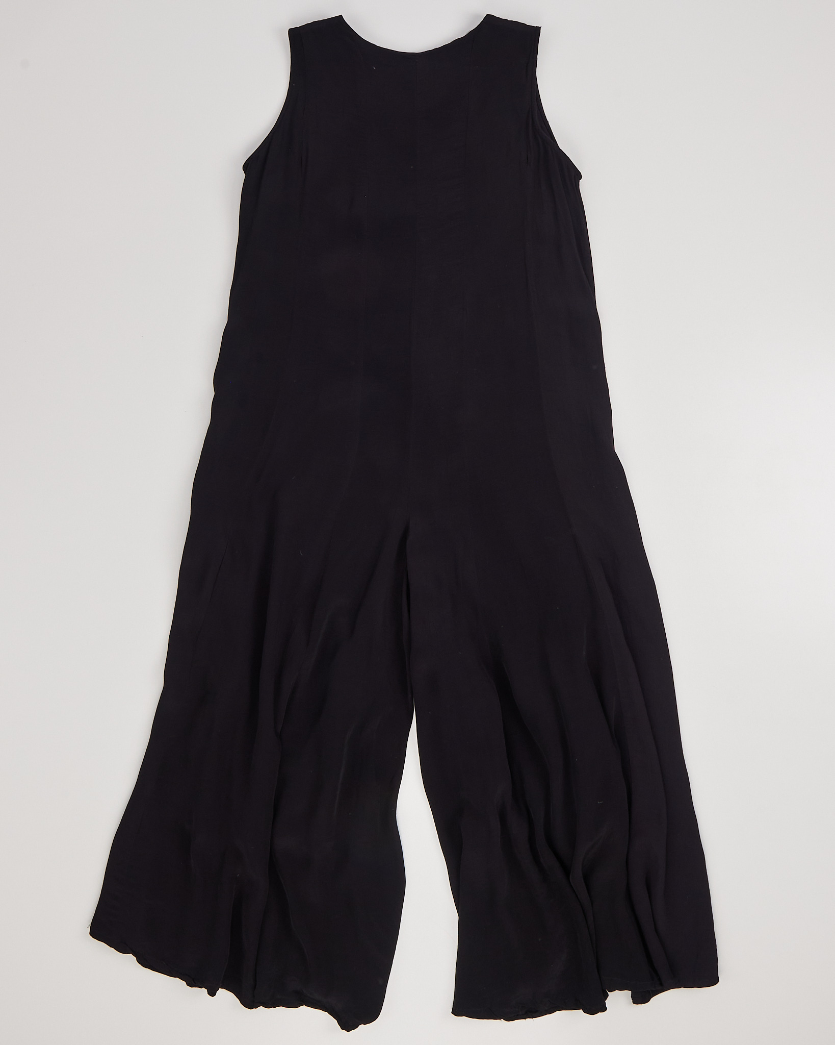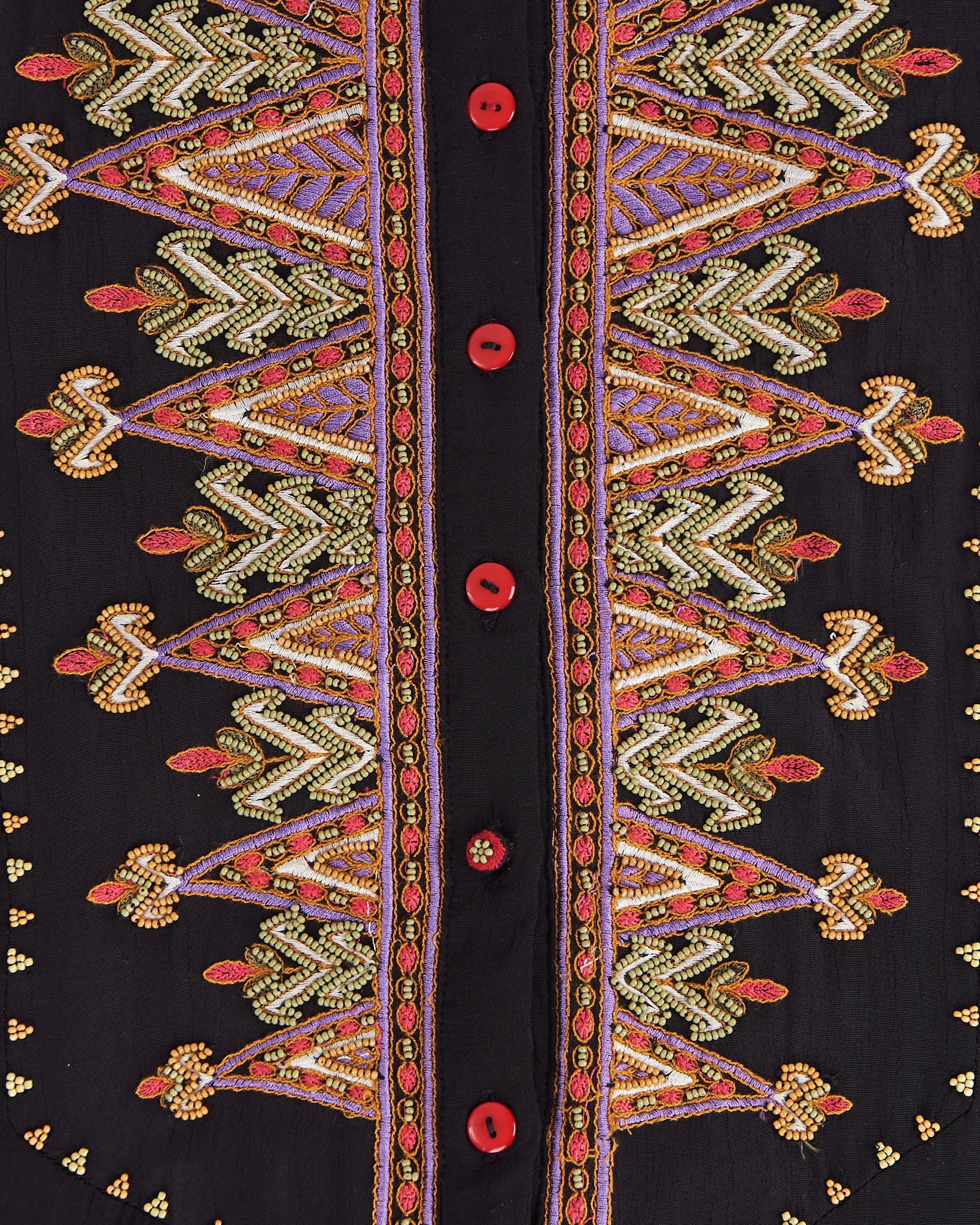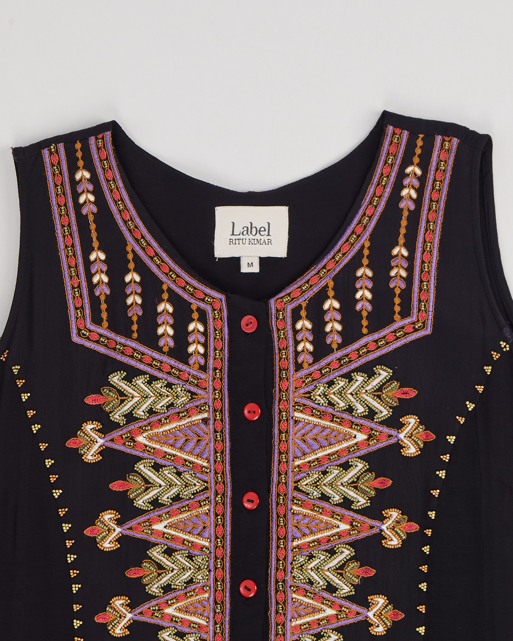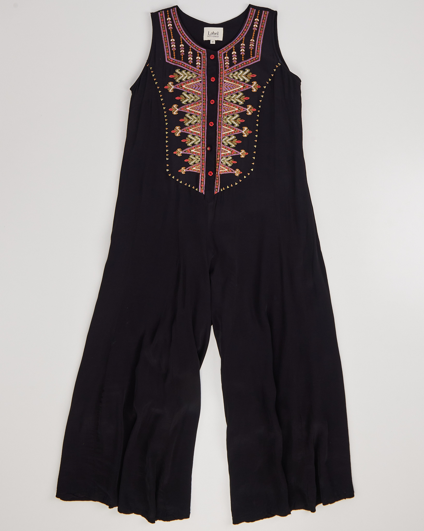 Комбинезон из лёгкой струящейся ткани от Label Ritu Kumar. Глубокий тёмный оттенок контрастирует с яркой вышивкой в этническом мотиве, создавая выразительный акцент в верхней части. Свободный силуэт с широкими брючинами