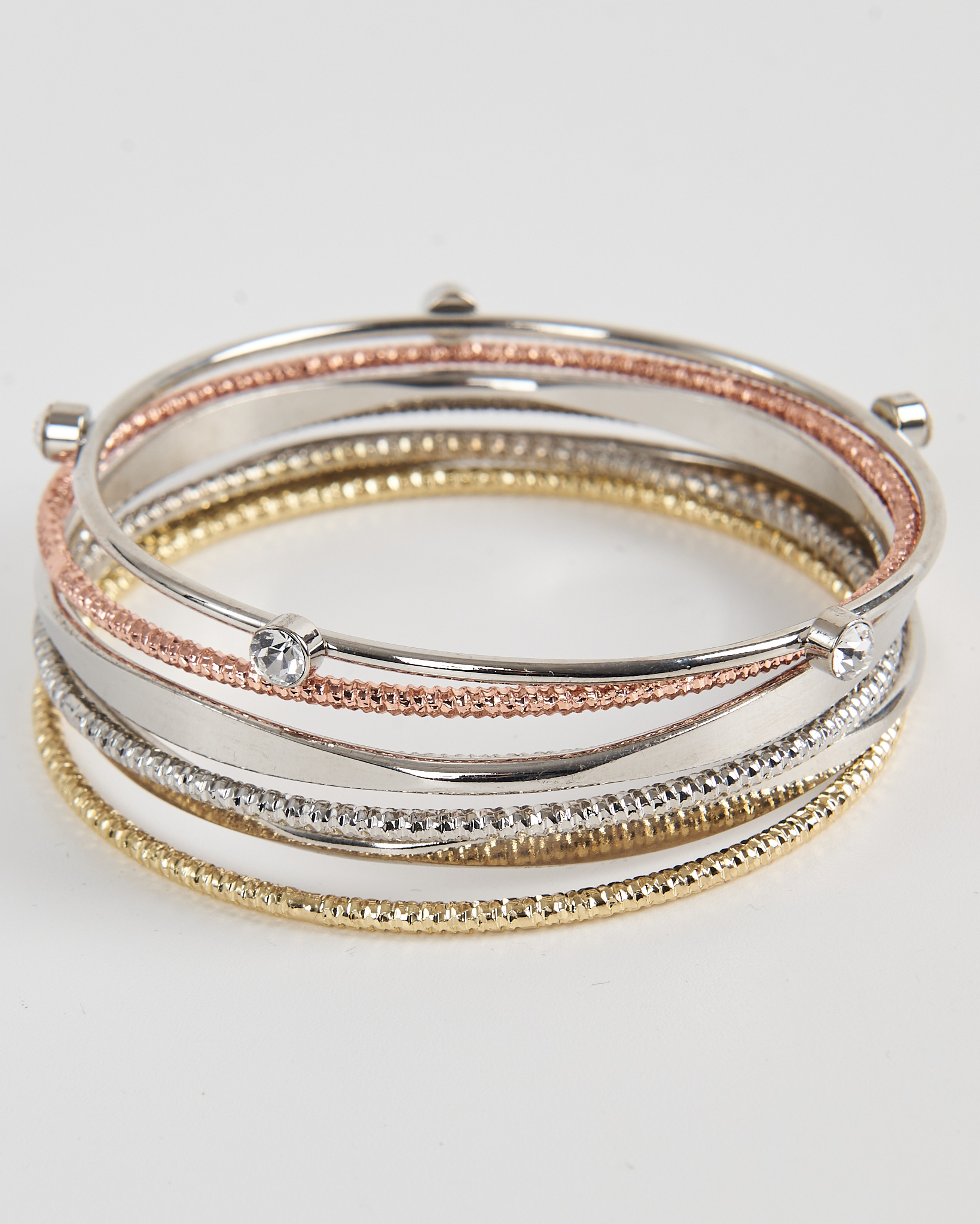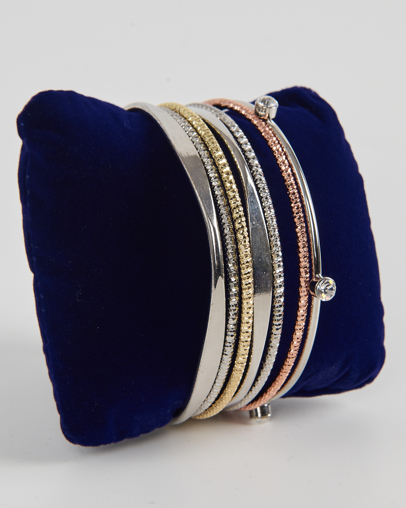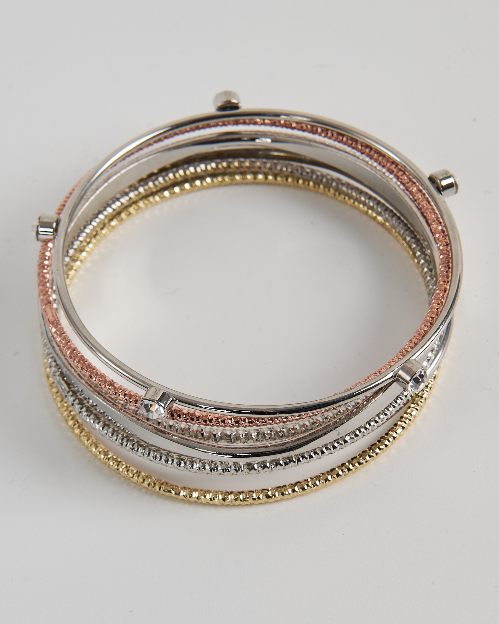 Браслет из металла в трёх оттенках: серебро, золото и розовое золото. Поверхность гладкая и фактурная. Декоративные вставки с кристаллами добавляют акцент.